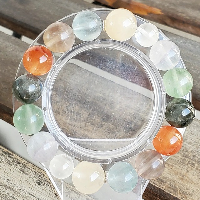 18種類のすべて異なる天然石で組んだブレスレットです ガーデンクォーツ 約12.5㎜ レモンクォーツ 約11.5㎜ ピンクエピドートインクォーツ 約12㎜ オーロラクォーツ 約10㎜ アラシャンアゲート 約11.5㎜ ケセラストーン 約12㎜ 北投石 約12㎜ ボツワナアゲート 約9.5㎜ スモーキークォーツ 約12㎜ ガーネットインヌーマイト 約11㎜ ブラックトルマリンインクォーツ 約8㎜ ホワイトブラックアクアマリン 約11.5㎜ ガーデンインアメジスト 約11.5㎜ レピドライト 約11.5㎜ イエローブルーフローライト 約12㎜ ドラゴンブラッドジャスパー 約10㎜ クリソコラ 約11.5㎜ ラビットヘアフローライト 約10㎜ 内径 約16.3cm ※着用後は毎回柔らかい布やティッシュ等で優しく汚れを拭き取ってください 514If