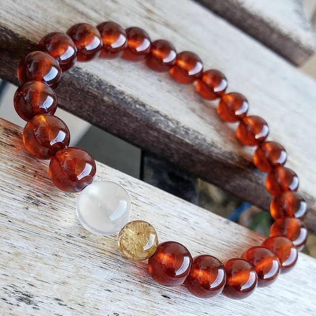 赤褐色~黄褐色のヘソナイトガーネット(オレンジガーネット)(灰礬柘榴石) 古来より、成功へ導く「勝利の石」として大切に扱われてきました さらに、マイナスエネルギーを払い、危機的状況を回避する効果が高く、魔除けの石としても人気があります ガーネットは実りの象徴とされ、生命力を高める石として知られています 半透明~乳白色の中にブルーやホワイトの輝き(ペリテリズム)が美しい、ペリステライト フェルドスパー(長石)に属するアルバイト(曹長石)の変種で、別名:アルバイト ムーンストーンとも呼ばれます 優しく穏やかな波動で、心身共に調和し、安らぎを与えるヒーリング効果が高く、さらに内面に秘めた才能を引き出し才能開花を導いてくれるともいわれています トルマリン(電気石)はストレス緩和や健康に効果があり、 マイナスエネルギーやネガティブ感情を取り除き、幸せや幸運を引き寄せるといわれています 中でもイエロートルマリンは、非常にポジティブなエネルギーを持ち、心身共に元気や活力を与え、幸福感を高めてくれるといわれています ヘソナイトガーネット 約8㎜×22 ペリステライト 約9㎜×1 イエロートルマリン 約7㎜×1 内径 約16cm