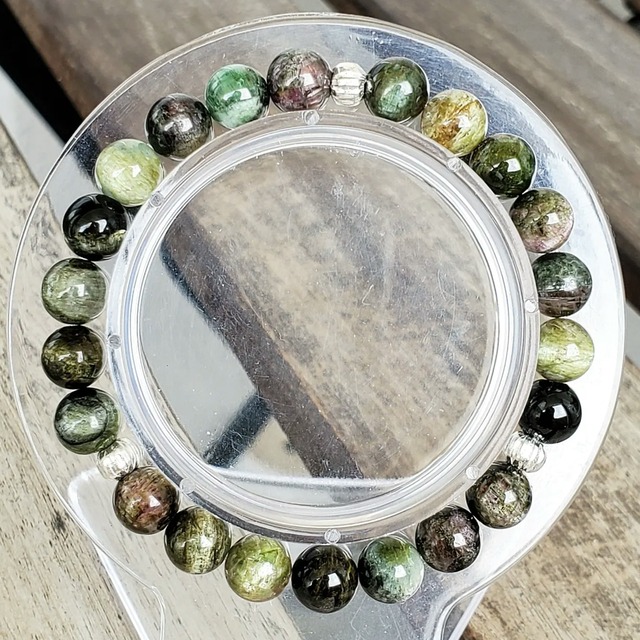 トルマリン(電気石)はストレス緩和や健康に効果があり、 マイナスエネルギーやネガティブ感情を取り除き、幸せや幸運を引き寄せるといわれています キャッツアイとは、キャッツアイ効果のことで、 反射された光が集まり線条に美しい白い光の帯が出現、 それが猫の目のように見えることから名付けられました このキャッツアイトルマリンは、グリーンが基調ですが、粒ごとに色の濃淡、色味も色味の混ざり具合もすべて異なり、とても美しく個性的です 特にピンクの混ざった粒は、何とも見事に綺麗です 古来より、シルバー(銀)は“聖なる月のエネルギー”を持つ神聖な金属とされ、純粋、無垢、さらに富や権力を象徴し、貨幣や装飾品や食器として大切に使用されてきました 落ち着いた波動で精神のバランスを整え、邪気や悪意を払う魔除けの効果も高いといわれています ※シルバーは汗や脂質、化粧品、クリーム、スプレー、洗剤、薬品、温泉、空気中の硫化水素などで黒ずんだり変色しやすいので、十分ご注意ください キャッツアイトルマリン 約7.5㎜~8㎜×22 カレンシルバー 約4㎜×約5㎜ ×3 内径 約16cm ※着用後は毎回柔らかい布やティッシュ等で汚れをやさしく拭き取ってください 87A21