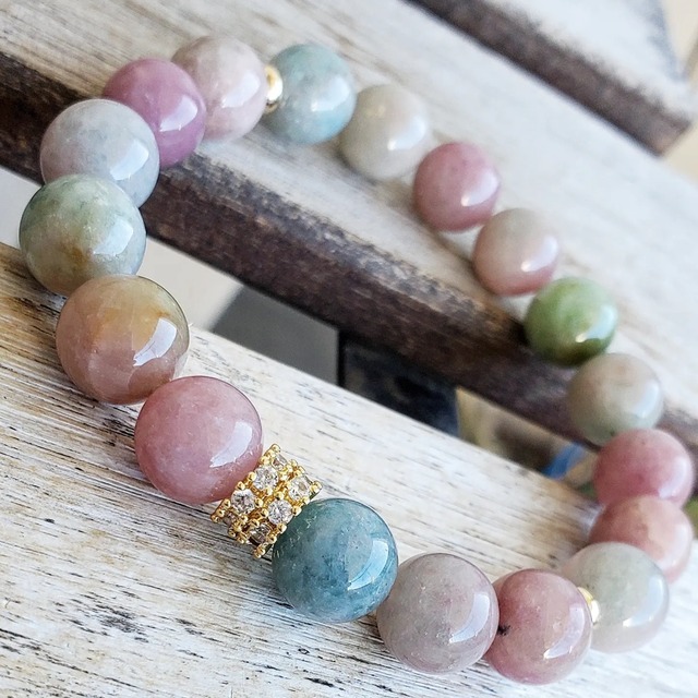 赤色~ピンク色のゾイサイトがチューライト(桃簾石) (青色~紫色のゾイサイトは、タンザナイトです) 「慈愛」「愛情」「癒し」「知性」の石といわれ、 母性を高めるので、女性性を象徴する石とされています トルマリンは精神的な保護を担ってくれるといわれ、 中でもブラックトルマリンは邪念やサイキックアタックや電磁波をカットする効果が高く、 ピンクトルマリンは恋愛面での保護、癒しに効果が高いといわれています ローズクォーツは「愛」と「癒し」の石といわれ、 やさしい波動を持っています 三種類のピンクの石を黒で引き締めたブレスレットです チューライト 約10㎜×5 ブラックトルマリン 約10㎜×5 ピンクトルマリンインクォーツ 約10.5㎜×5 ローズクォーツ 約8㎜×5 内径 約16.5cm ※着用後は毎回柔らかい布やティッシュ等で汚れを優しく拭き取って下さい 63F30