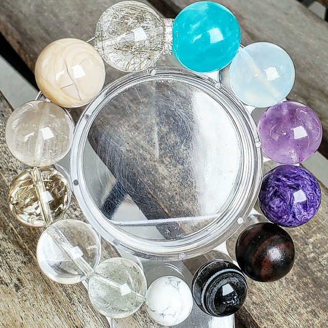 13種類のすべて異なる石で組んだブレスレットです 天然アイリスクォーツ 約16㎜ 日月星天珠(火供龍紋天珠) 約16㎜ ペリステライト 約15㎜ 天然オーラクォーツ 約15㎜ デンドライトインローズクォーツ 約15㎜ スモーキーレモンクォーツ 約15.5㎜ サゲニティッククォーツ 約16㎜ グリーンガーデンクォーツ 約15㎜ アラシャンアゲート 約15㎜ ラピスラズリ 約14.5㎜ アクアマリン 約15.5㎜ チャロアイト 約15㎜ エレスチャルアメジスト 約16㎜ シルバーパーツ(真鍮製)使用 内径 約16cm ※着用後は毎回柔らかい布やティッシュ等で優しく汚れを拭き取ってください 802IDD