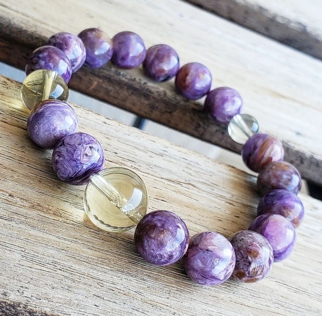 石英(クォーツ)に硫黄が混入することで黄色に発色するレモンクォーツ(檸檬水晶) 古来より、金運・健康運・癒しの石として知られています 浄化力が高く、精神や感情の起伏を穏やかに落ち着かせ、不安や混乱を抑える効果があるといわれています 独特な紫色のマーブル模様が美しいチャロアイト(チャロ石) エジリン(黒い部分)、マイクロクリン(白~灰色の部分)、ティナクサイト(茶~橙色の部分)などの複数の鉱物が混ざり合い形成されています 「変容の石」と呼ばれるチャロアイトは、高い波動を持ち、持ち主の不安や恐怖心を克服するのをサポート、癒しと浄化に長けた石といわれています ラリマー、スギライトと並ぶ世界三大ヒーリングストーンの一つです レモンクォーツ 約12㎜×1 約10㎜×1 約8㎜×1 チャロアイト 約10㎜×16 内径 約16cm ※着用後は毎回柔らかい布やティッシュ等で優しく汚れを拭き取ってください 920F341