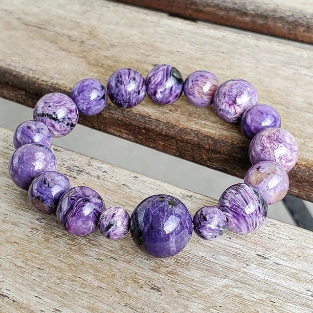 独特な紫色のマーブル模様が美しいチャロアイト(チャロ石) エジリン(黒い部分)、マイクロクリン(白~灰色の部分)、ティナクサイト(茶~橙色の部分)などの複数の鉱物が混ざり合い形成されています 「変容の石」と呼ばれるチャロアイトは、高い波動を持ち、持ち主の不安や恐怖心を克服するのをサポート、癒しと浄化に長けた石といわれています ラリマー、スギライトと並ぶ世界三大ヒーリングストーンの一つです チャロアイトに混ざる黒い部分は、最強の魔除けとして知られる“エジリン(アクマイト)”という別の鉱物で、マイナス(ネガティブ)エネルギーを寄せ付けずはね除け、断ち切り、強力な浄化作用を持つといわれています 今回のチャロアイトは、黒いエジリンが少し混ざったタイプを選び、チャロアイト本来の癒し効果に、魔除け効果もプラスしました チャロアイト 約8㎜~約15㎜ ×17 内径 約16cm ※着用後は毎回柔らかい布やティッシュ等で優しく汚れを拭き取ってください 612A177