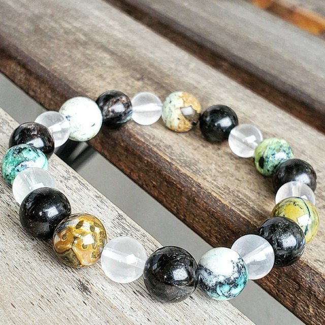 太古の昔30億年前には形成されており「創世記の石」とも呼ばれるヌーマイト ところどころにあるブルーやグリーンの輝きが美しく、赤紫色はガーネットが共生している部分です 心身のバランスを整え、癒し、活性化し、魔除けや厄除けにも効果があるといわれています 内モンゴル地区の砂漠で採取されるアラシャンアゲート(阿拉善瑪瑙) 別名・ゴビアゲート 火山の溶岩の中の小さな気泡(隙間)に石英(シリカ)が染み込み形成、 その溶岩が永い年月をかけ風化し、溶岩部分がとれ、瑪瑙として誕生します 地球からの「大いなる贈り物」といわれています アゲート(瑪瑙)は総合的に運気をアップし、富や長寿、健康、家内安全のお守りや邪気祓い、魔除けとしてよく用いられています アクアマリンは、古来より「天使の石」「幸福の石」「不老の石」とされ大切に扱われてきました 不安を解消し、混乱を鎮め、知性や勇気、冷静さをもたらす効果があるといわれています 石英の微細な結晶粒が集まり塊状になった、独特の半透明感がとても魅力的なカルセドニー(玉髄) 穏やかで優しい波動を持つカルセドニーは、持ち主のコミュニケーション能力を高め、緊張を緩和し、人間関係を円滑にしてくれるとされ、リラックスを促し、寛容さと寛大さをもたらす石といわれています カルセドニーを母岩ごとビーズにしたものが、母岩付きカルセドニーです(母岩とカルセドニーの硬度が違うので、キレイに仕上げるのが難しいそうです) アイリスクォーツとは、水晶内にクラックや歪みがあり、その部分が光を反射する際にキラキラ虹色の輝きを放つ水晶のことで、虹入り水晶やレインボークォーツとも呼ばれます 幸運をもたらし、運気を高め、浄化やヒーリングにも効果があるといわれています ガーネットインヌーマイト 約14㎜×3 アラシャンアゲート 約14㎜×3 ブルーグリーンアクアマリン 約14㎜×2 母岩付カルセドニー 約14㎜×3 スノーアイリスクォーツ 約14㎜×3 シルバーパーツ(真鍮製)使用 内径 約16cm ※着用後は毎回柔らかい布やティッシュ等で優しく汚れを拭き取ってください 613F225