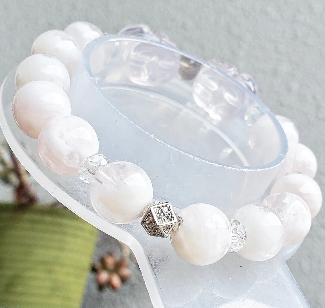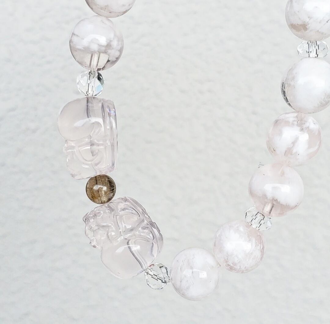 純白なセリサイト(絹雲母)が桜吹雪のように、ほんのりピンク色のローズクォーツに内包されたセリサイトインローズクォーツ