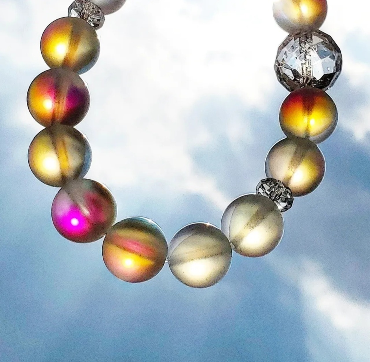 ルナフラッシュ(夜光石)は、ガラスの内部にオーロラフィルムや樹脂を特殊で繊細な技術技法で封入して作られた人工石(人工ガラス)です