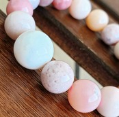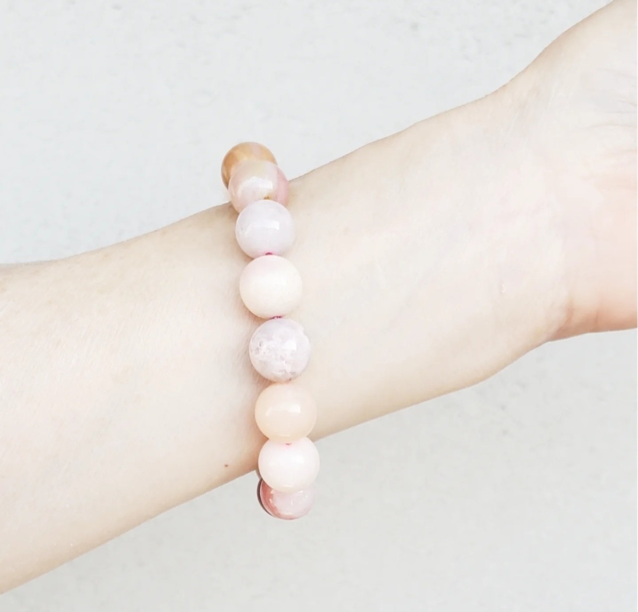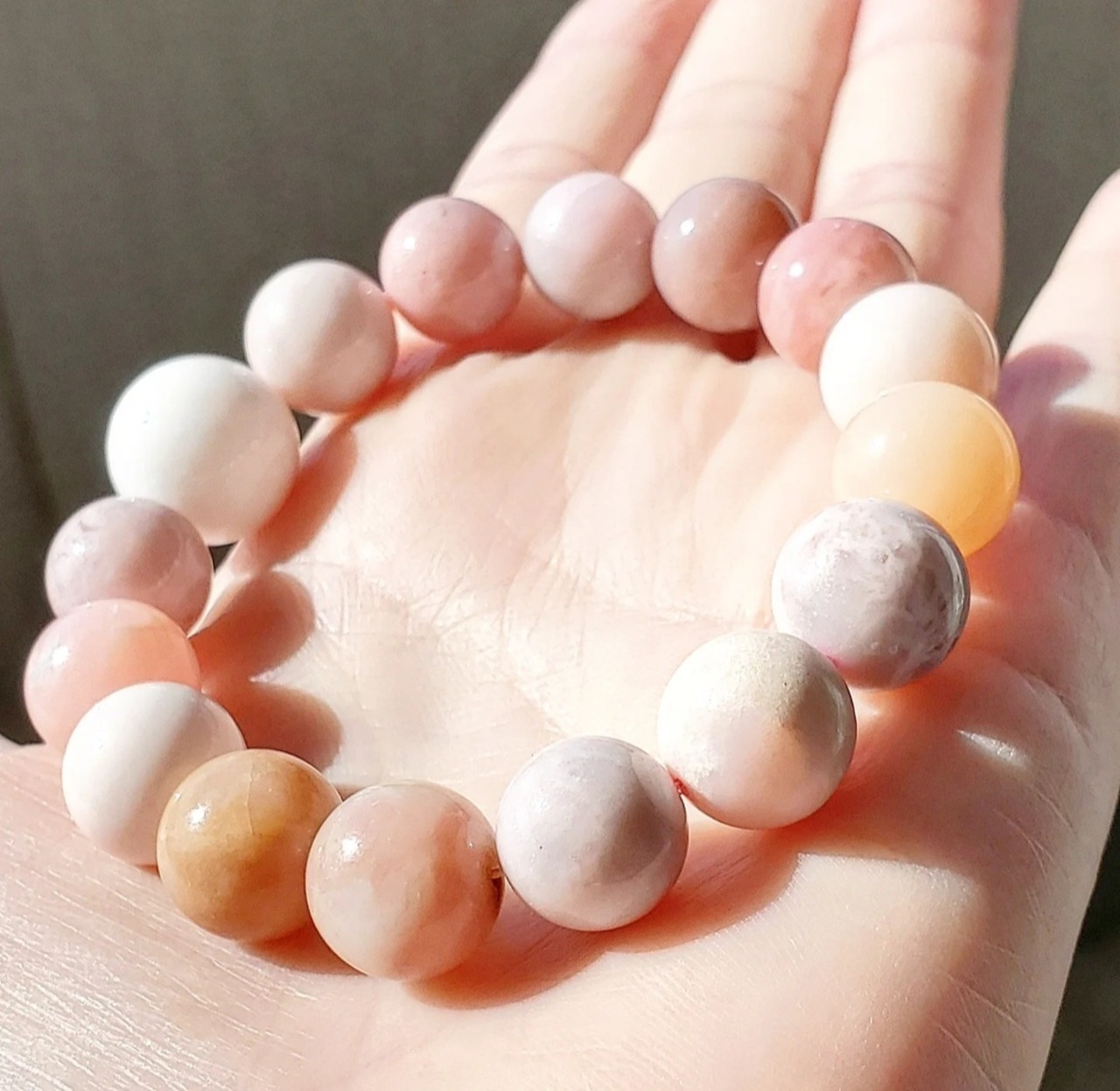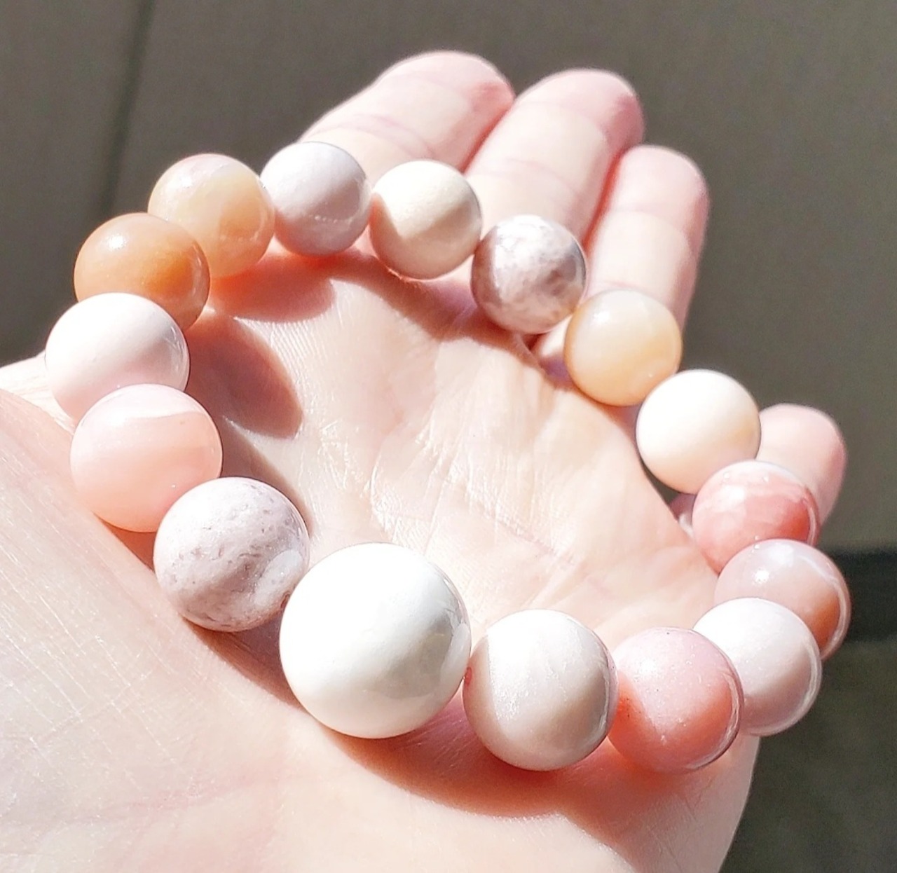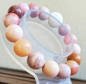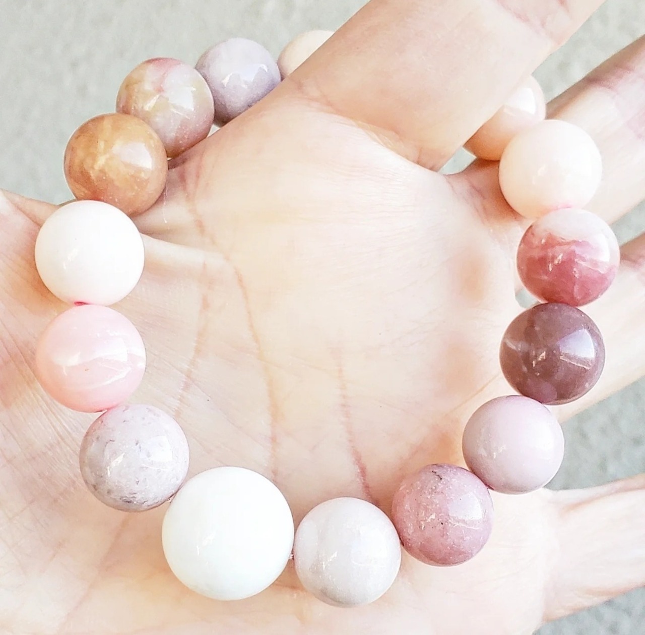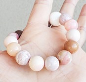 15㎜の大玉のホワイトオパールを筆頭に、様々な色味や模様のピンク系オパールで組んだブレスレットです