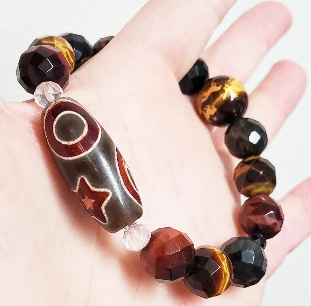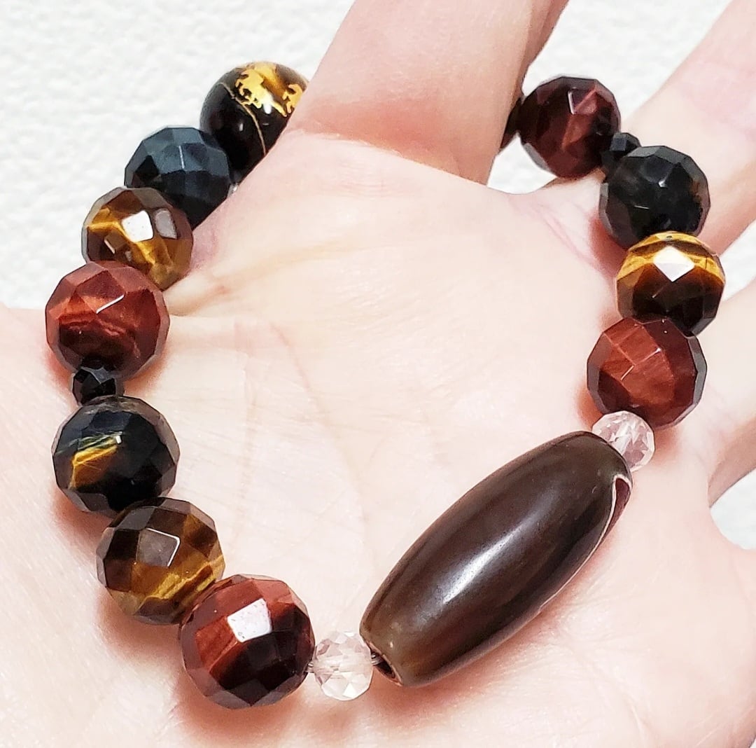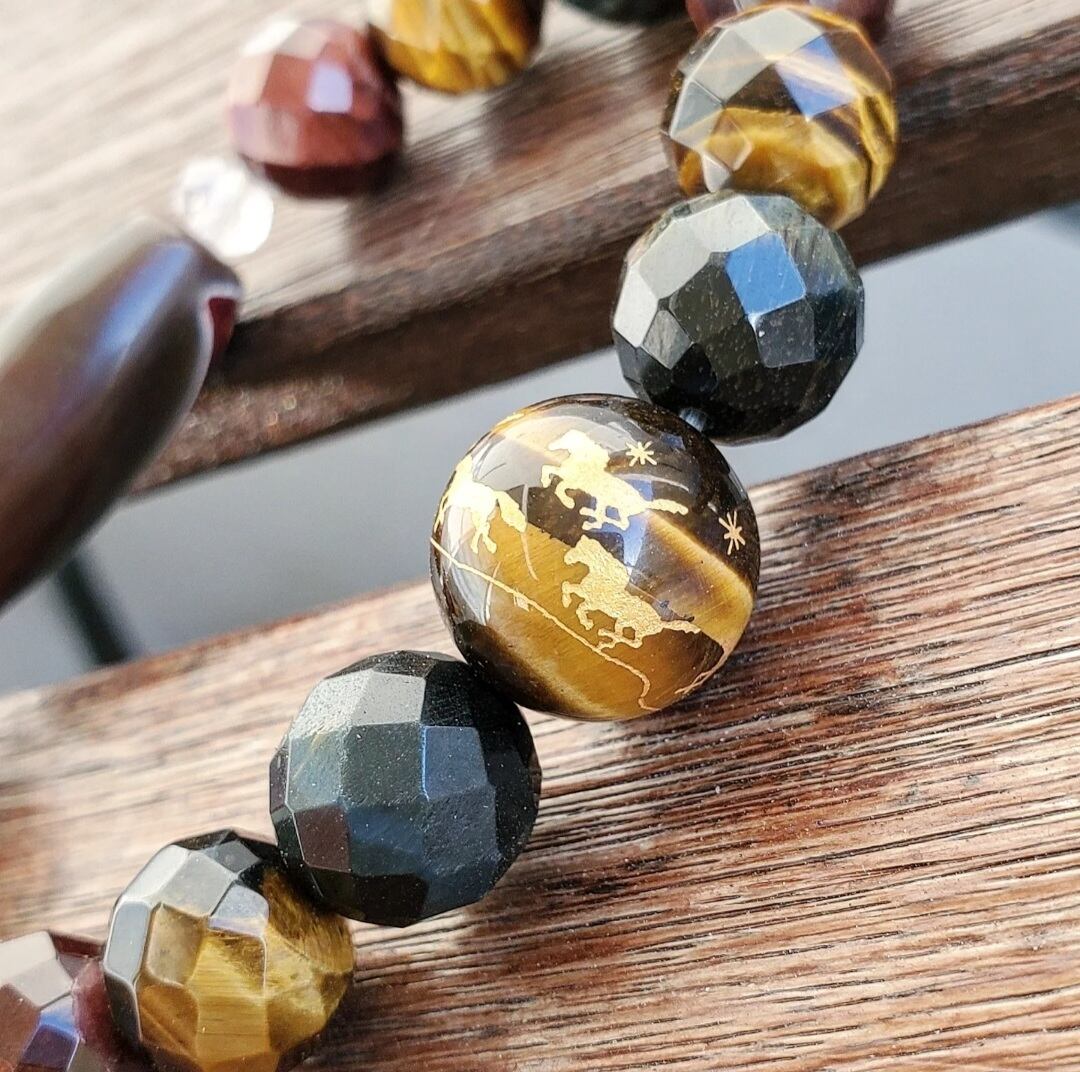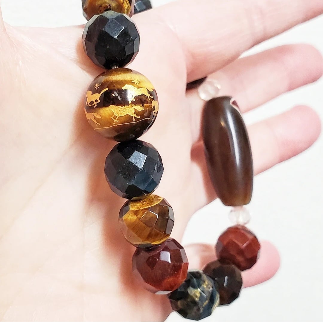 〈大玉〉黒鳶赤紋(くろとびせきもん)日月星(にちげつせい/ひつきぼし)天珠 & イエロータイガーアイ(九頭馬・金色彫り) & ミックスタイガーアイ(ミラーボールカット) & ブラックスピネル & ミルキークォーツ
