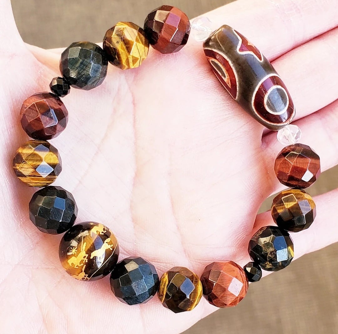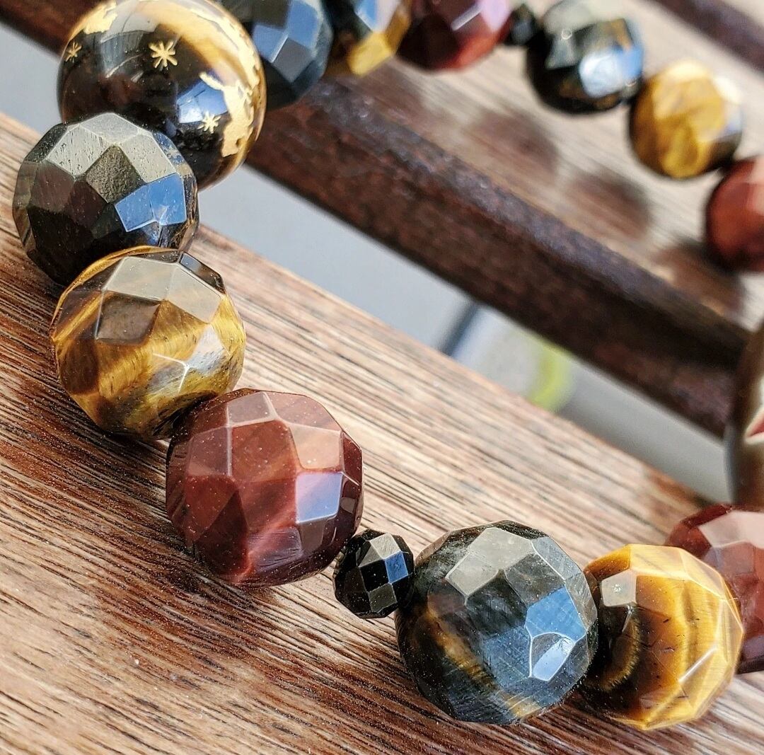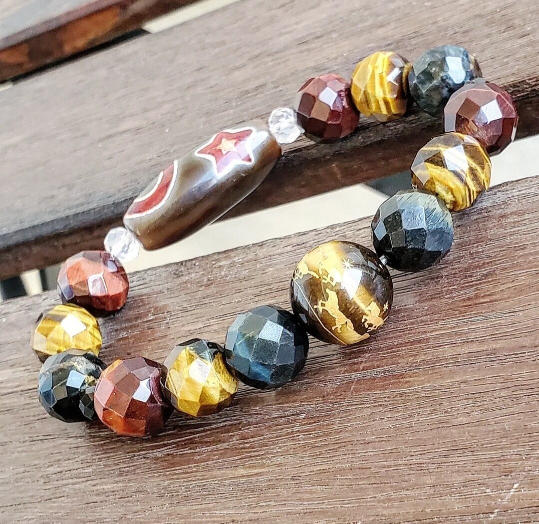 〈大玉〉黒鳶赤紋(くろとびせきもん)日月星(にちげつせい/ひつきぼし)天珠 & イエロータイガーアイ(九頭馬・金色彫り) & ミックスタイガーアイ(ミラーボールカット) & ブラックスピネル & ミルキークォーツ