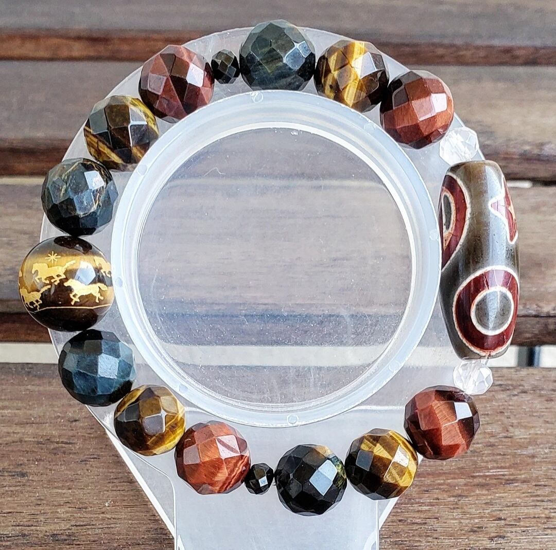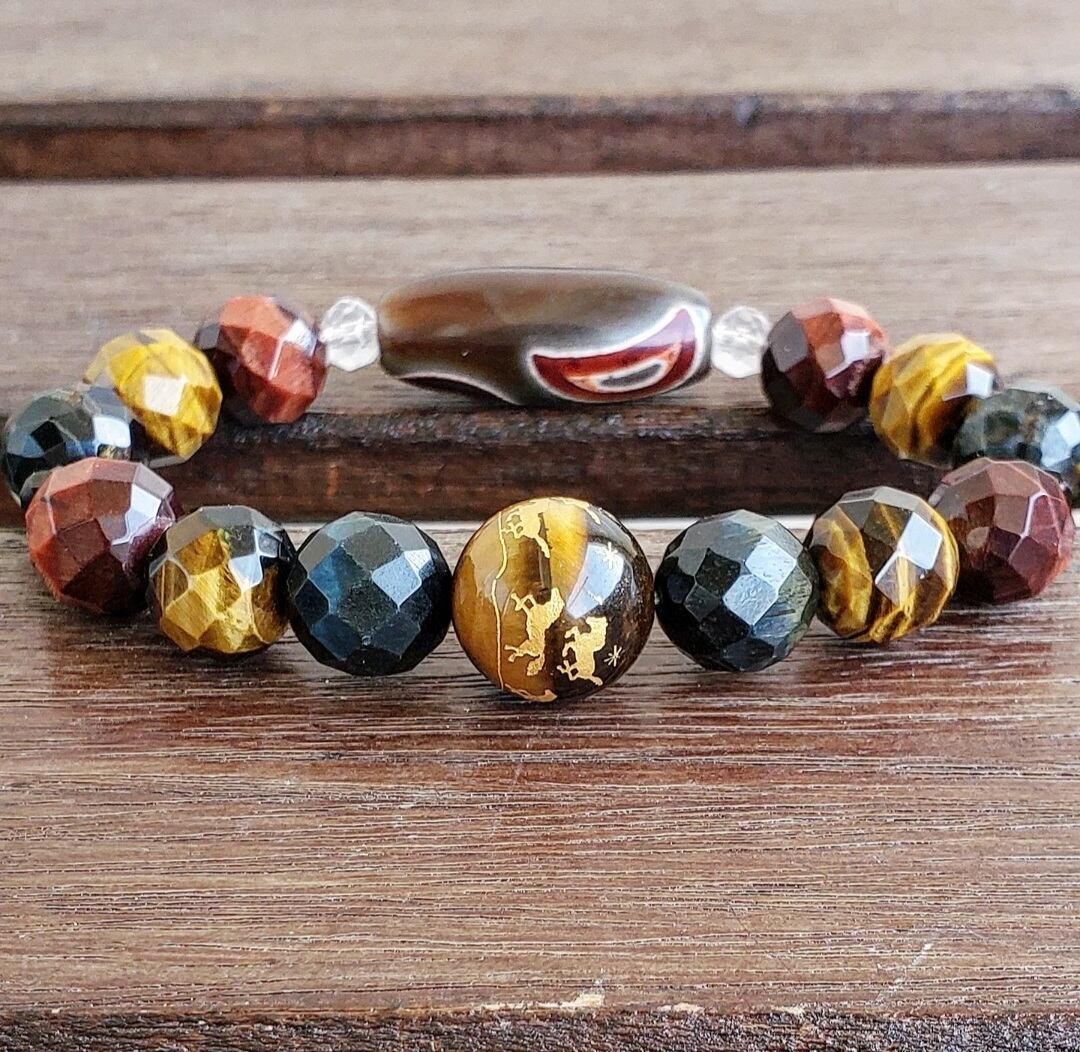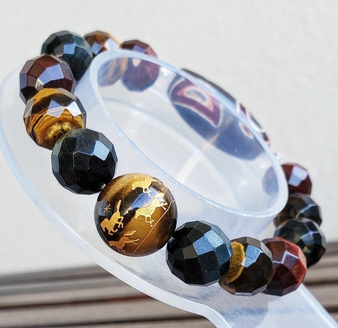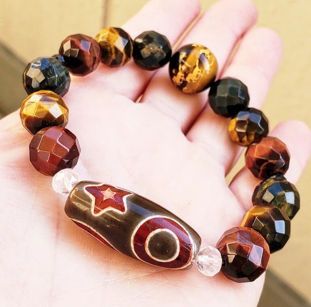 〈大玉〉黒鳶赤紋(くろとびせきもん)日月星(にちげつせい/ひつきぼし)天珠 & イエロータイガーアイ(九頭馬・金色彫り) & ミックスタイガーアイ(ミラーボールカット) & ブラックスピネル & ミルキークォーツ