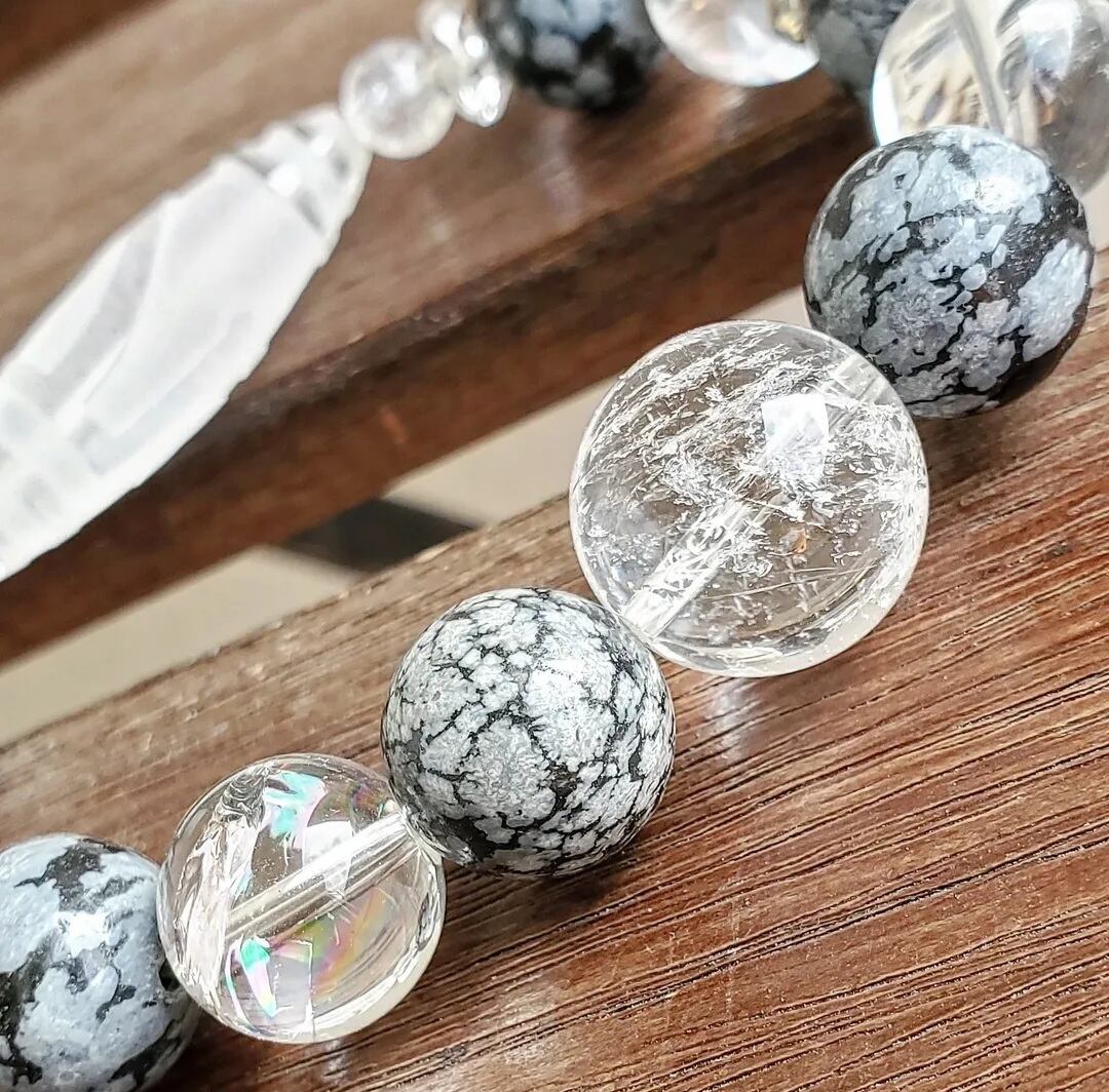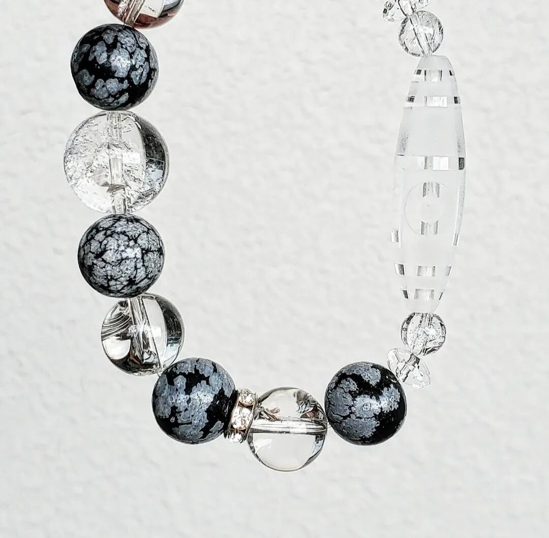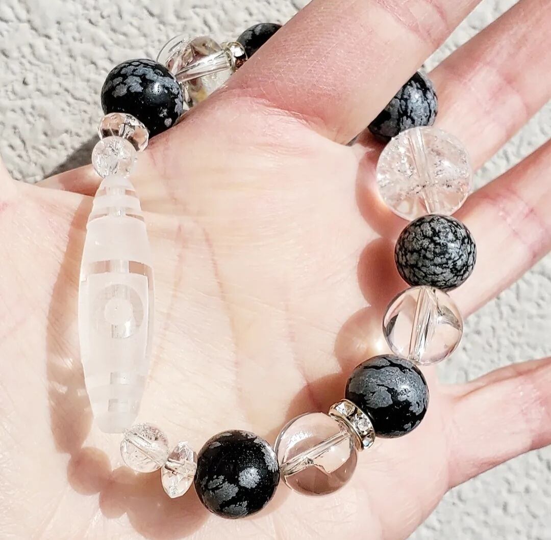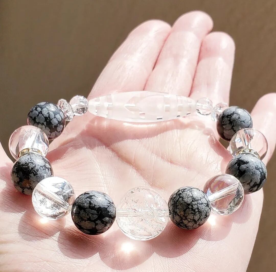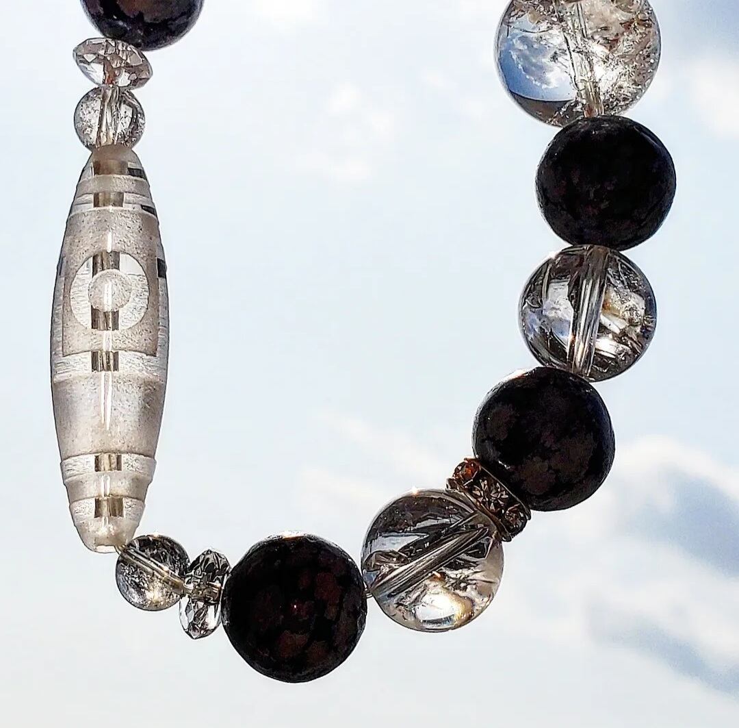 〈大玉〉天珠型水晶(一眼山形彫り) & スノーフレークオブシディアン & アイリスクォーツ & ボタンカット水晶