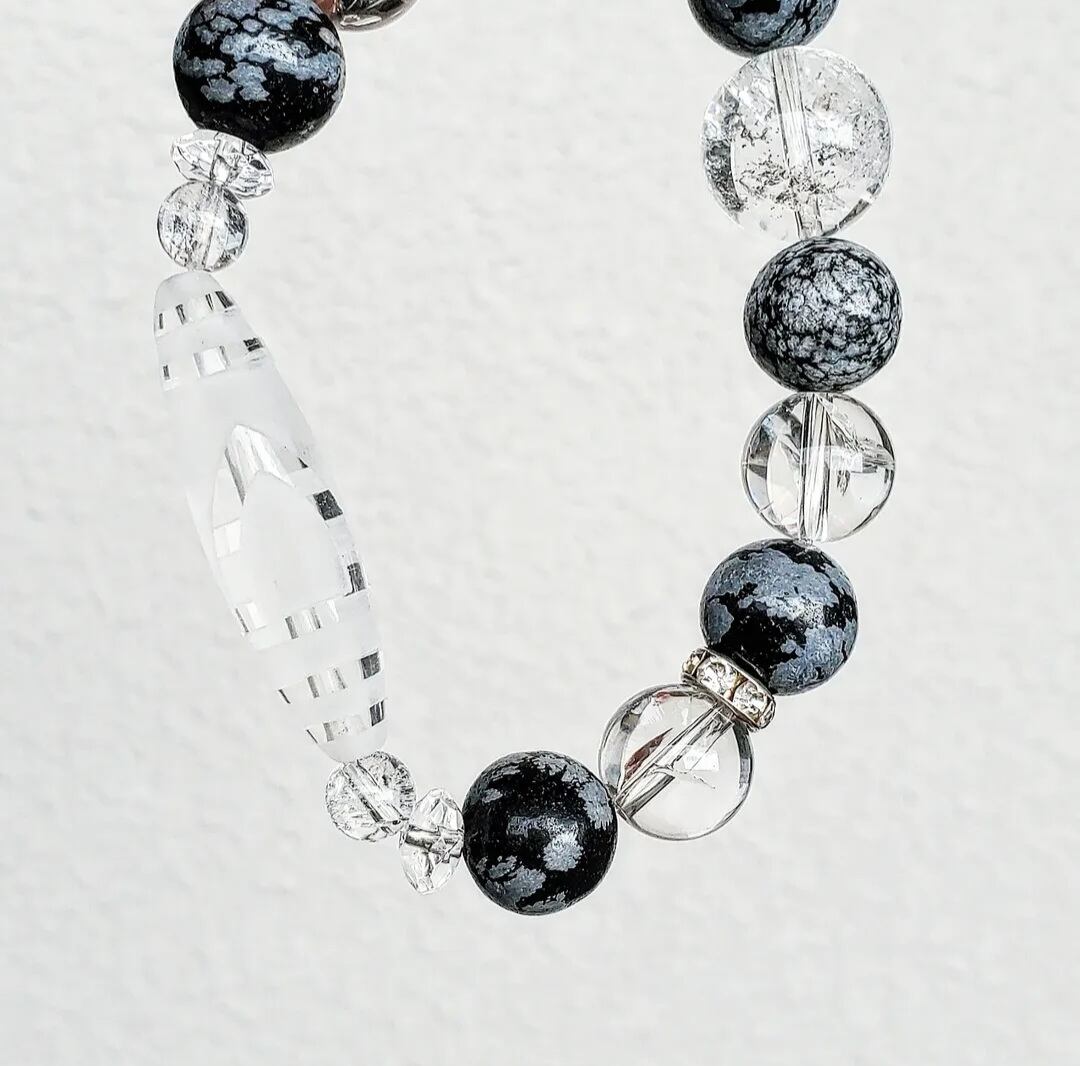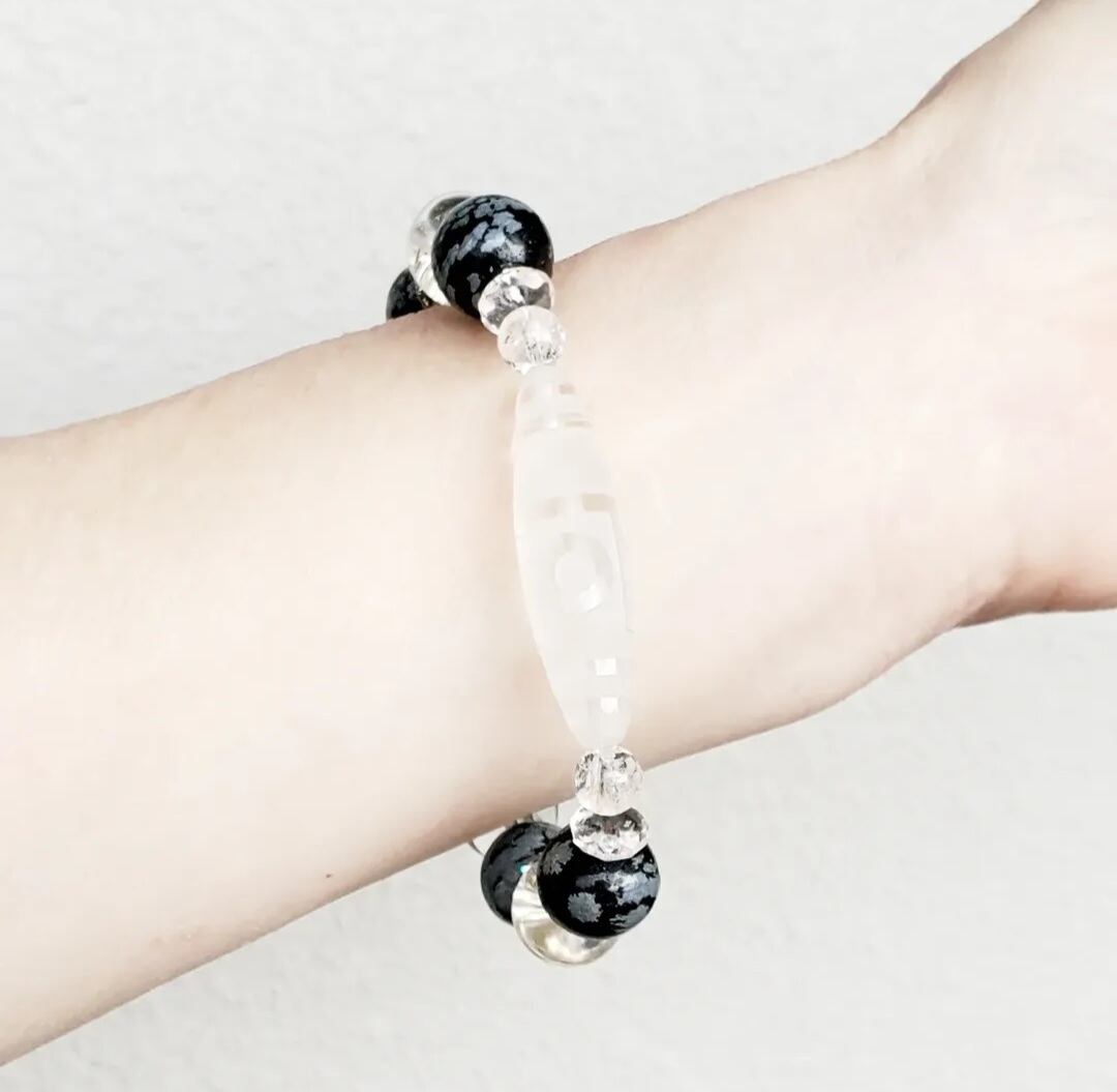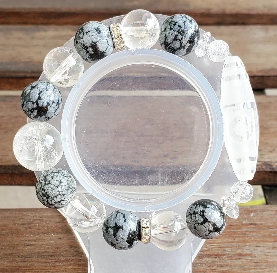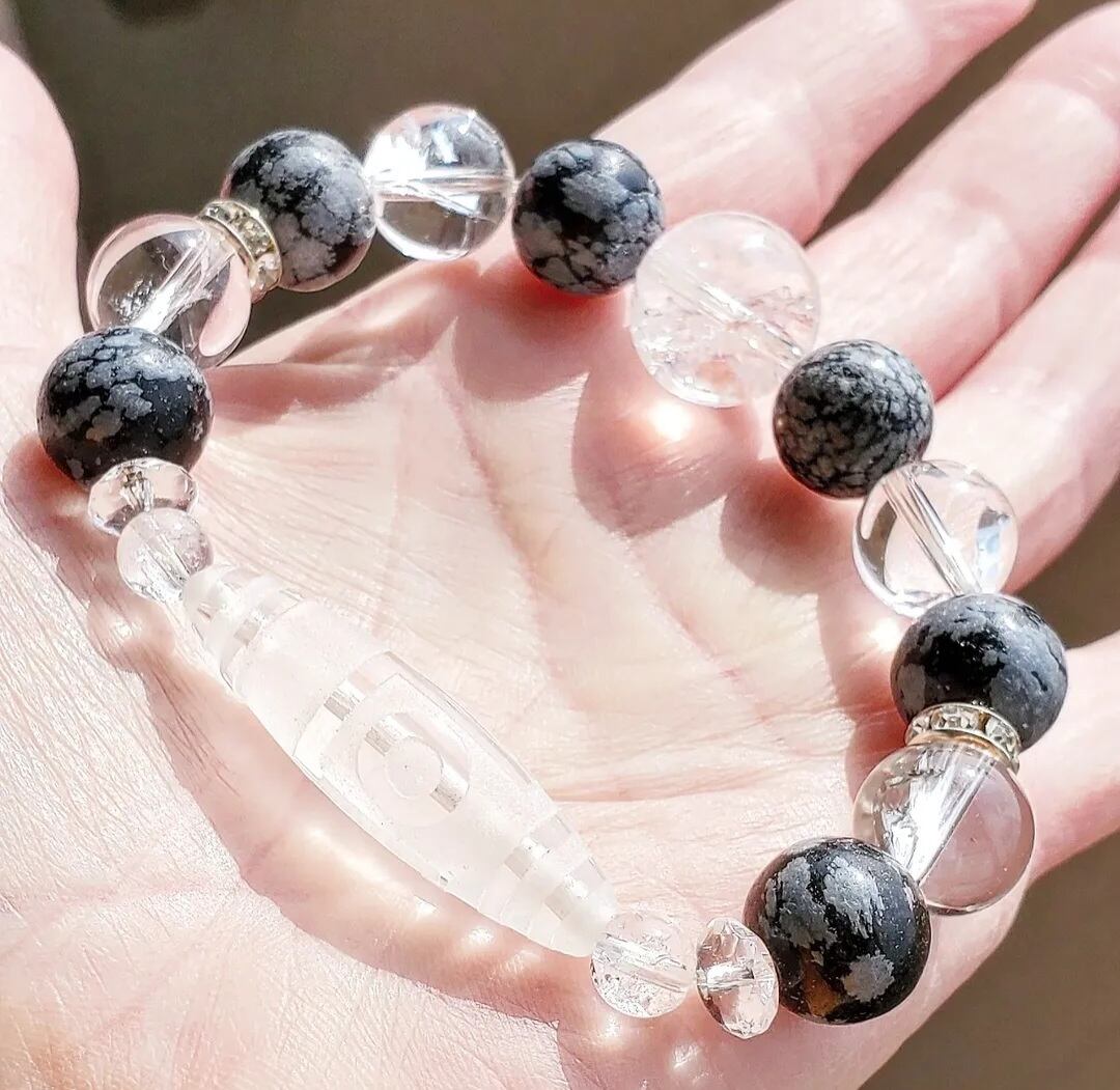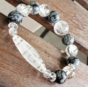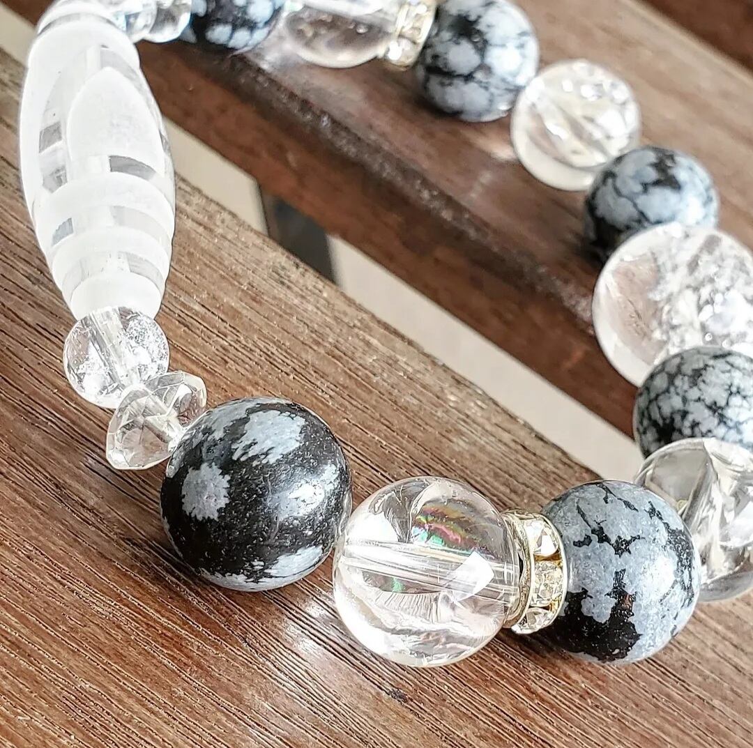 〈大玉〉天珠型水晶(一眼山形彫り) & スノーフレークオブシディアン & アイリスクォーツ & ボタンカット水晶
