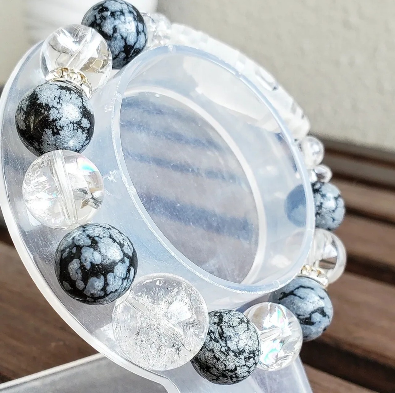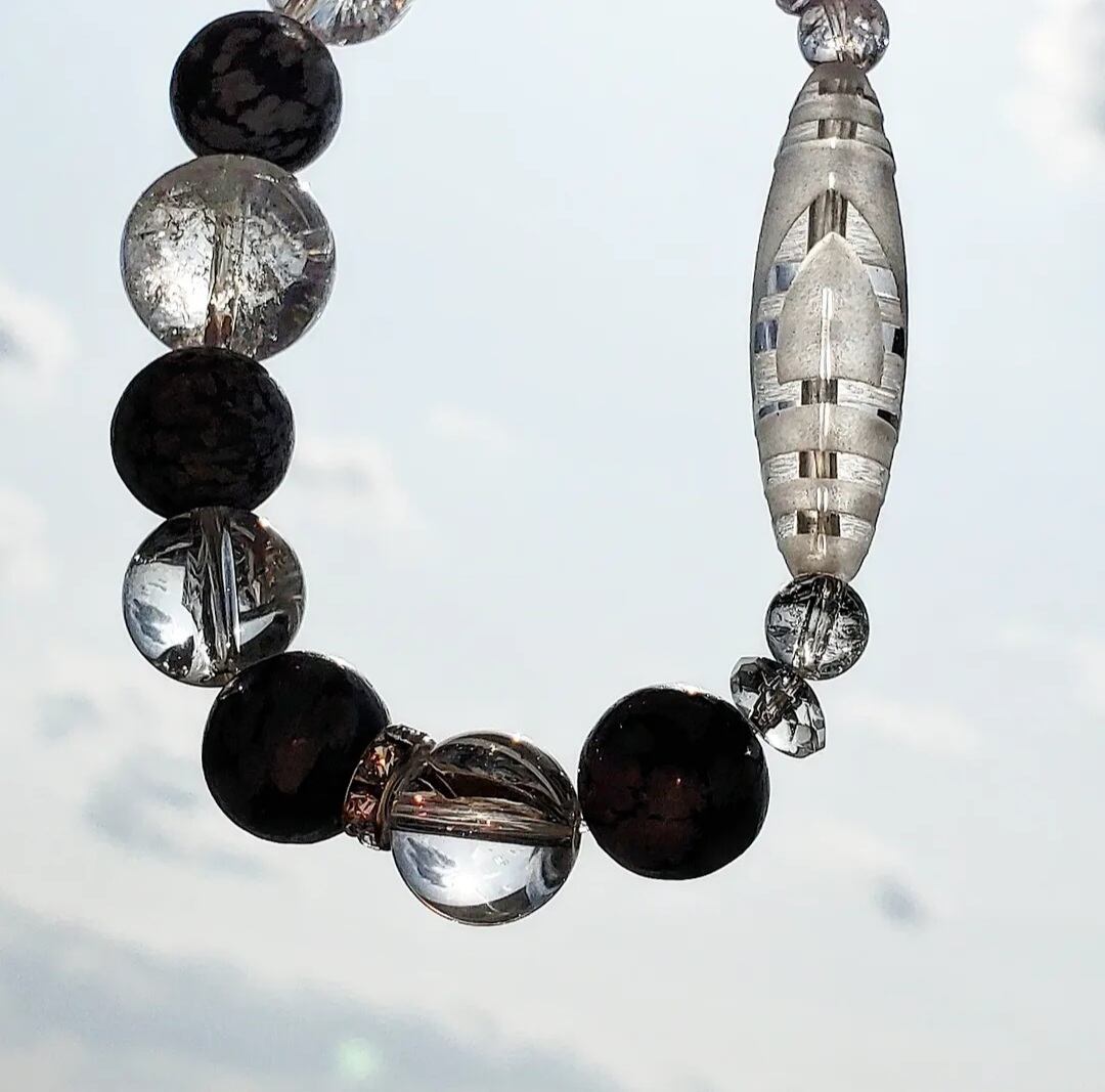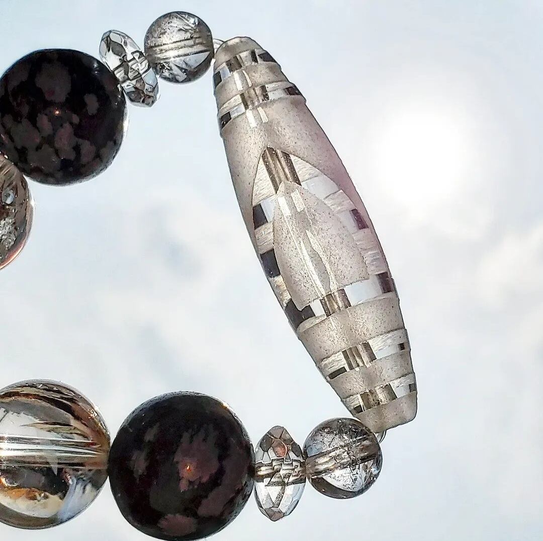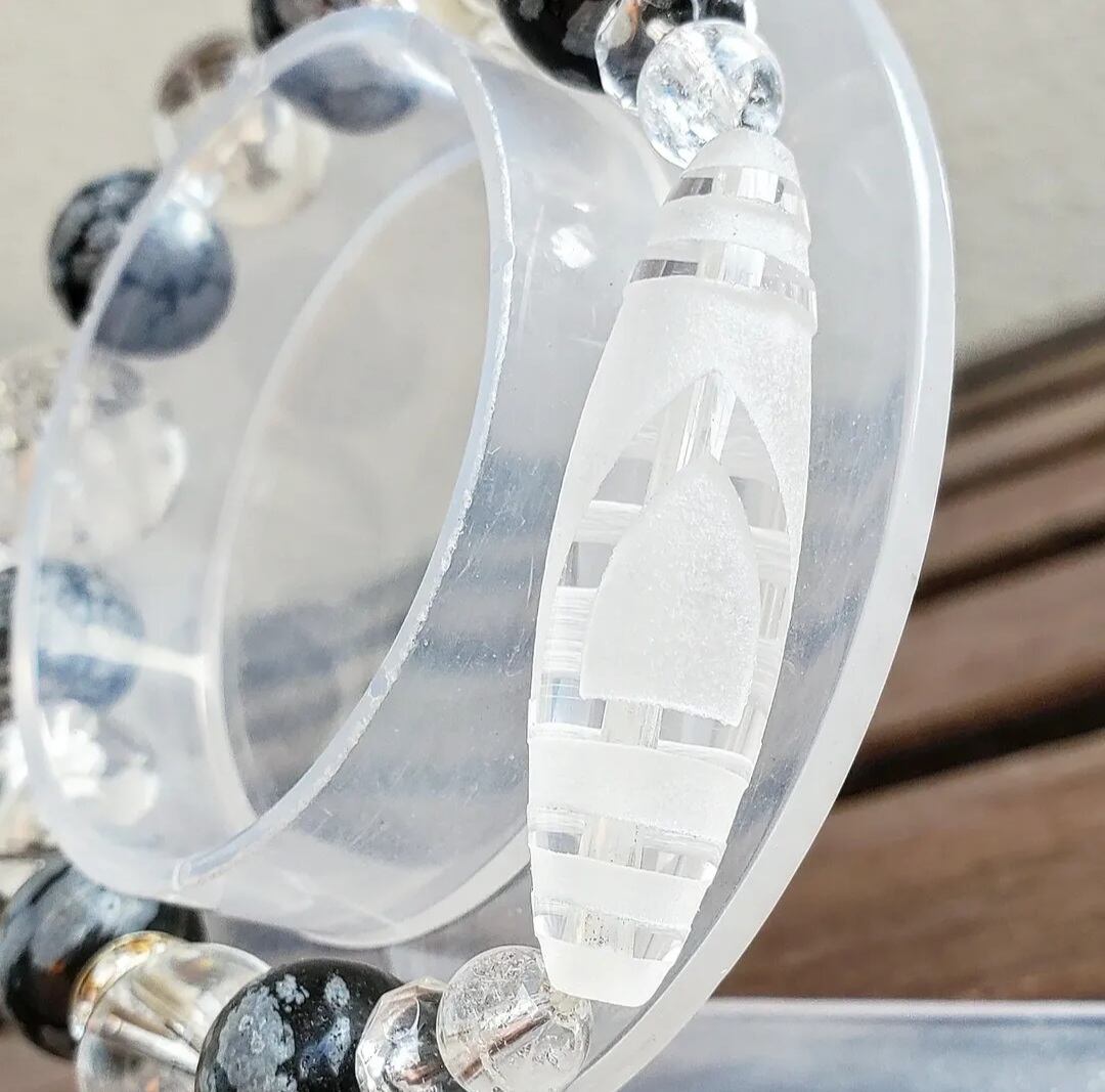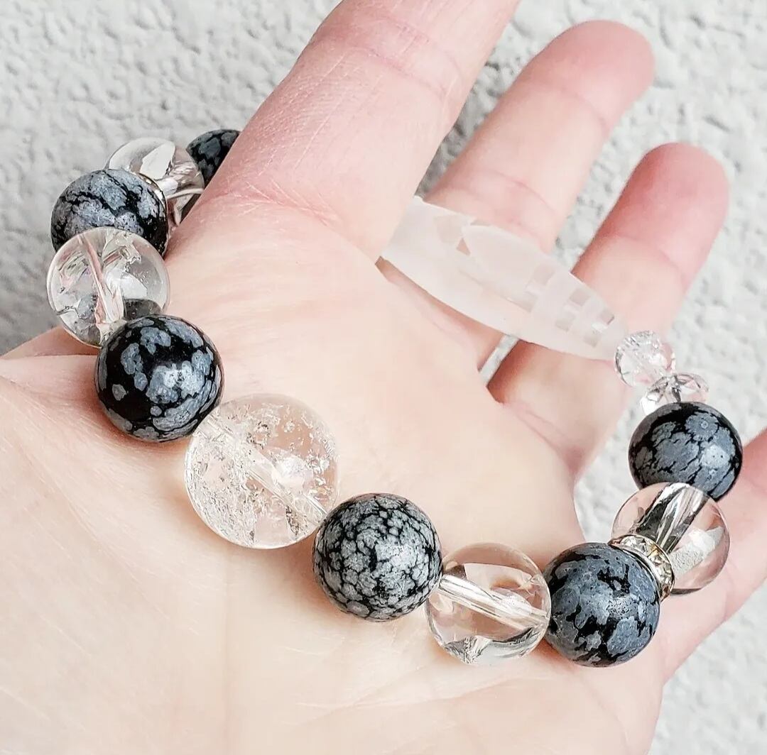 〈大玉〉天珠型水晶(一眼山形彫り) & スノーフレークオブシディアン & アイリスクォーツ & ボタンカット水晶