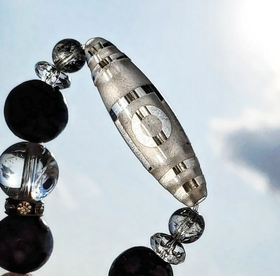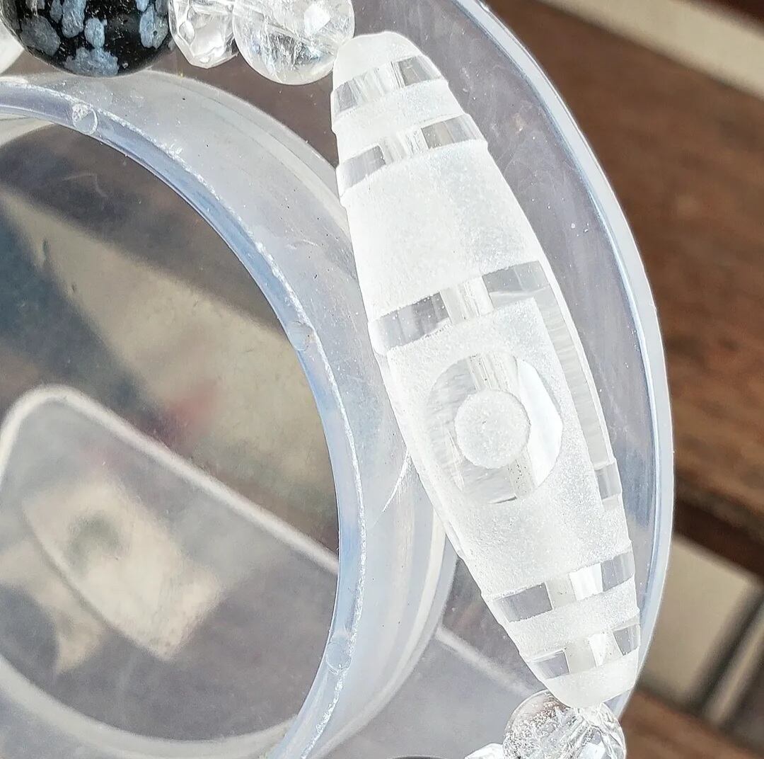 今回の天珠は、透明感の高い水晶に一眼山形の紋様が彫られた