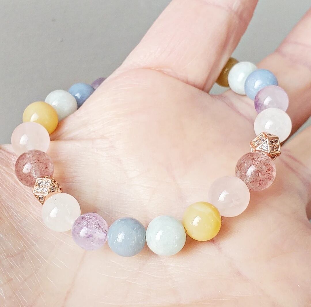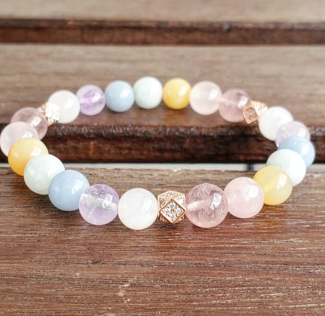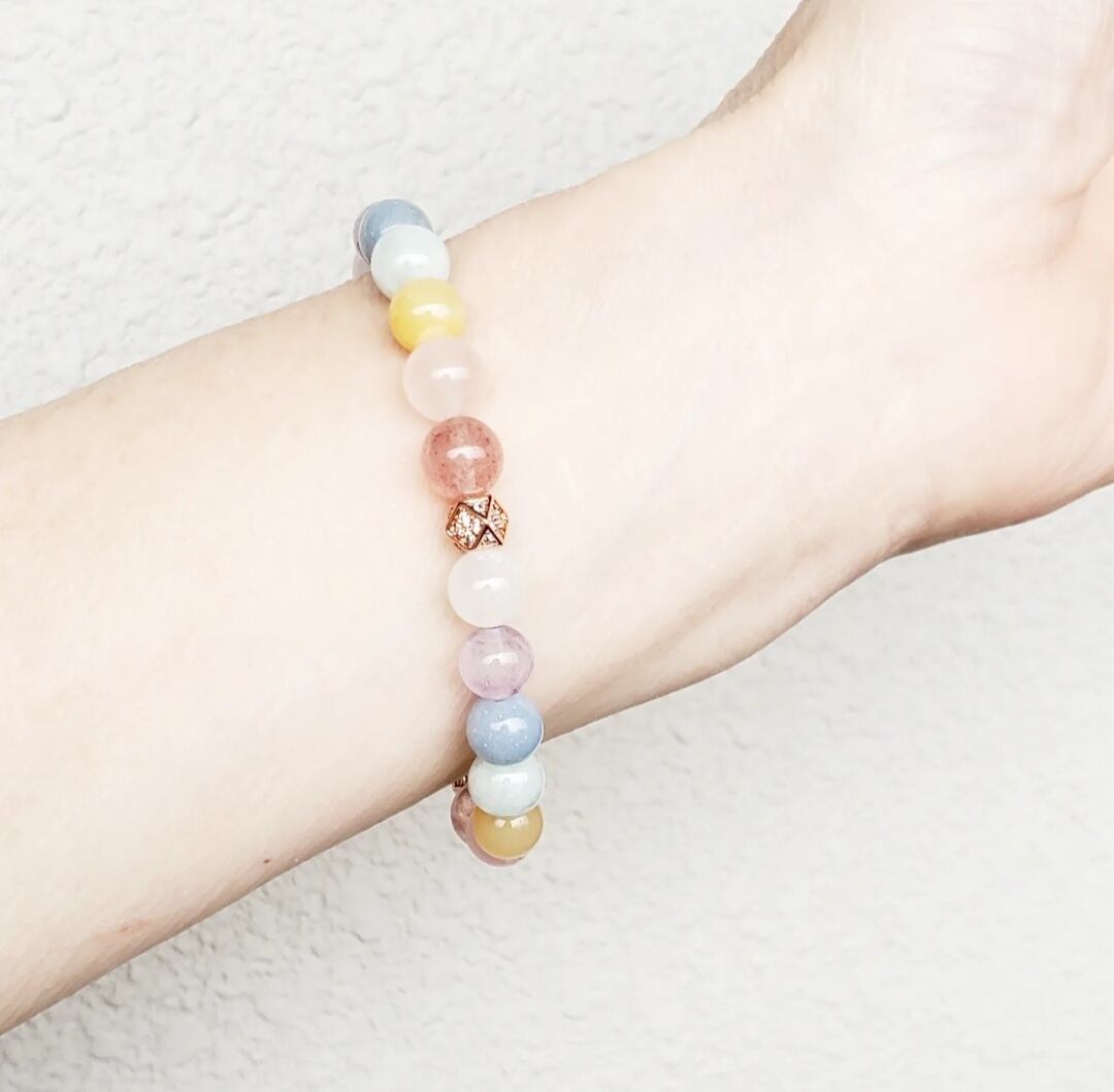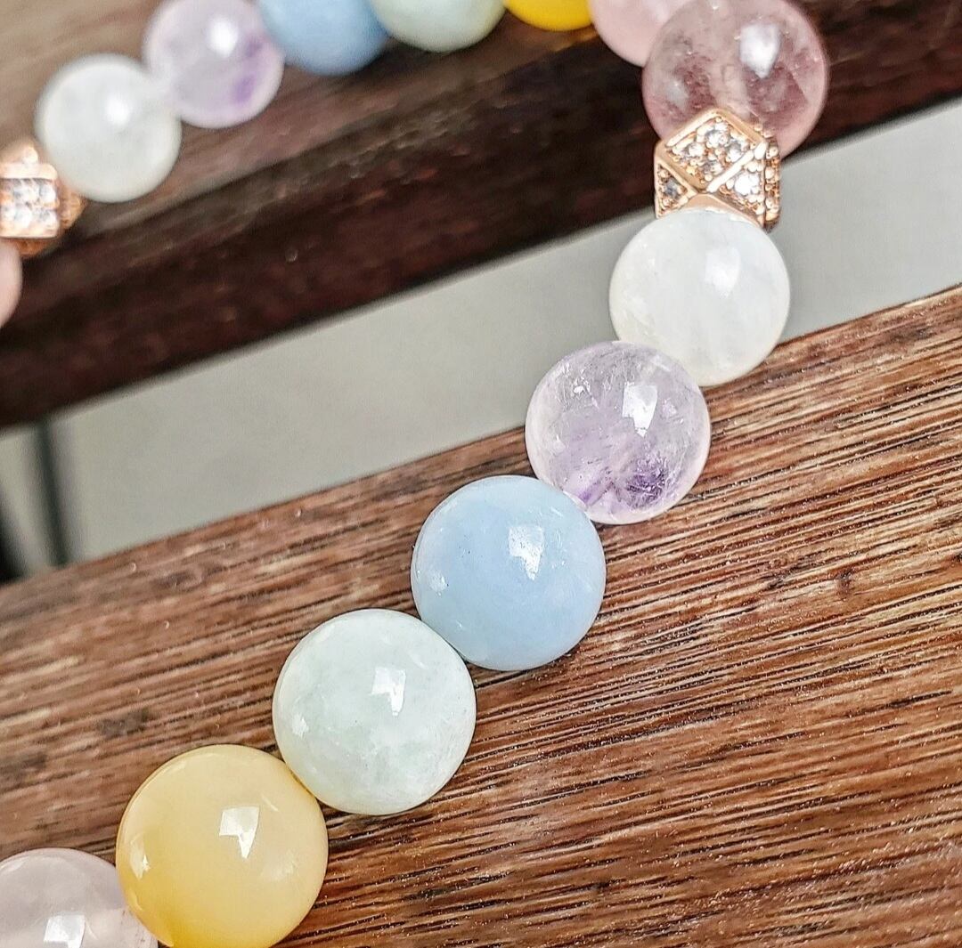柔らかく優しい色合いのパステルカラーの天然石で組んだ癒しのブレスレットです