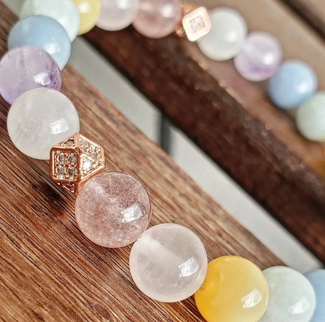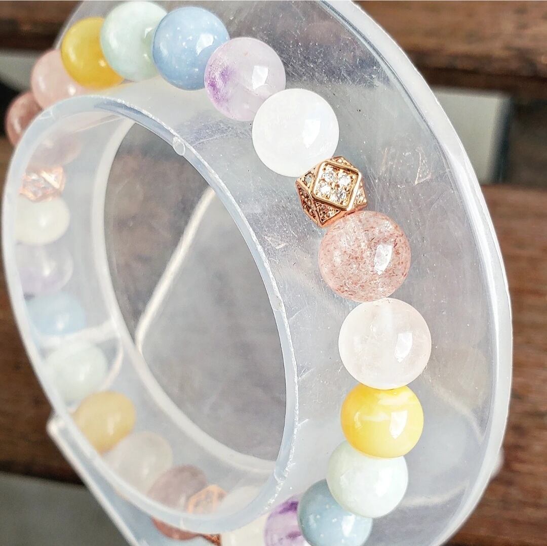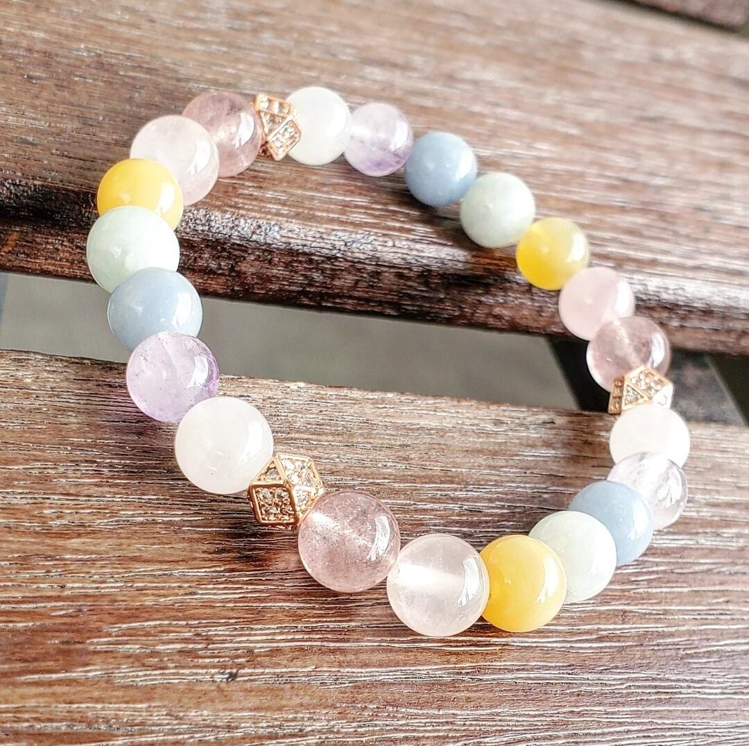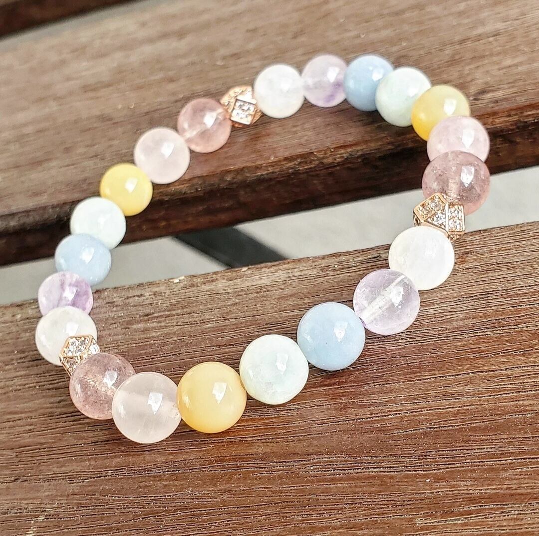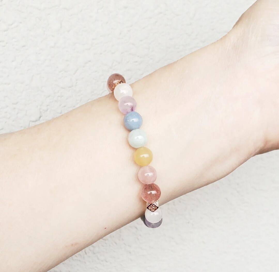 柔らかく優しい色合いのパステルカラーの天然石で組んだ癒しのブレスレットです