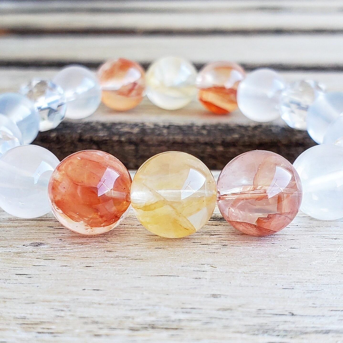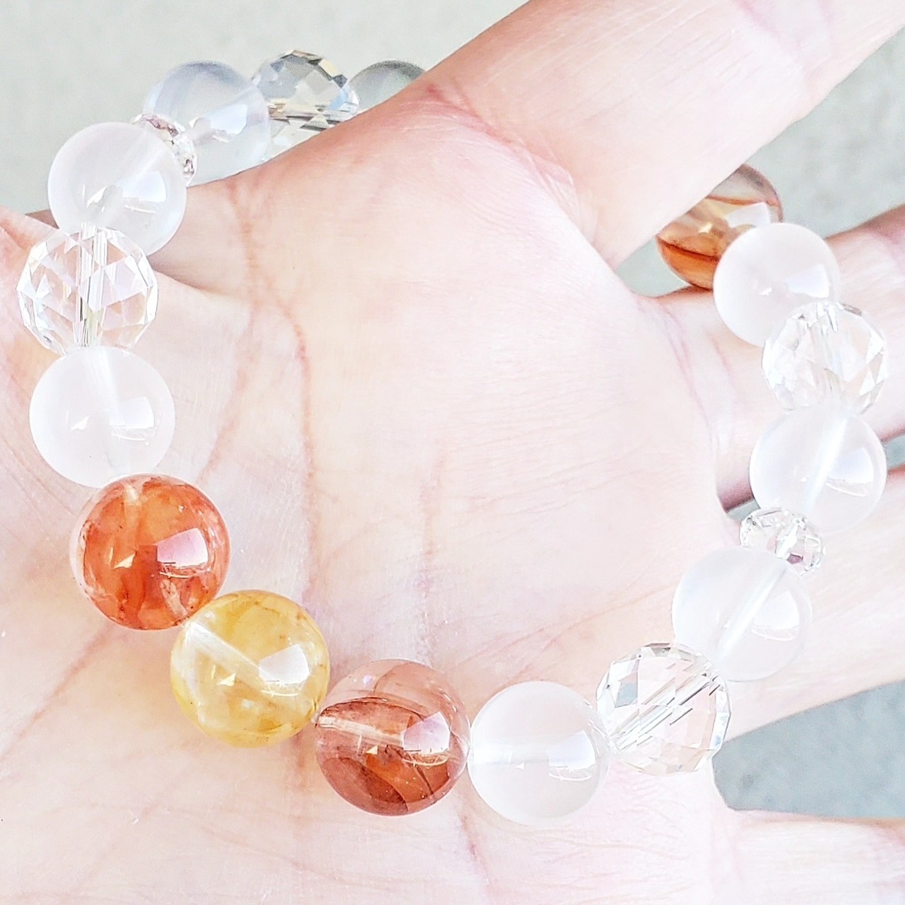 水晶の中にライモナイト(褐鉄鉱)やヘマタイト(赤鉄鉱)等が染み込み、赤色や黄色やオレンジ色の膜を作った「奇跡のクォーツ」と呼ばれる稀少な天然オーロラクォーツ(錦鯉水晶)