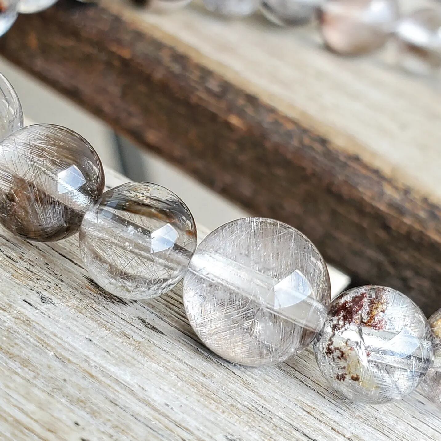 水晶に内包されたチタンがブルッカイト(板チタン)になり、更にルチルへと変化したのが、プラチナルチル イン クォーツ