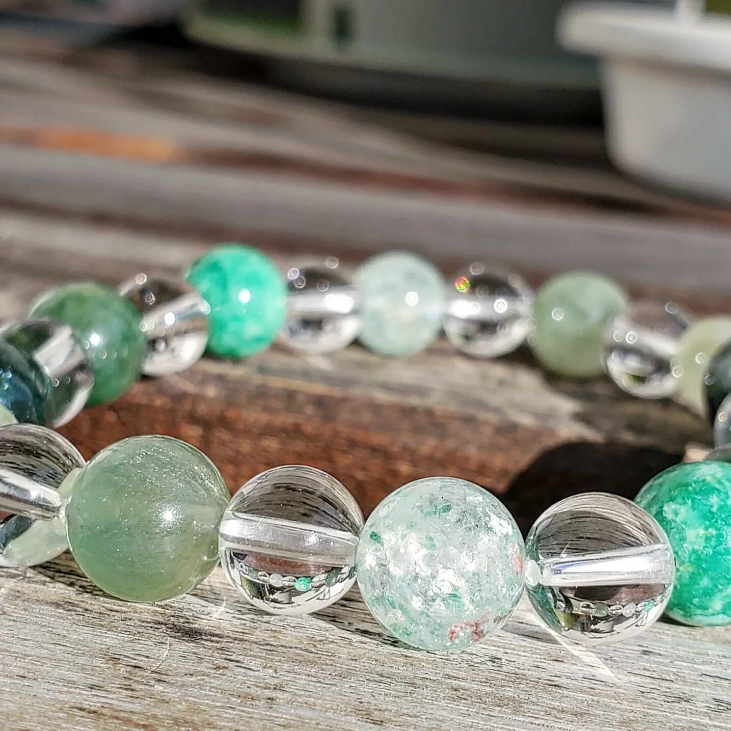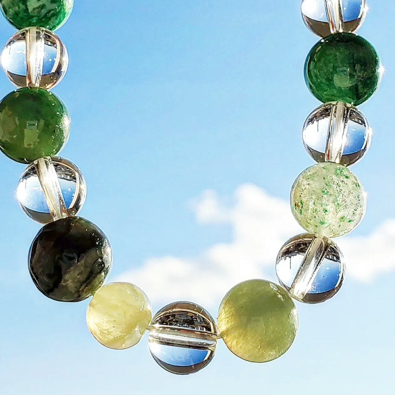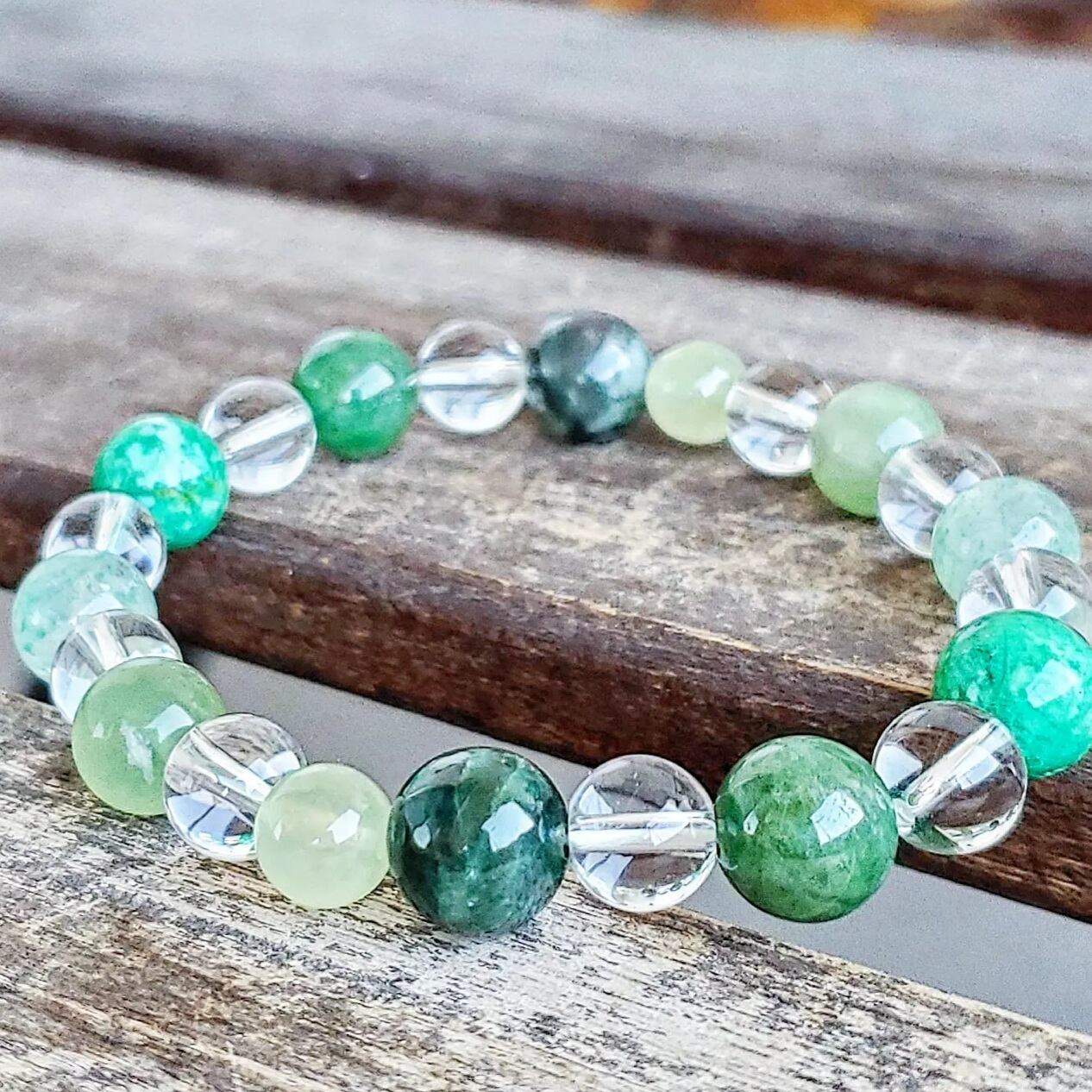 グリーン系の6種の天然石と天然水晶で組んだ癒し系のブレスレットです