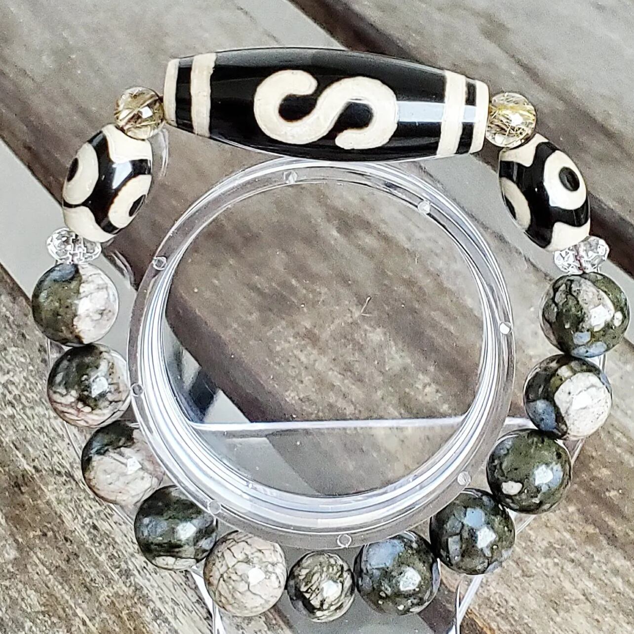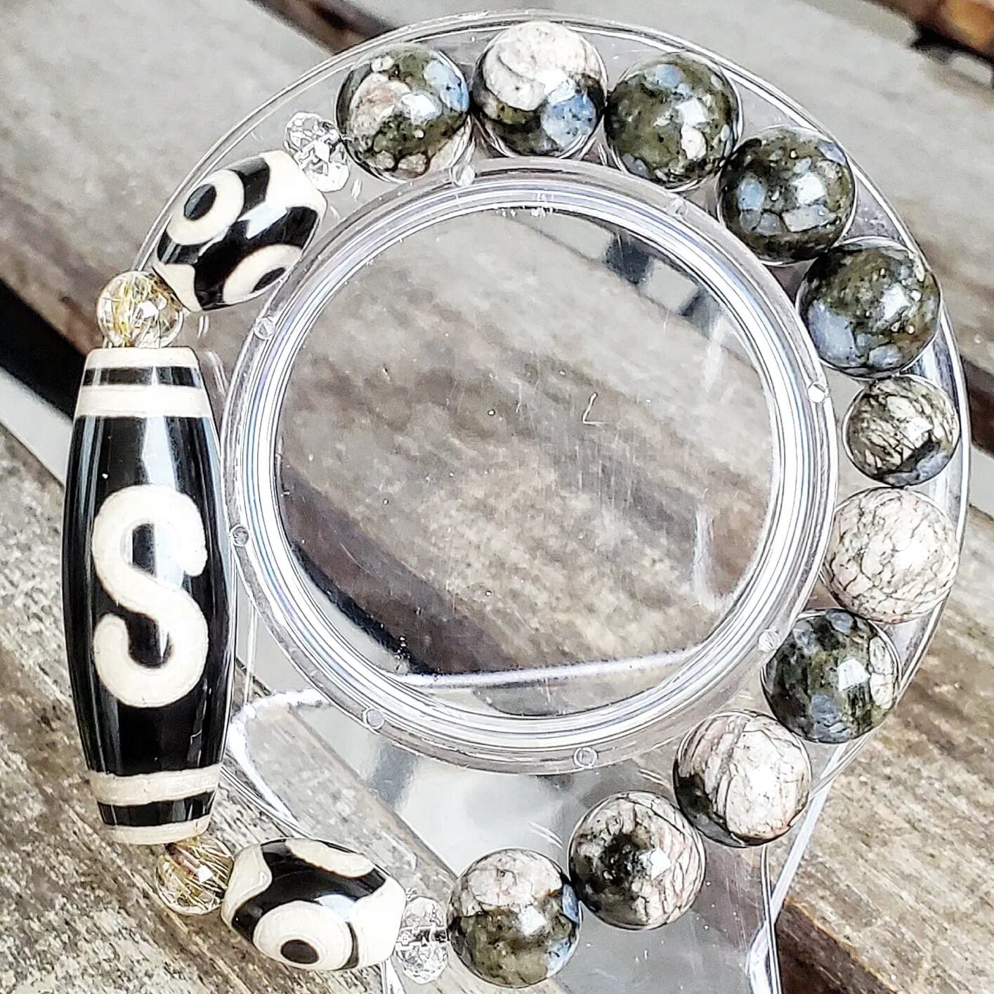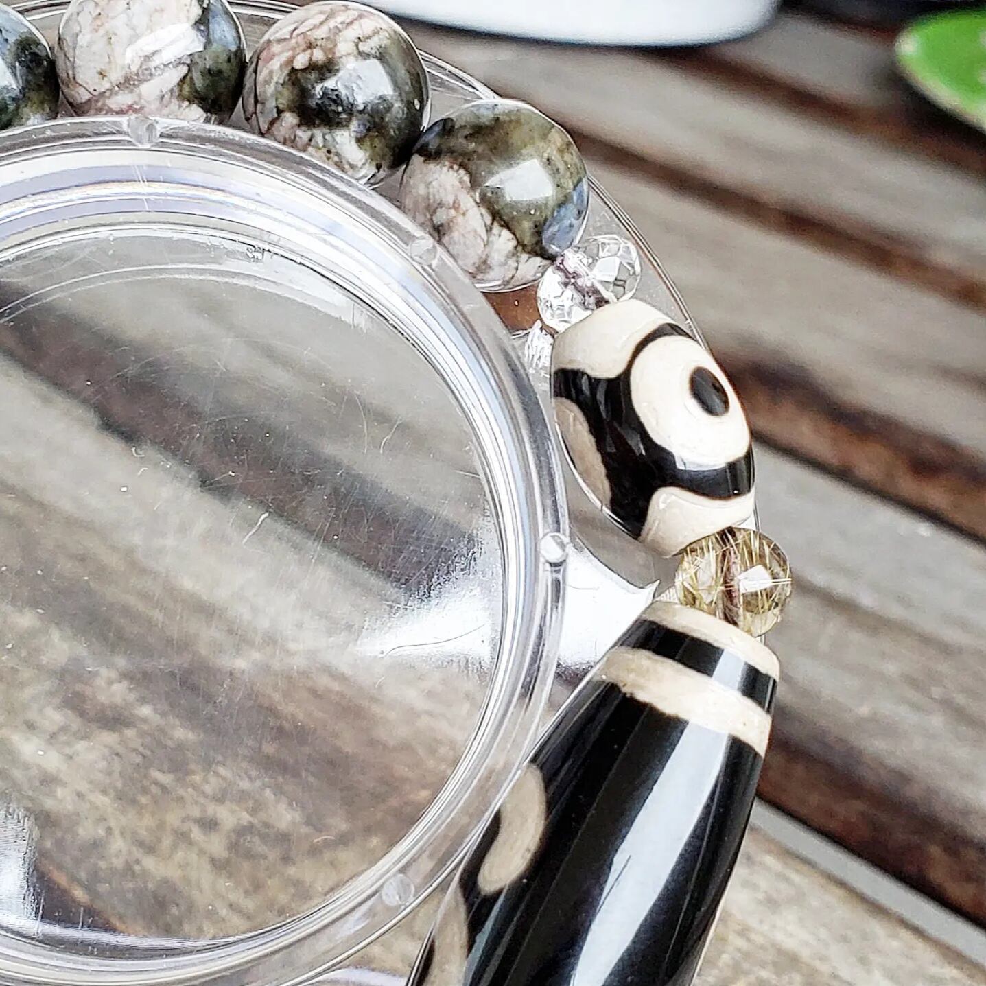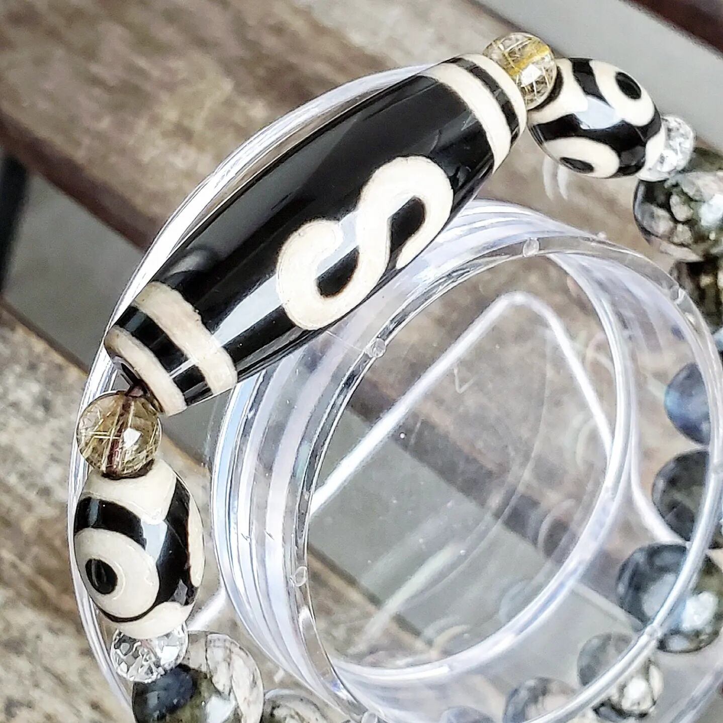 〈大玉〉招財(しょうざい)天珠 & 三眼天珠 & ゴールドルチルクォーツ & ケセラストーン & ボタンカット水晶