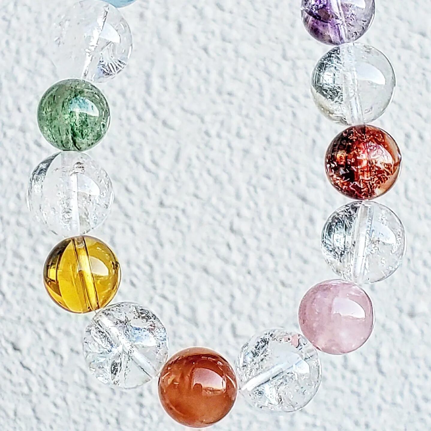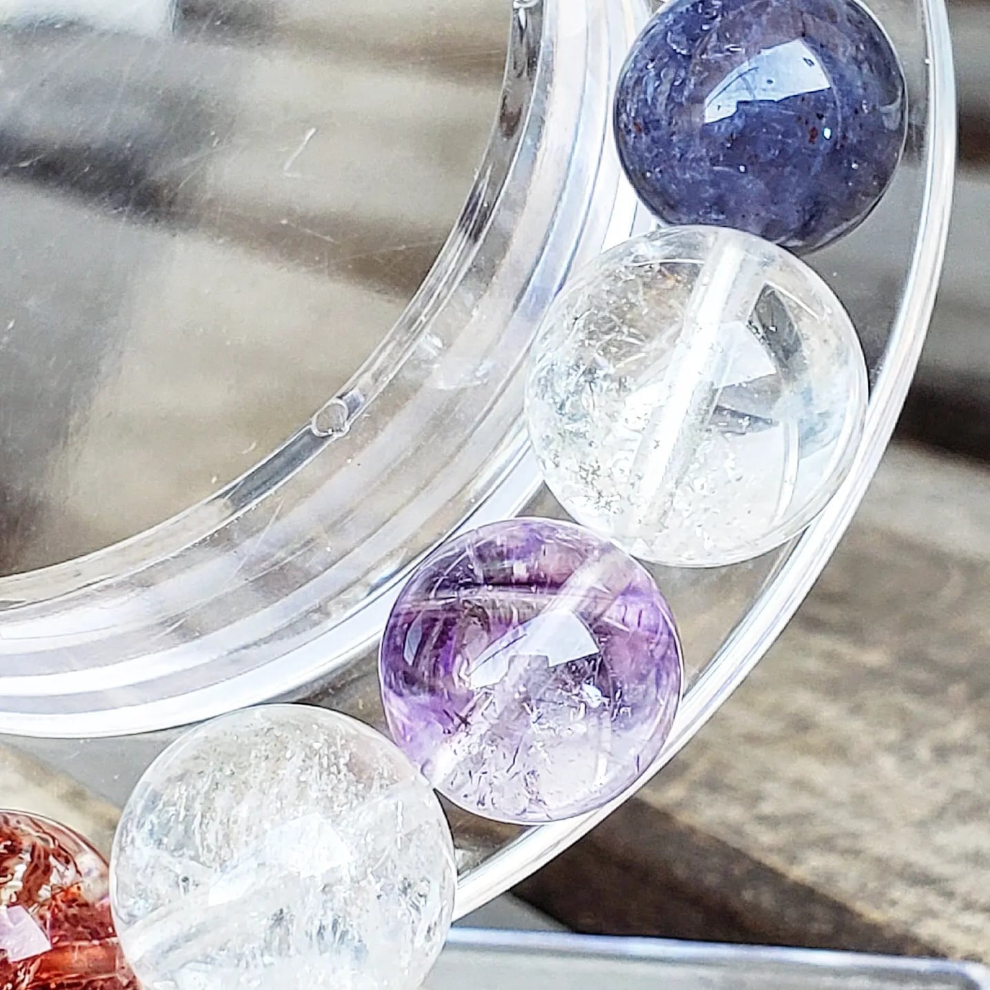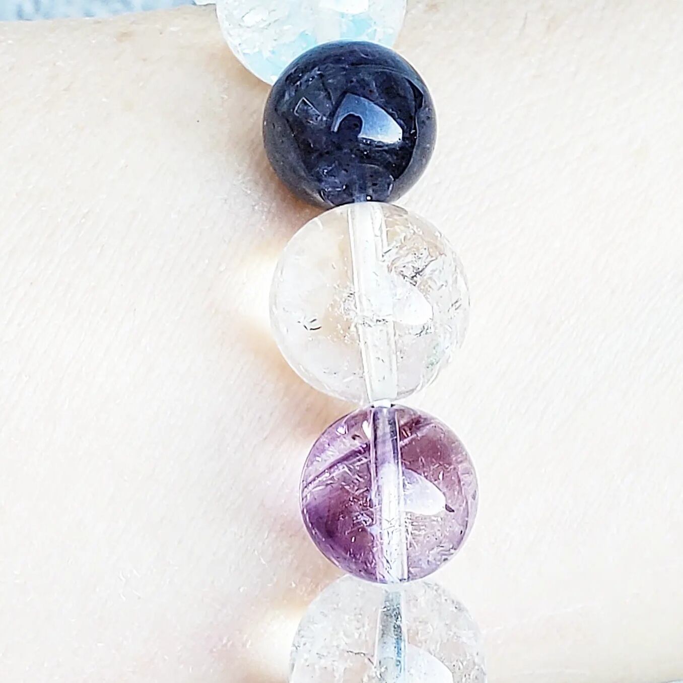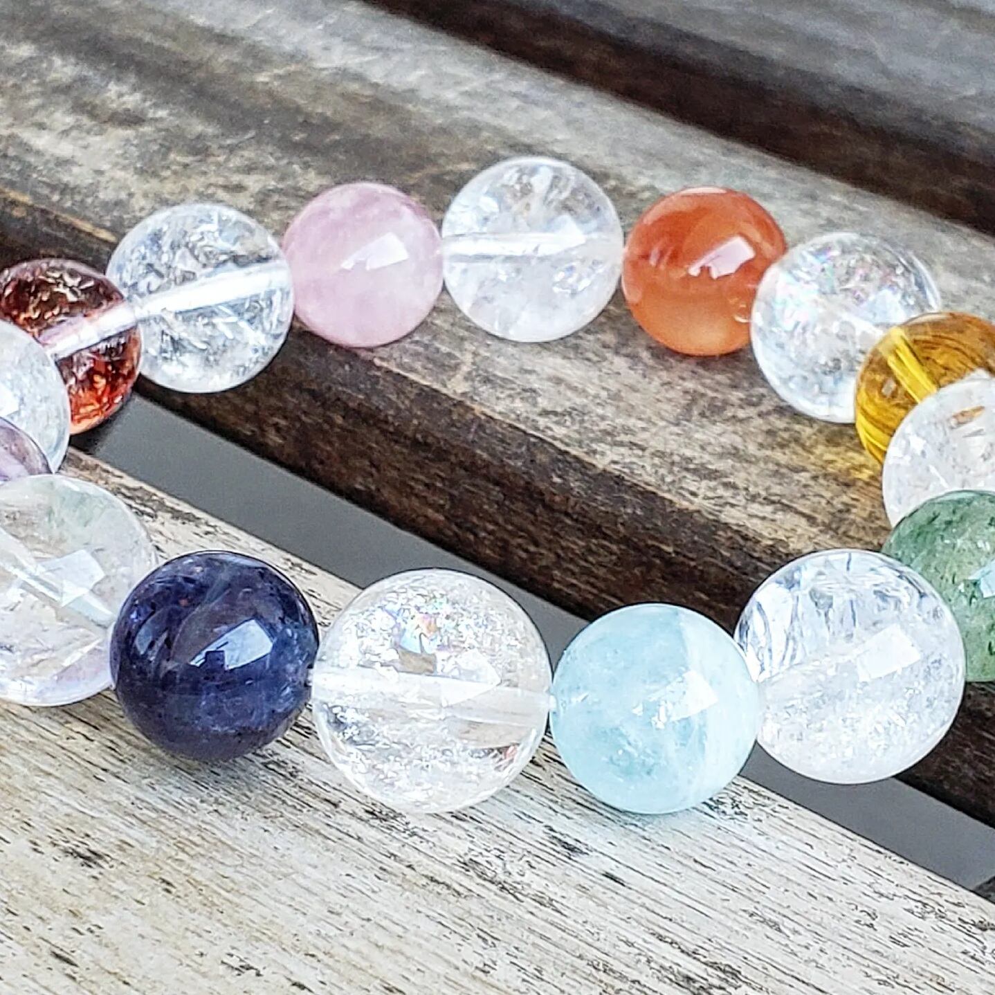 美しい天然アイリスクォーツと美しい8種8色の天然石で組んだブレスレットです