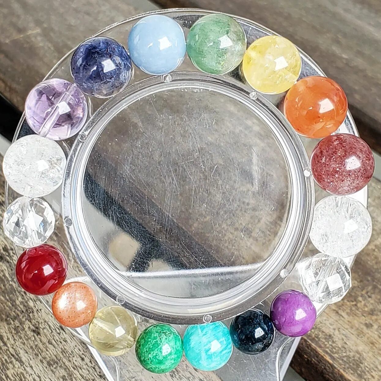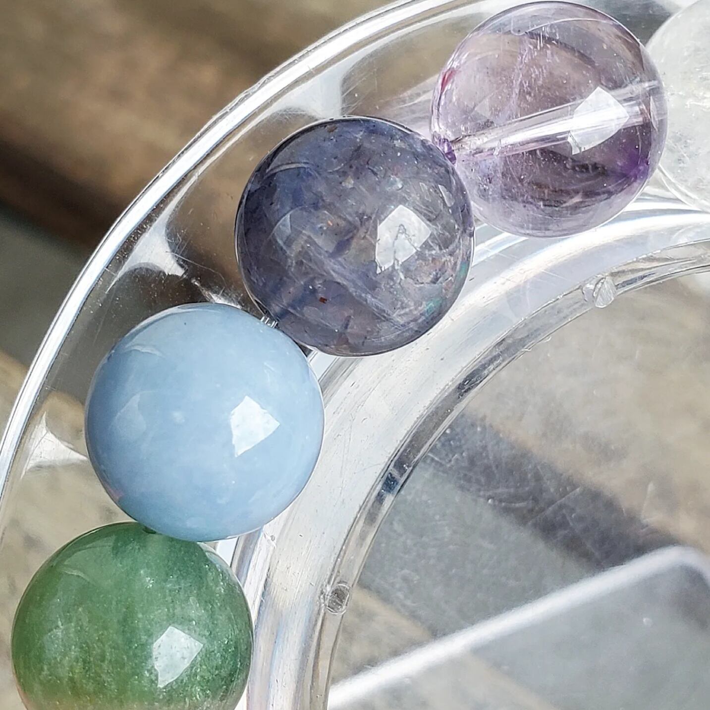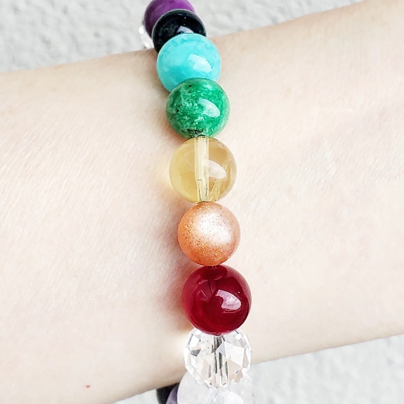 天然アイリスクォーツ(別名・虹入り水晶、レインボー水晶)とキラキラカット水晶で繋いで組んだブレスレットです