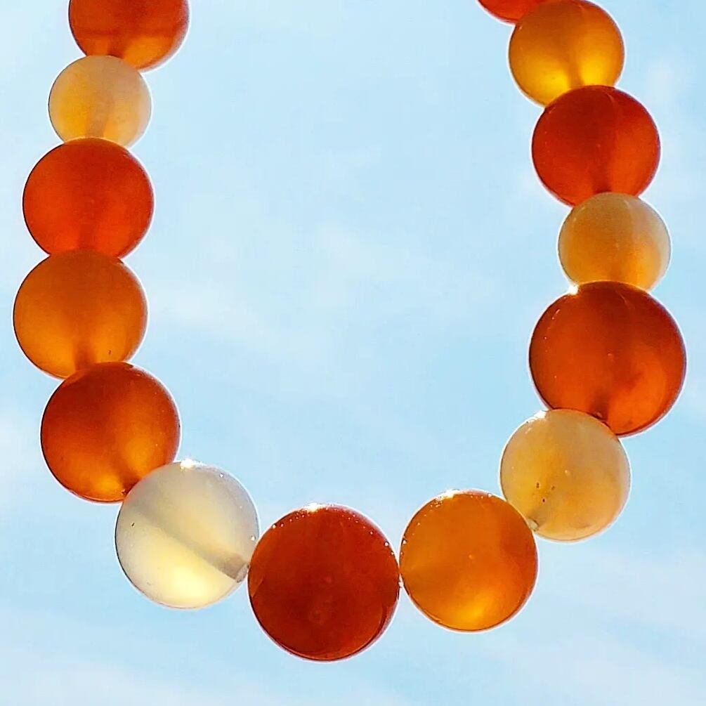約12㎜の大玉で色濃いめの塩源瑪瑙を筆頭に、様々な色(ピンク~オレンジ~ホワイト)と大きさ(約11㎜、10㎜、9㎜)の塩源瑪瑙で組んだブレスレットです