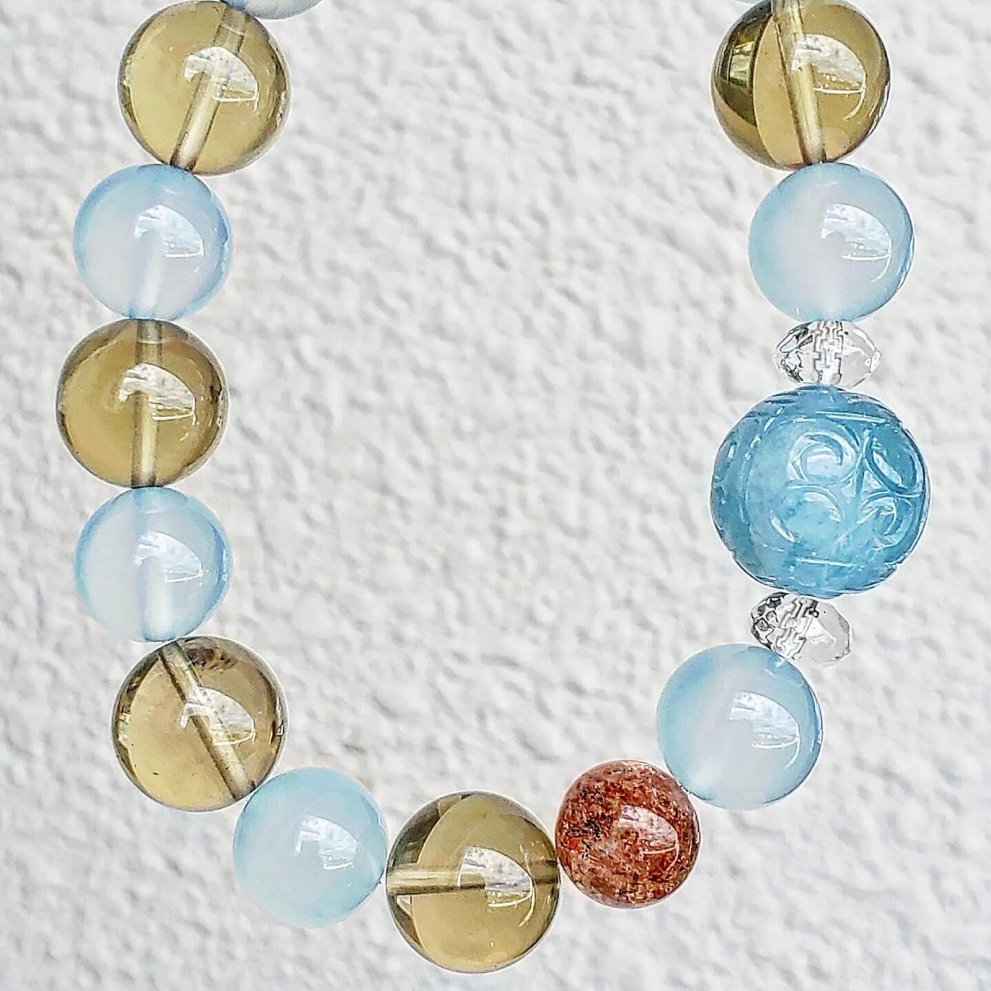 〈大玉〉アクアマリン(マニ車回紋珠)&シーブルーカルセドニー&レモンクォーツ&ストロベリーサンストーン&ボタンカット水晶
