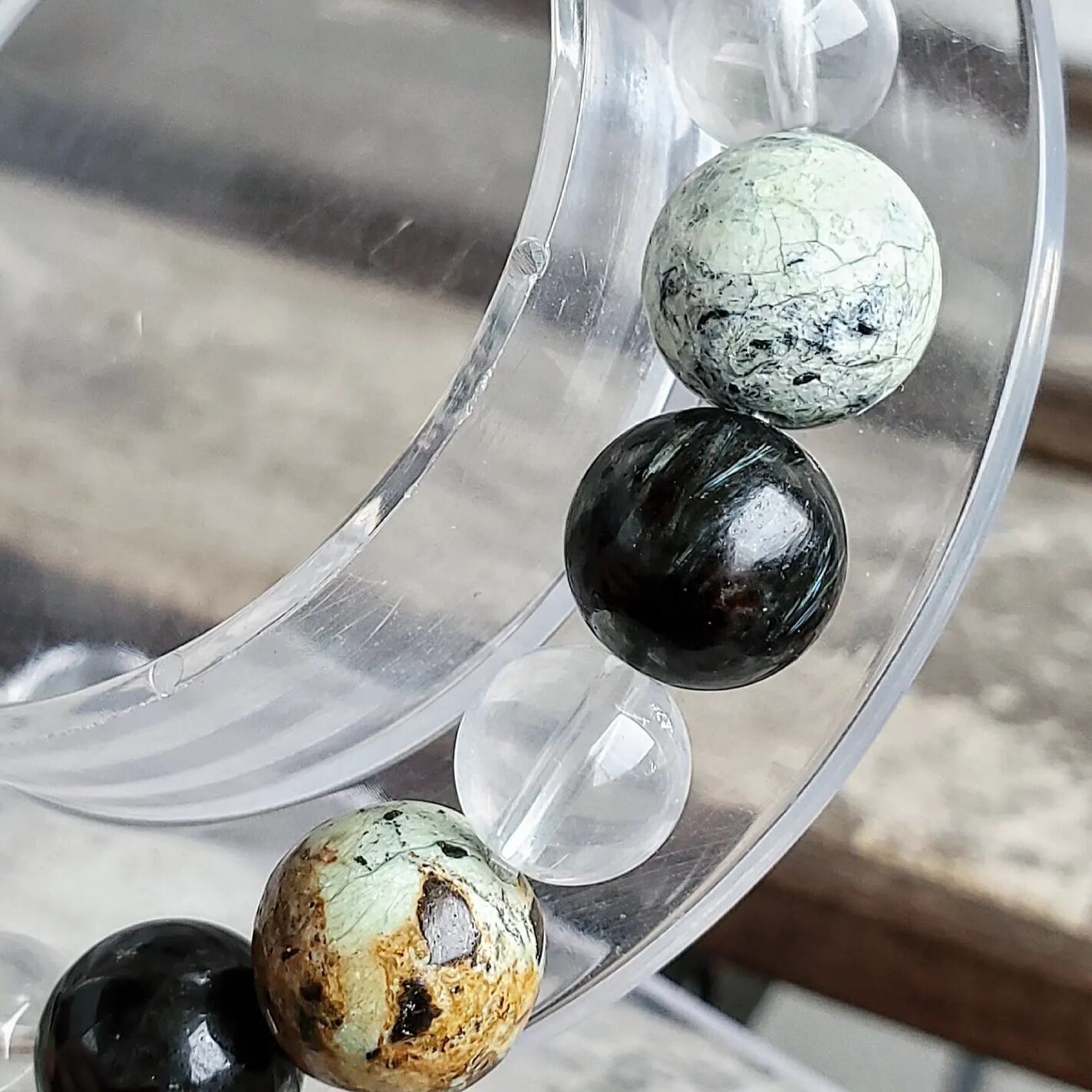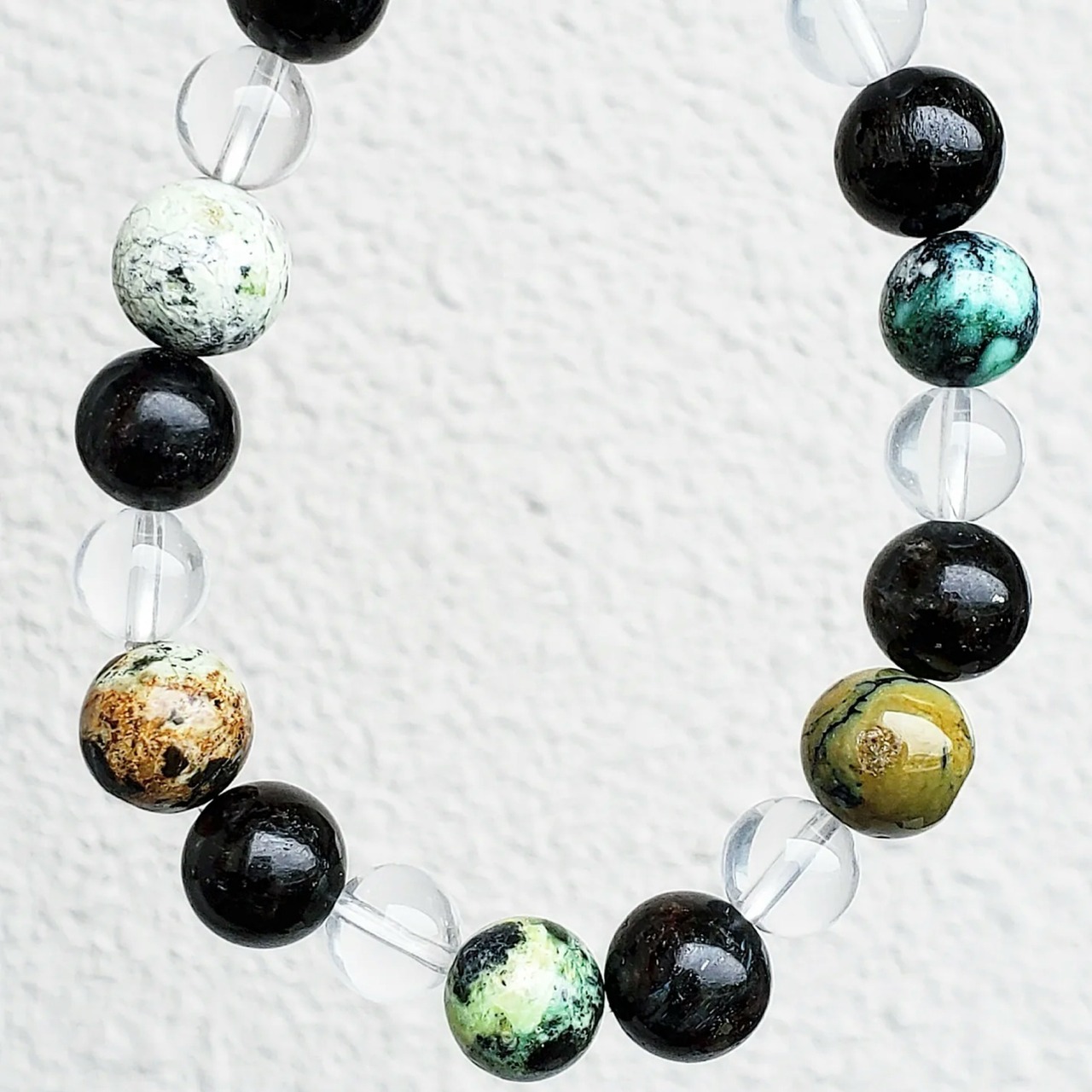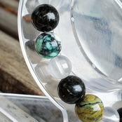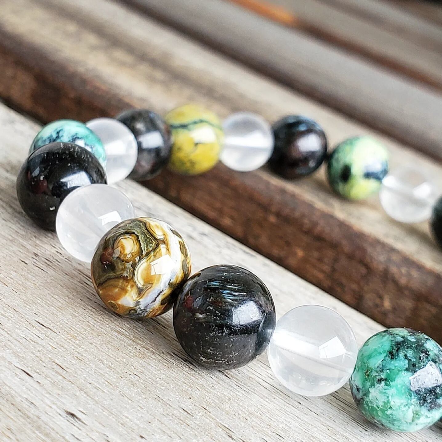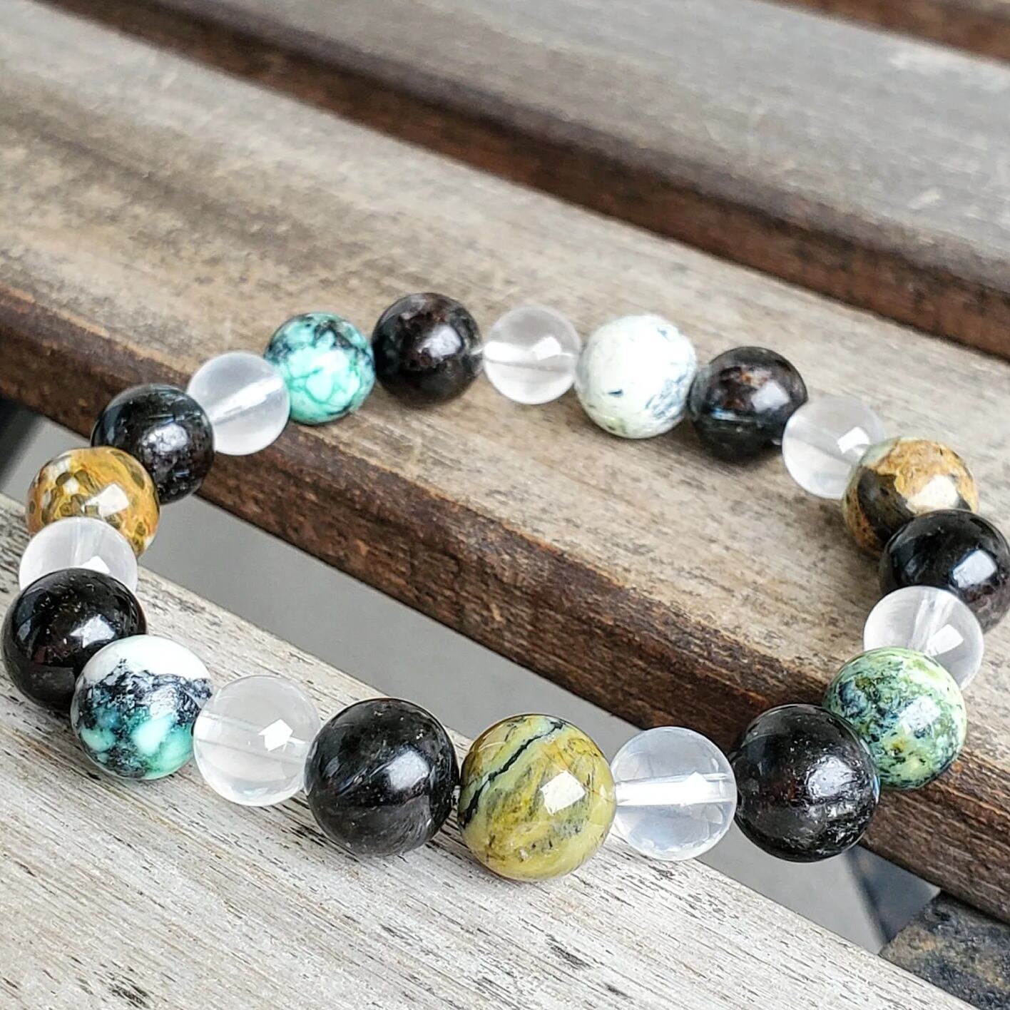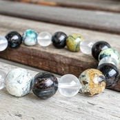 少々ヤンチャなバリサイトを、落ち着きのある太古の石ヌーマイトと優しい波動のムーンクォーツで包んだブレスレットです