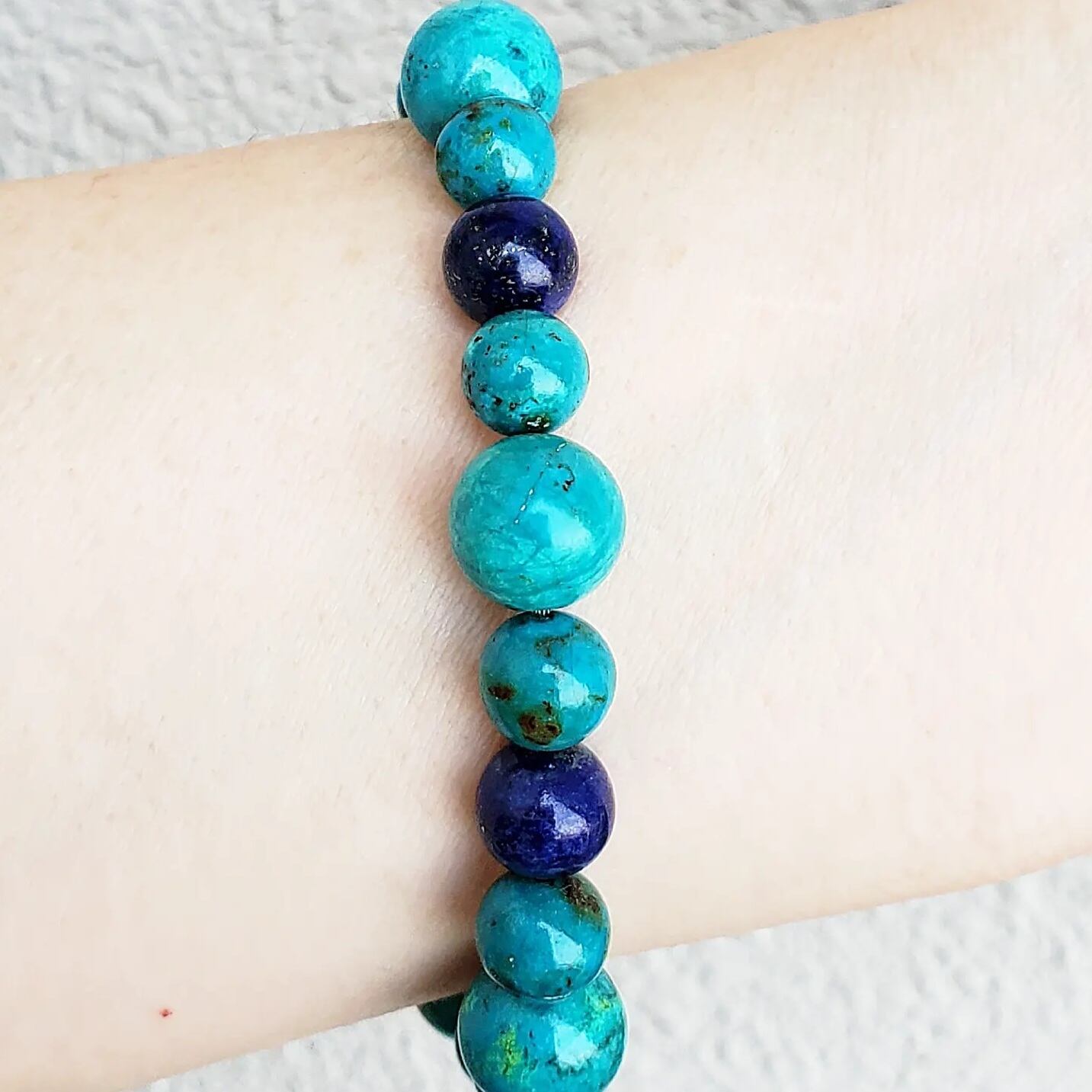 アズライトやマラカイト、ターコイズ、銅等と混ざり合うため、色々な個性を楽しめる石です