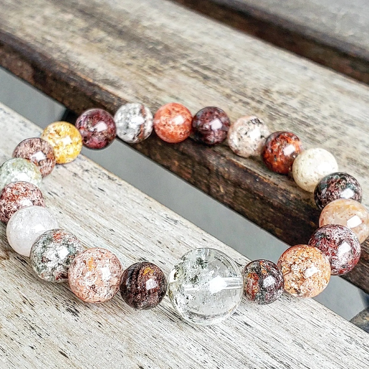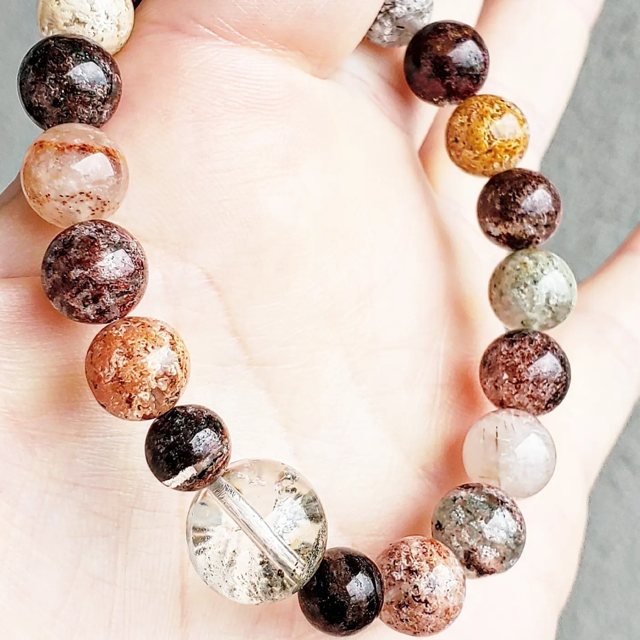 ブラウンやグリーンの鉱物(クローライト等)を取り込んで成長した、粒それぞれの色も内包物も様々で個性的な水晶です