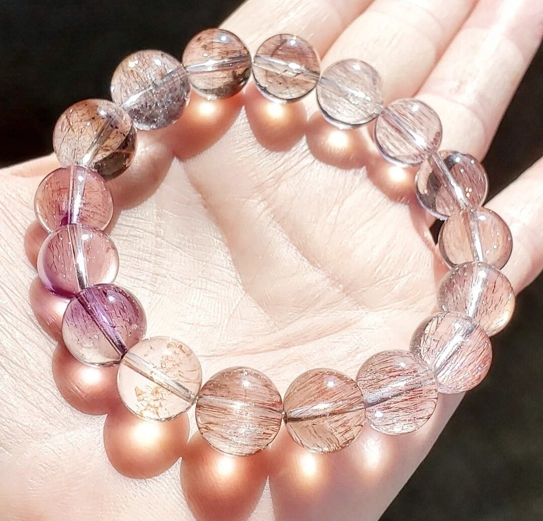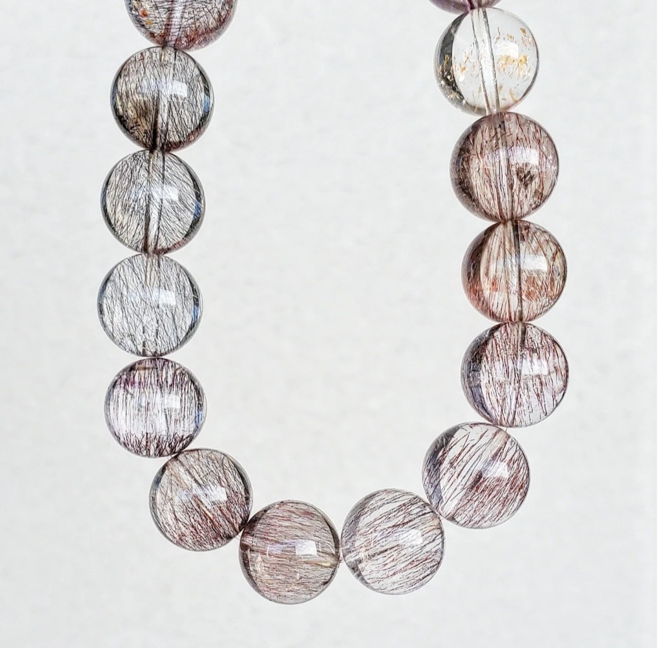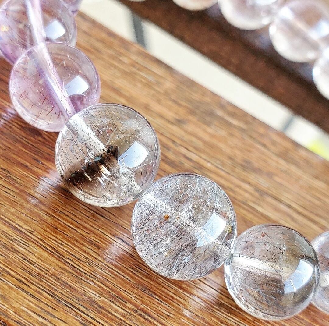 (スーパーセブンの原石は、水晶・アメジスト・スモーキークォーツ・ルチル・ゲーサイト・レピドクロサイト・カコクセナイトの7種類の鉱物で構成されるものなのですが、一粒にすべての鉱物が入ることはほとんどありません。ご了承ください。)