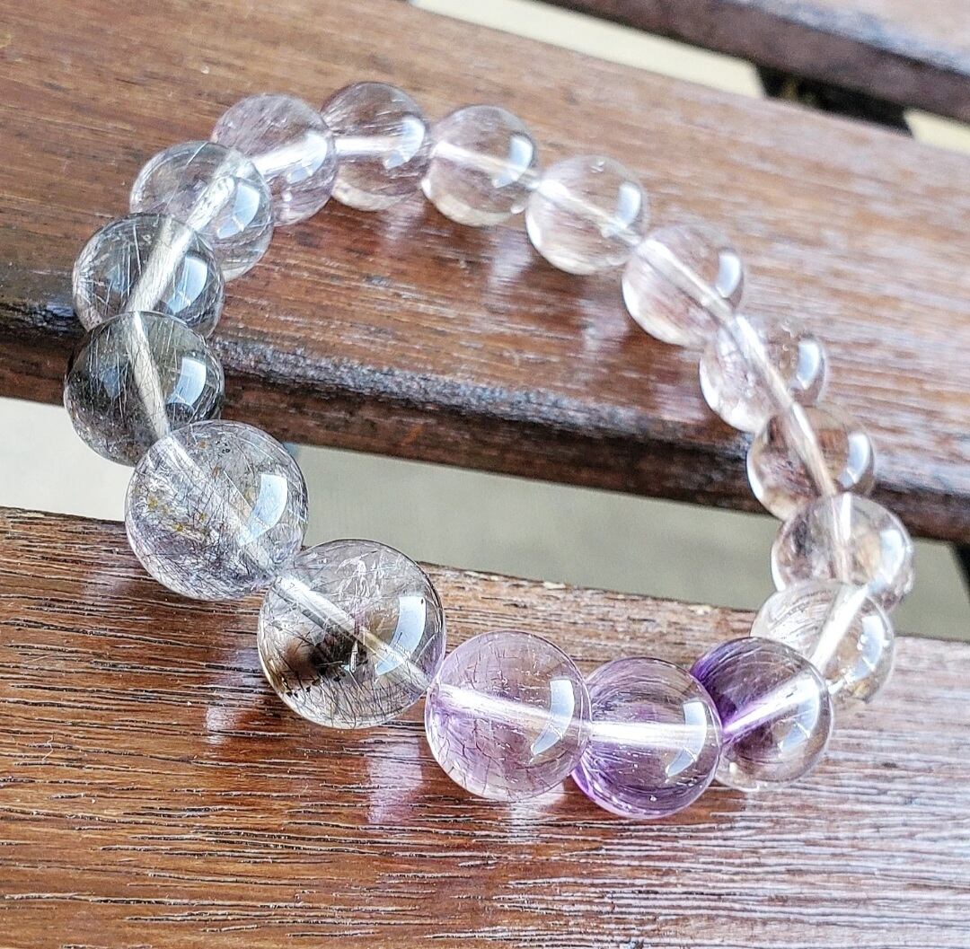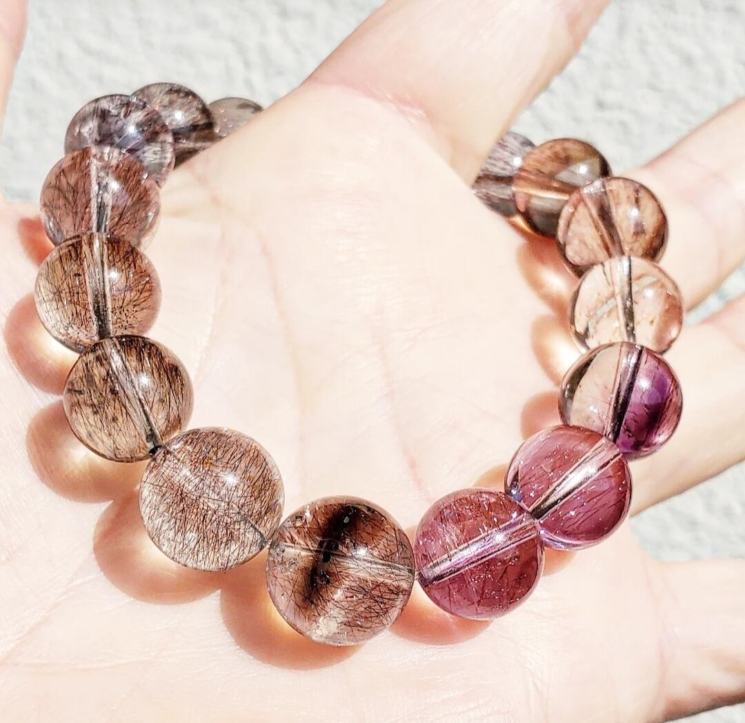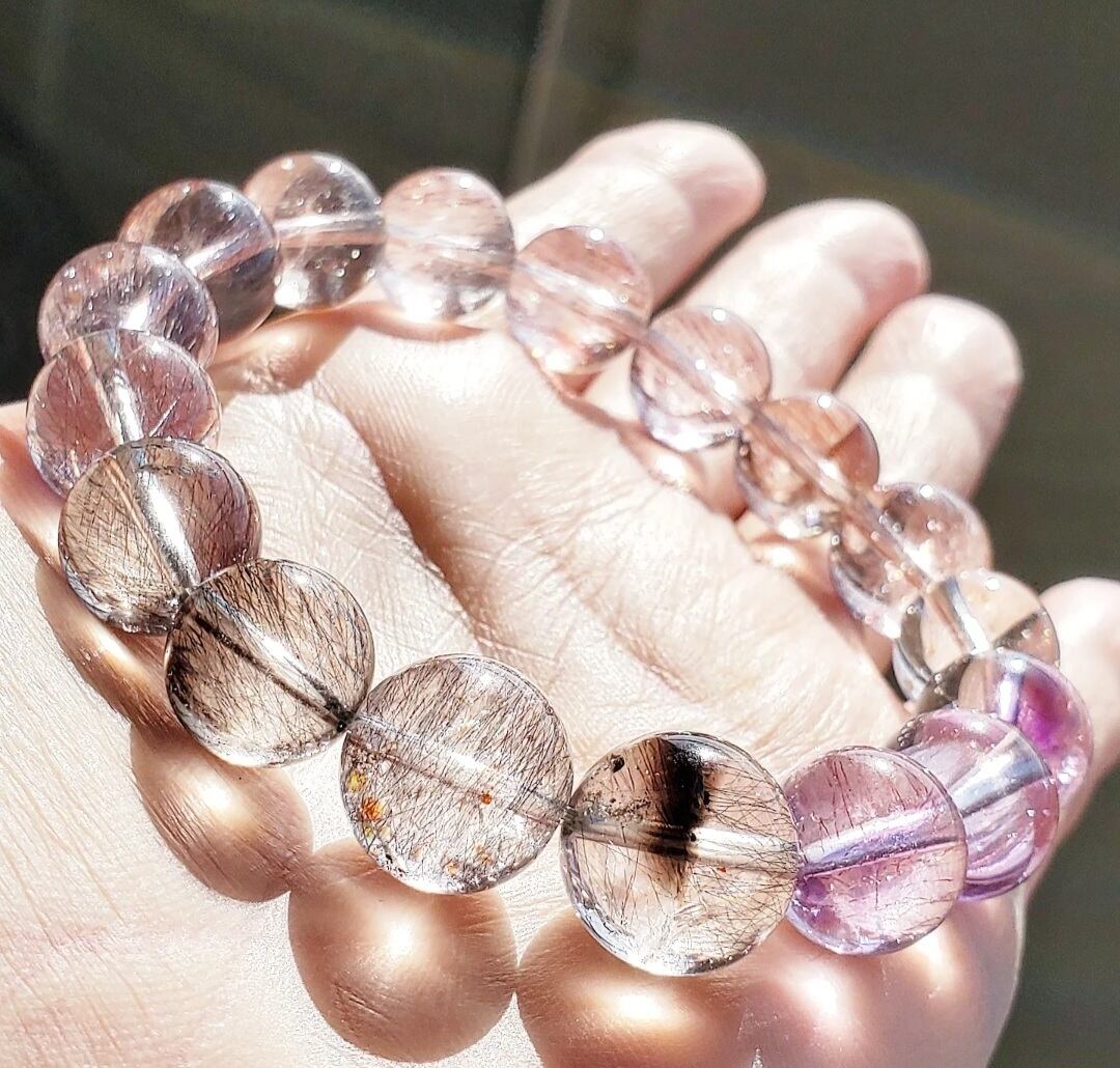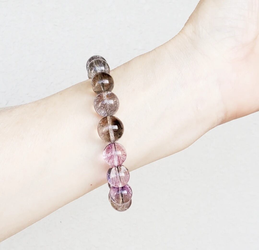 (スーパーセブンの原石は、水晶・アメジスト・スモーキークォーツ・ルチル・ゲーサイト・レピドクロサイト・カコクセナイトの7種類の鉱物で構成されるものなのですが、一粒にすべての鉱物が入ることはほとんどありません。ご了承ください。)