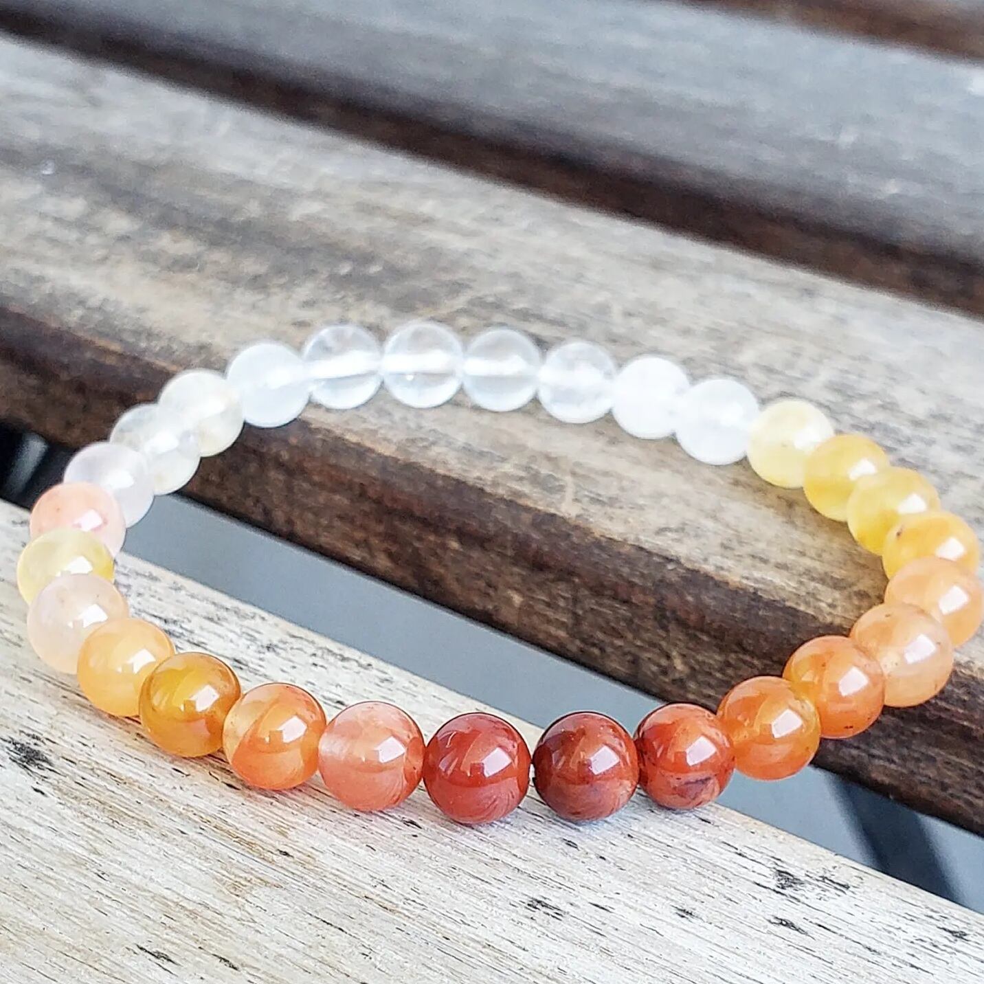 レッド、オレンジ、イエロー、ホワイト、クリアなどのラビットヘアをグラデーションで組んだブレスレットです