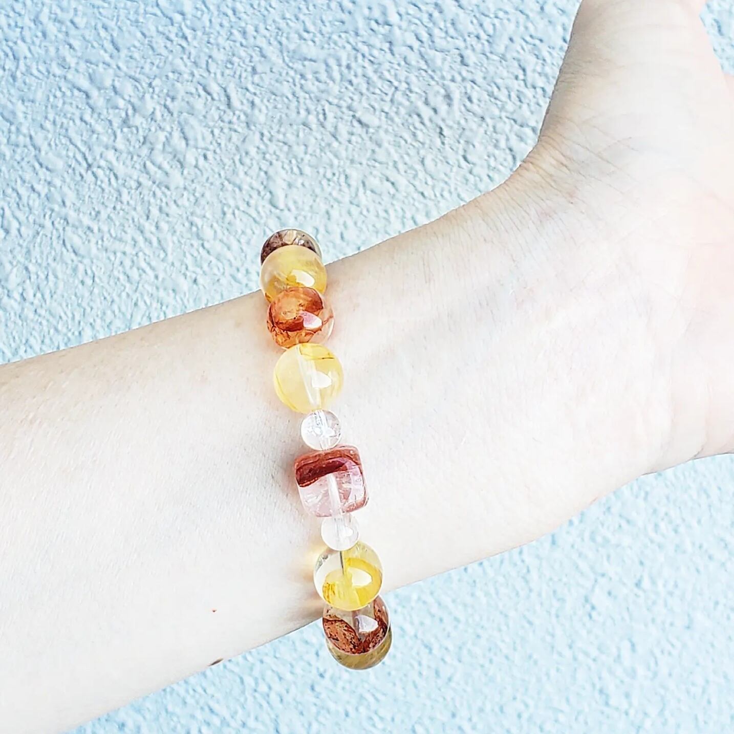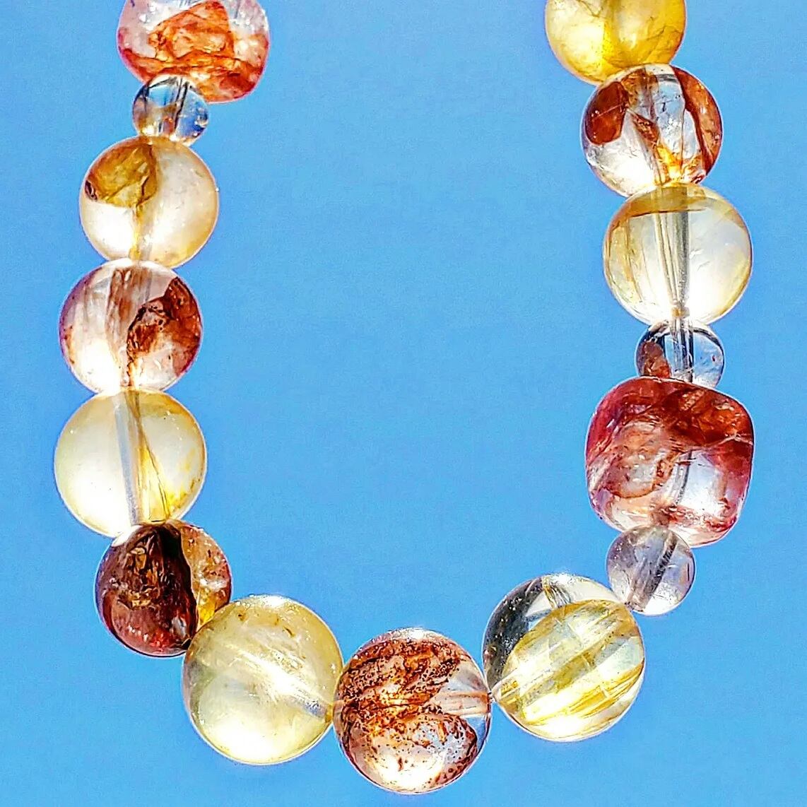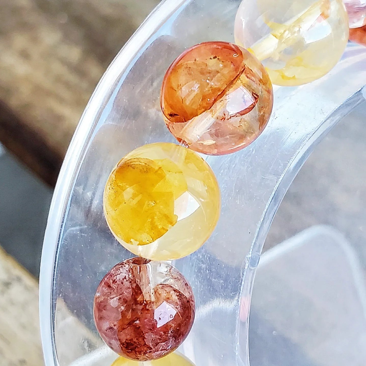 水晶の中にライモナイト(褐鉄鉱)やヘマタイト(赤鉄鉱)等が染み込み、赤色や黄色やオレンジ色の膜を作った「奇跡のクォーツ」と呼ばれる稀少な天然オーロラクォーツ(錦鯉水晶)