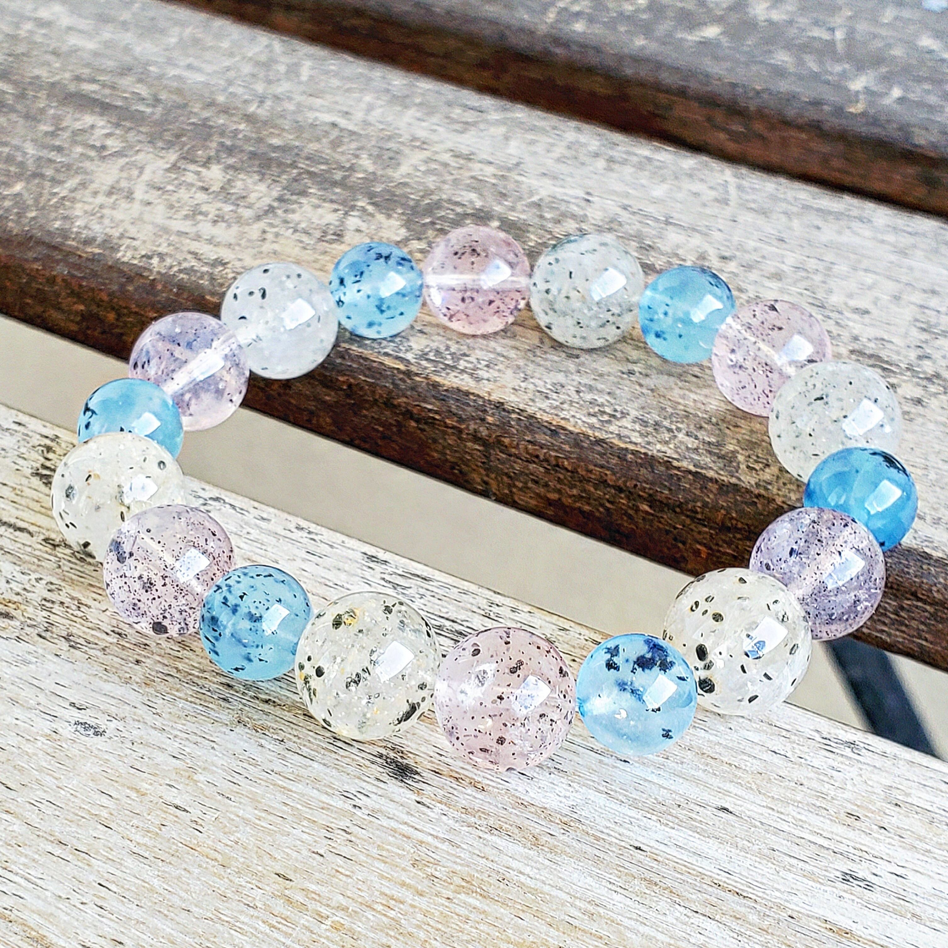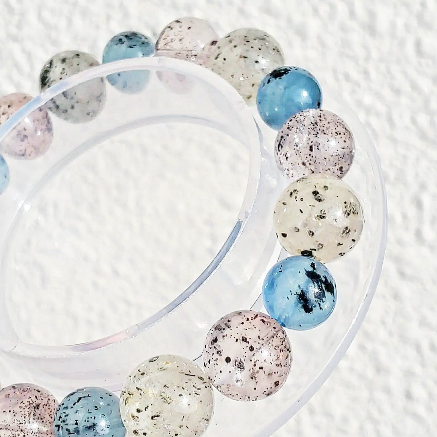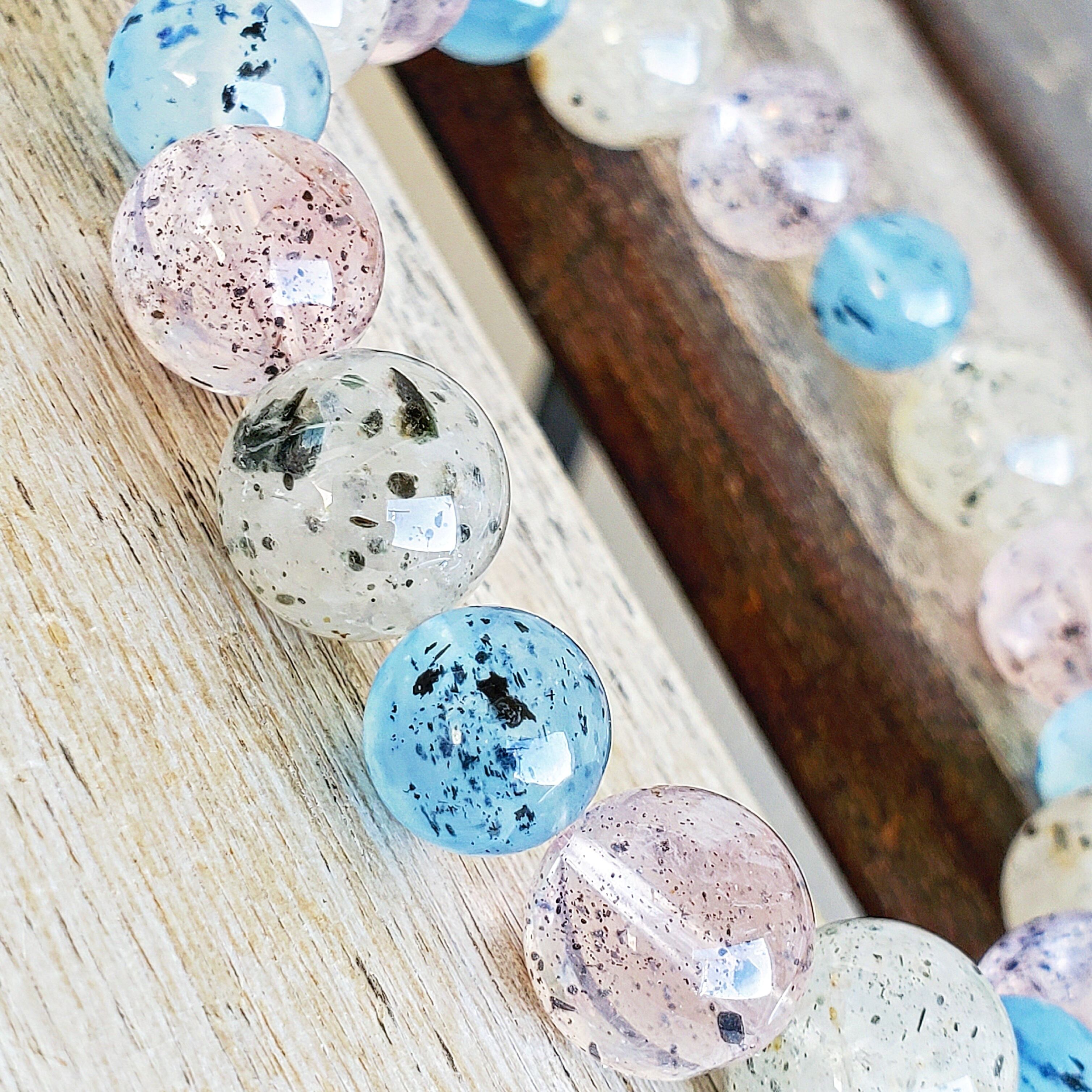 そのバイオタイトが内包されたクォーツとローズクォーツとアクアマリンで組んだ、癒しのブレスレットです