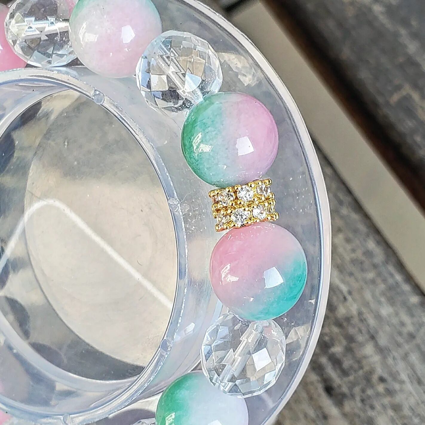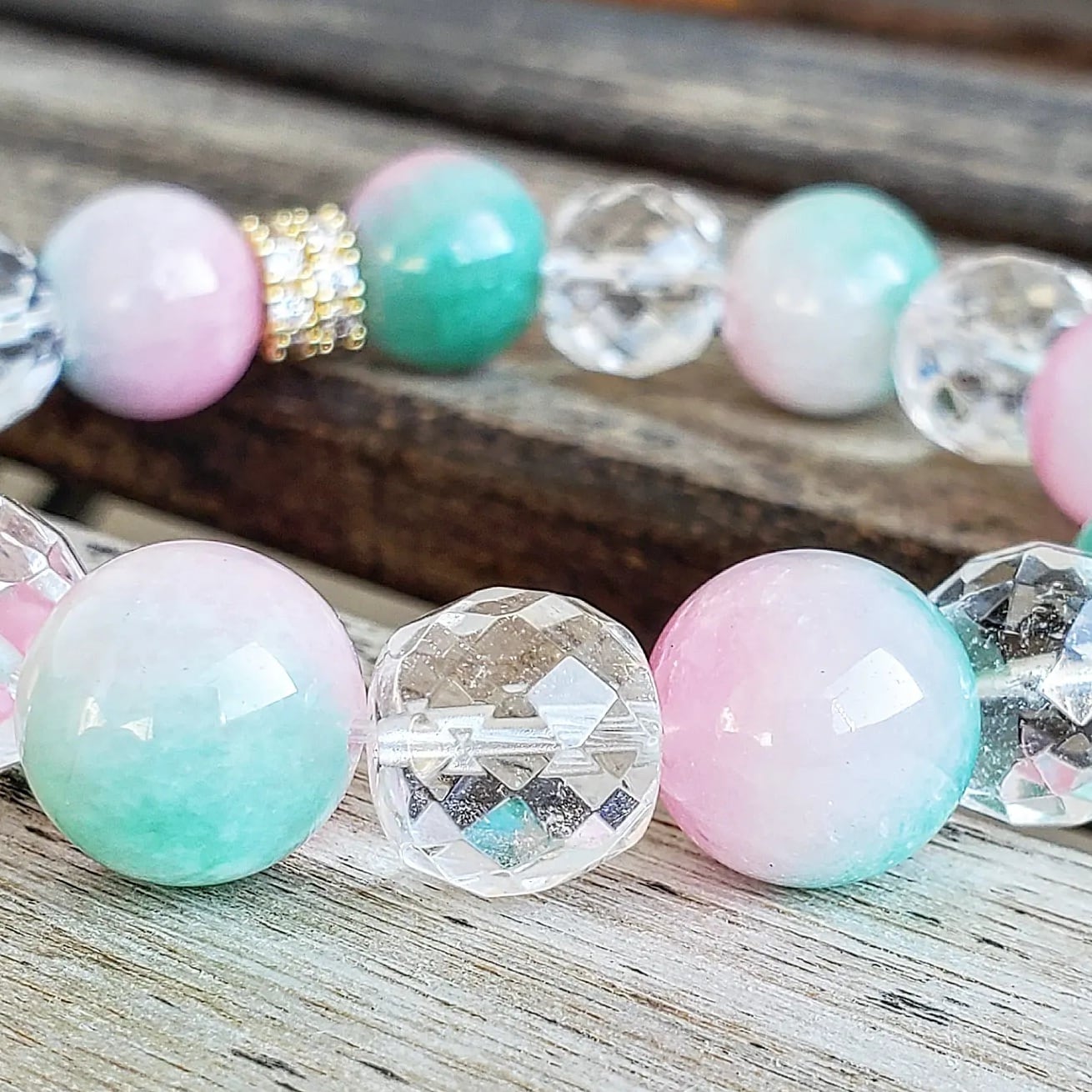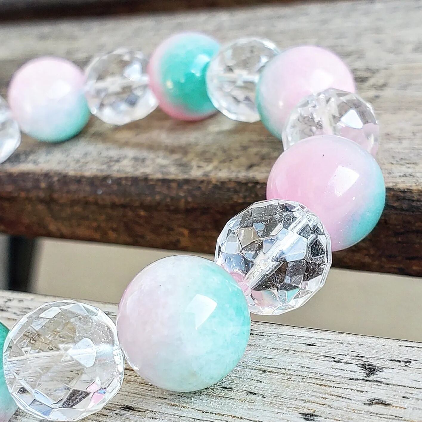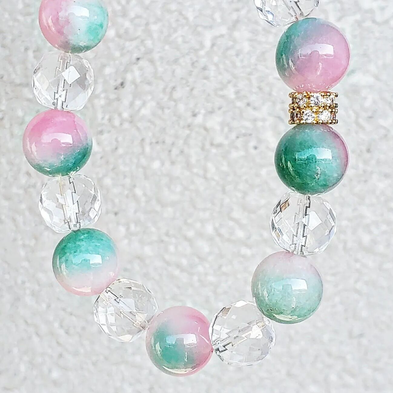 使用したカラージェイドは、ピンクカラーとグリーンカラーとホワイトカラーが混ざり合い、ピーチ(桃)を連想させる可愛いらしいお色味の、優しい癒しのブレスレットです