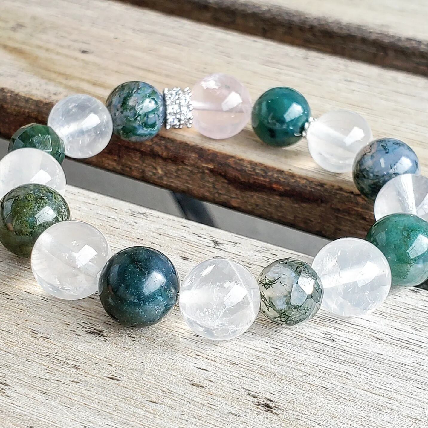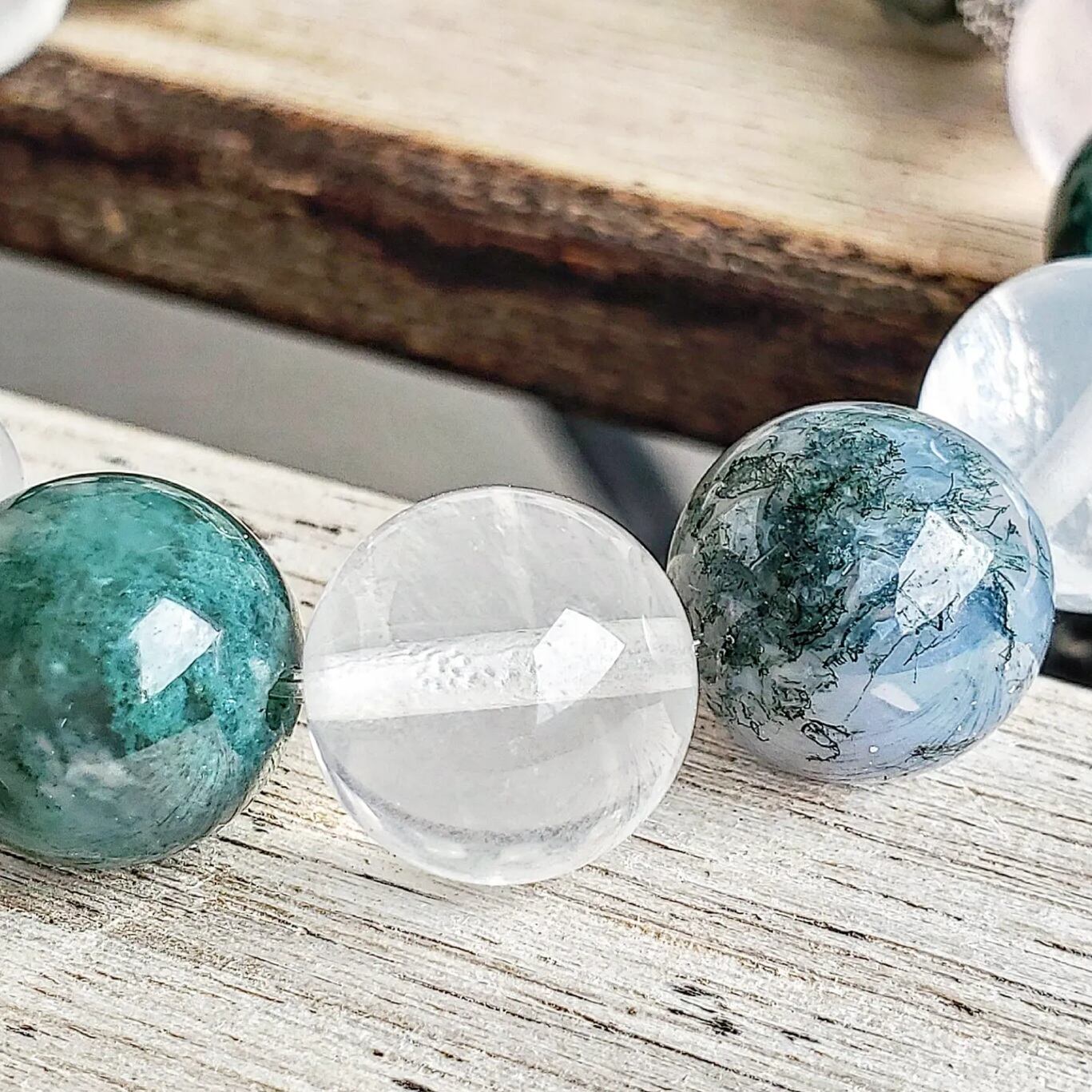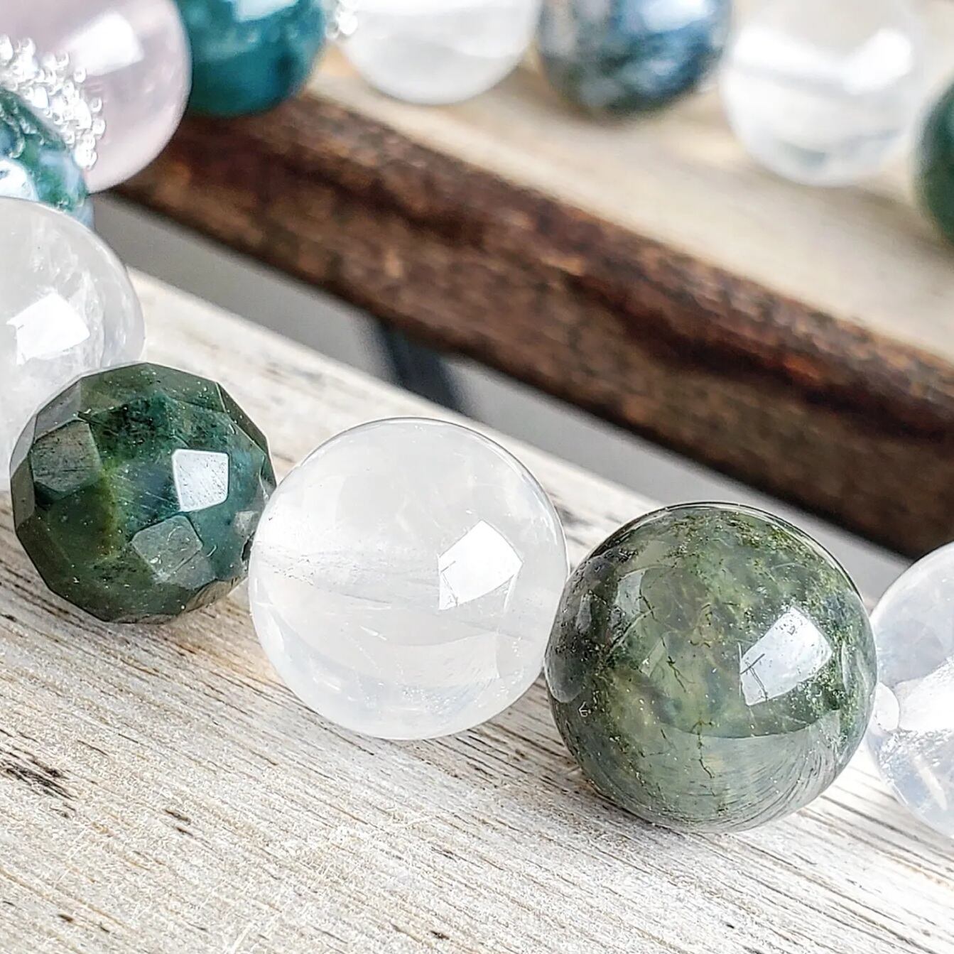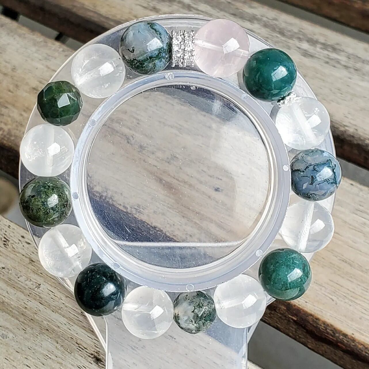 モスアゲート(苔瑪瑙)は、ホワイトやクリアなアゲート(瑪瑙)にグリーンの緑泥石や鉄やマンガンが内包され、まるで苔(モス)のように見えることから名付けられました