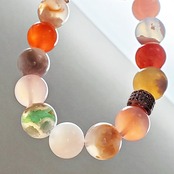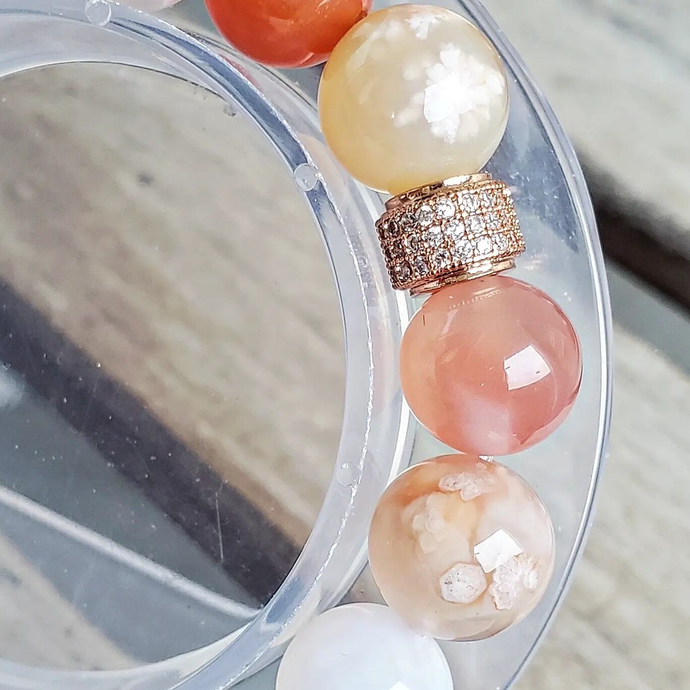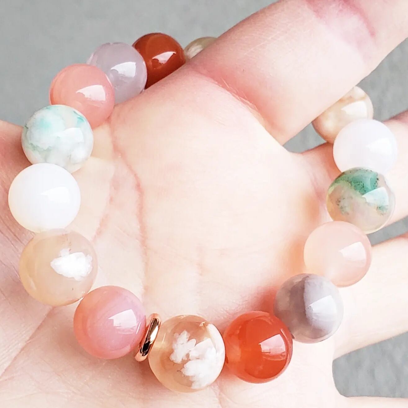 桜瑪瑙(ピンクベージュ、グレーピンク、グリーン等)と塩源瑪瑙(オレンジ、ピンク、ホワイト等)を交互に組み合わせたブレスレットです