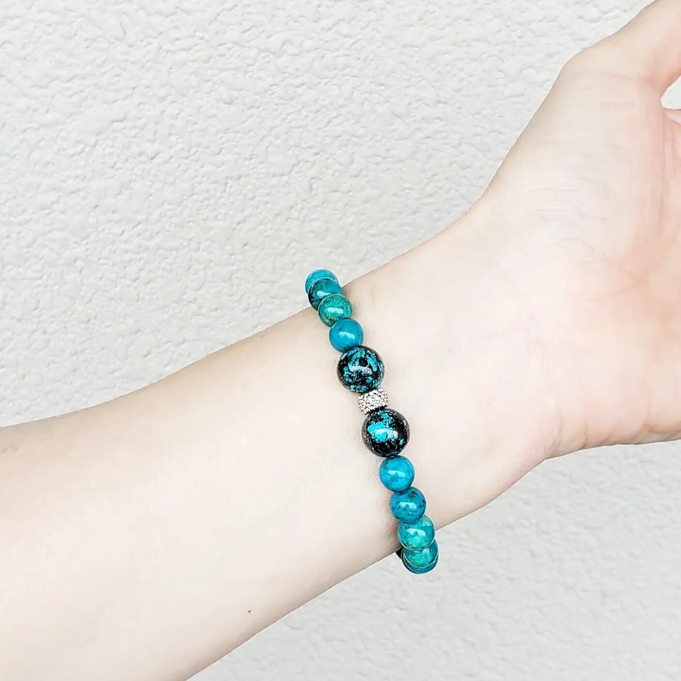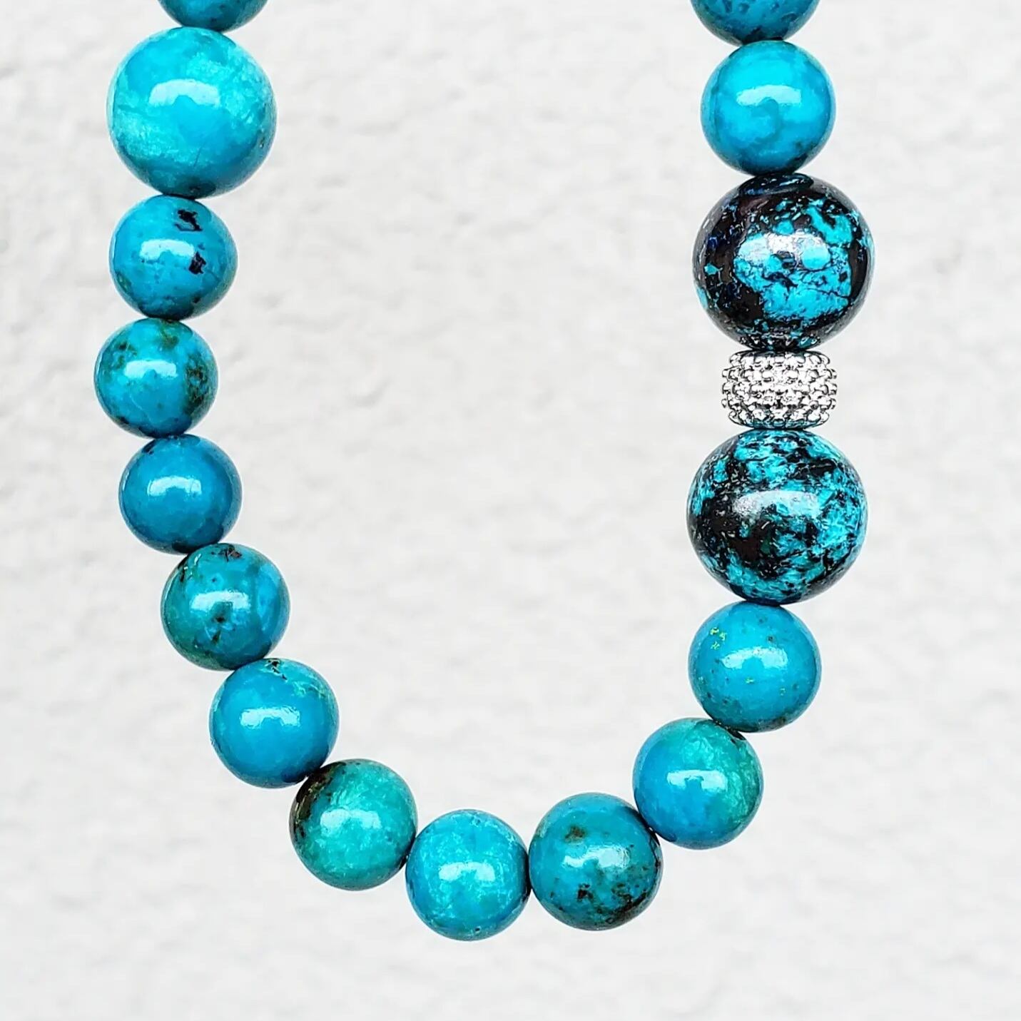 アズライトやマラカイト、ターコイズ、銅等と混ざり合うため、色々な個性を楽しめる石です