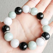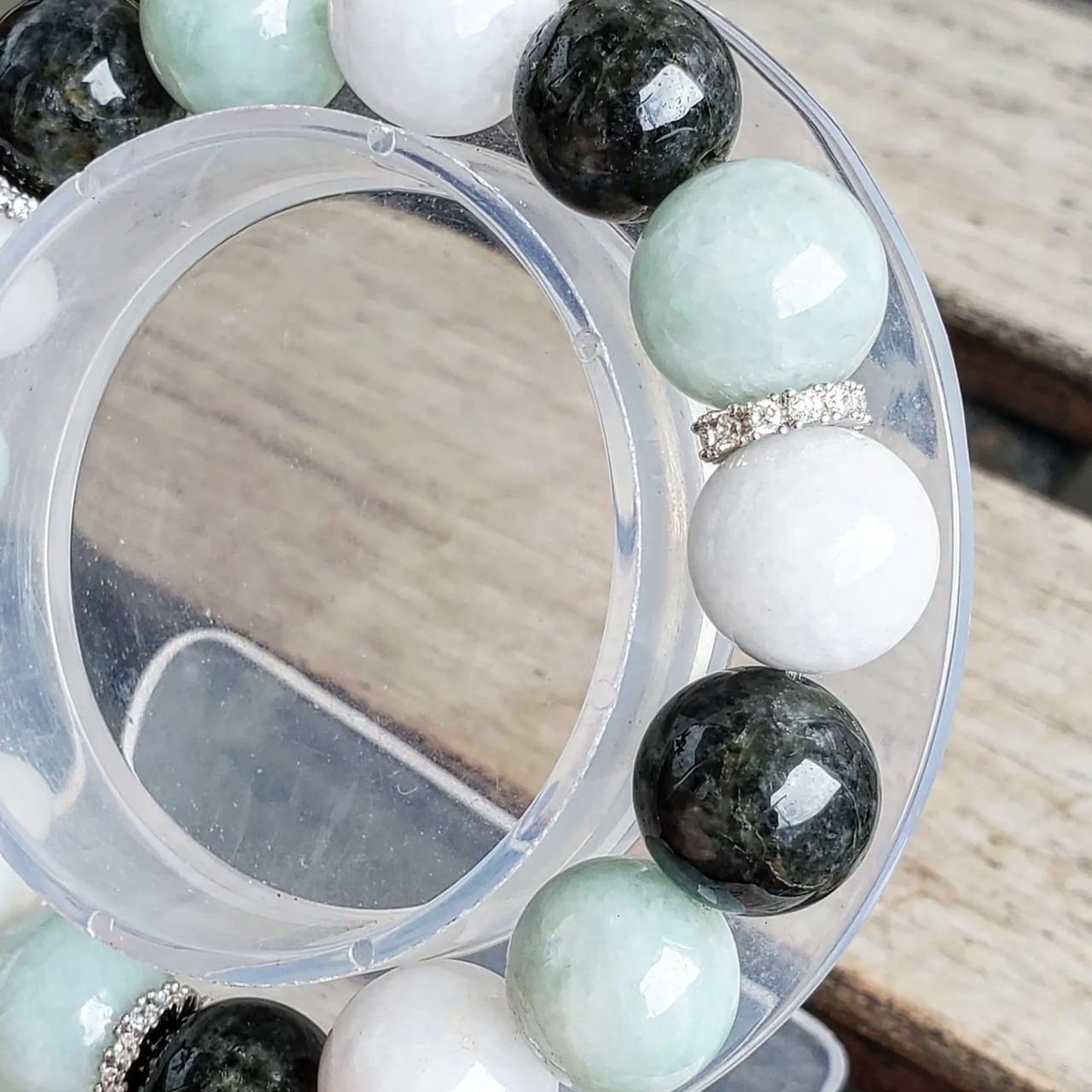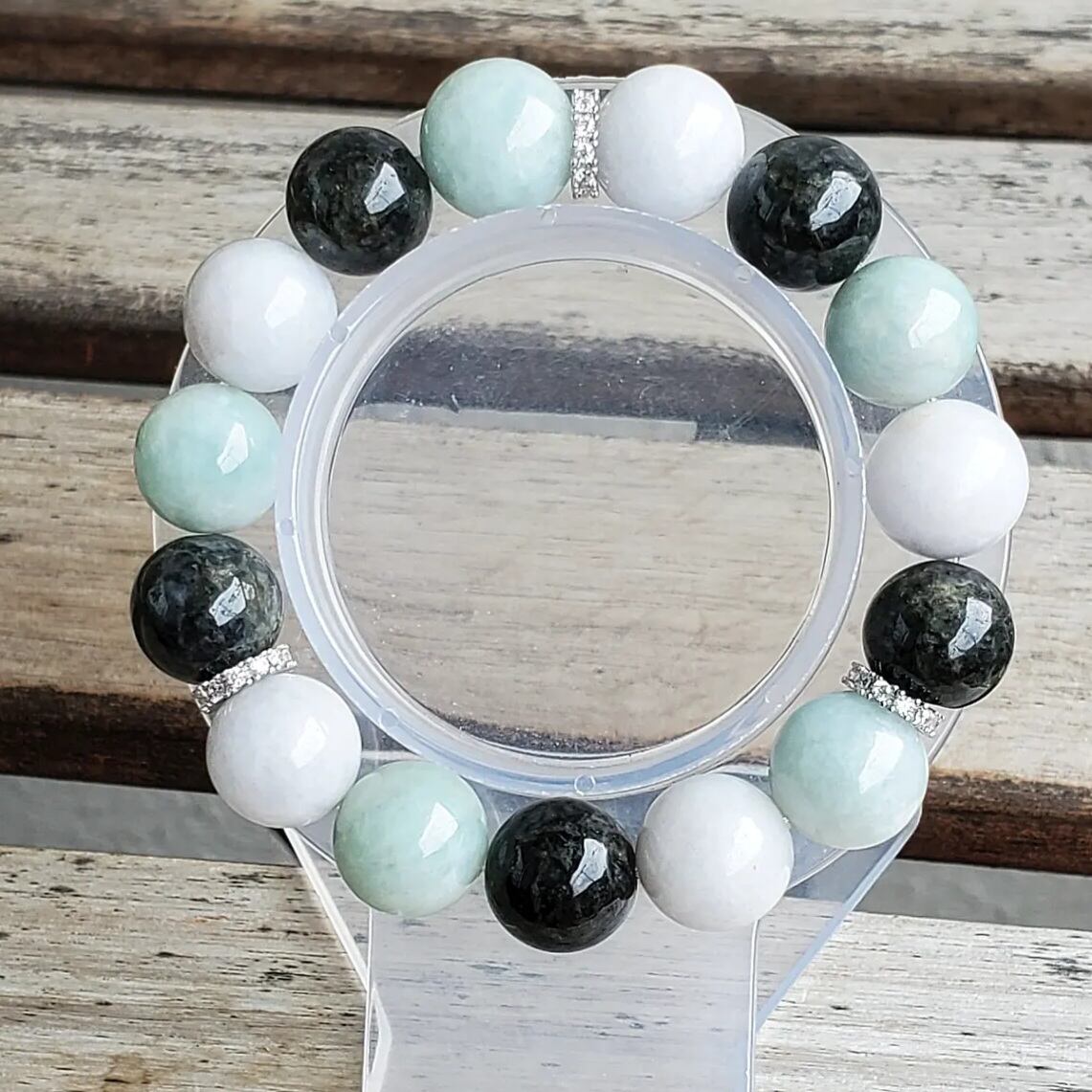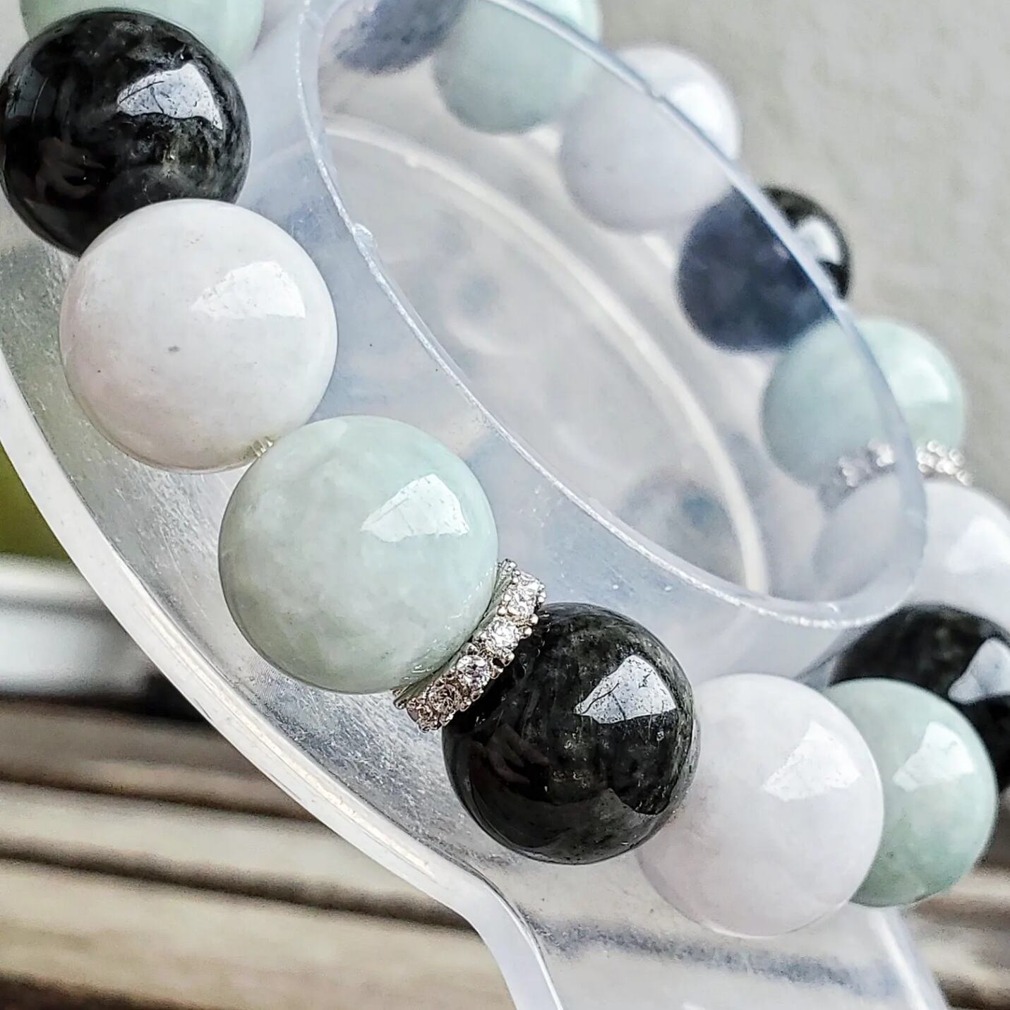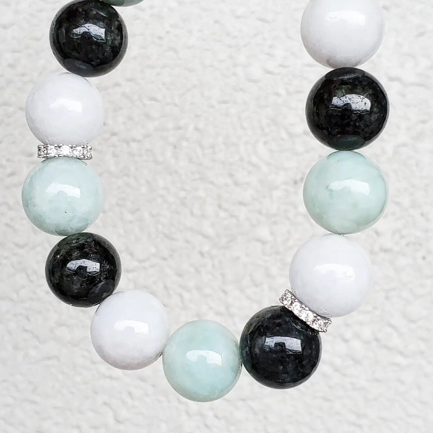 グリーンとホワイトとブラックの翡翠を合わせて組んだブレスレットです