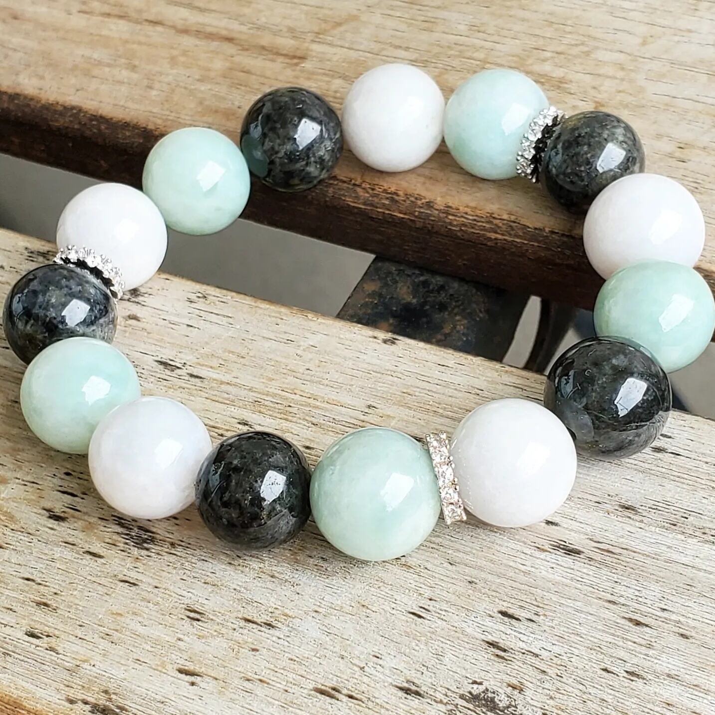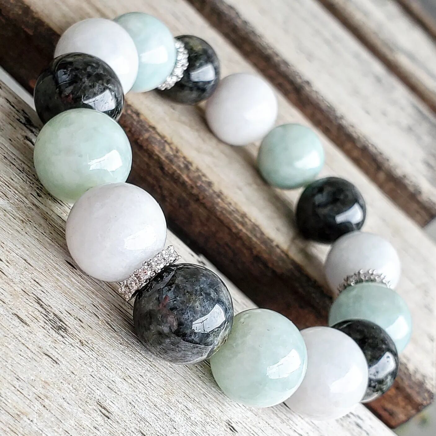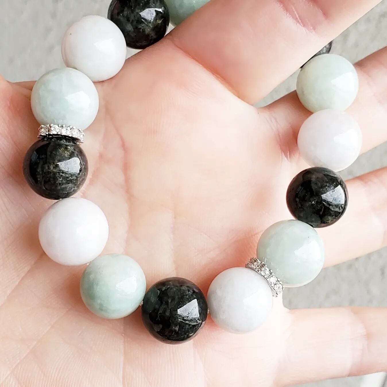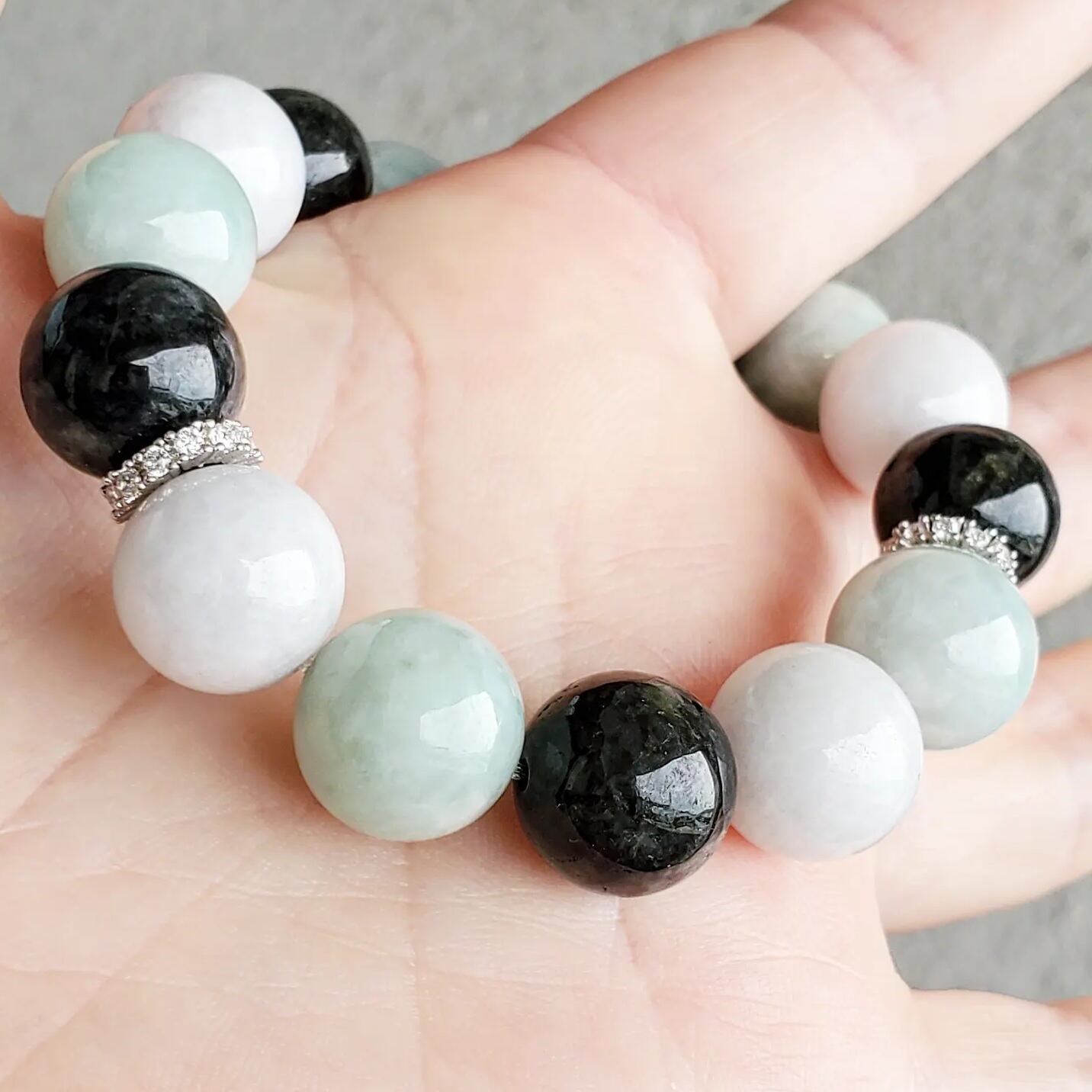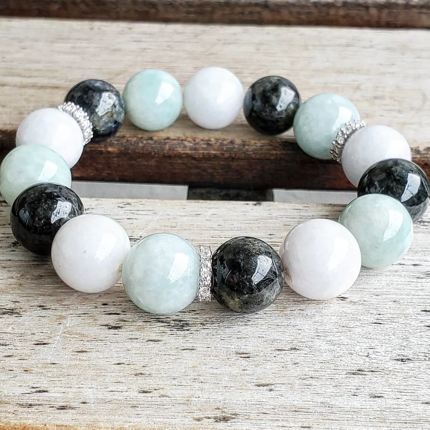 グリーンとホワイトとブラックの翡翠を合わせて組んだブレスレットです