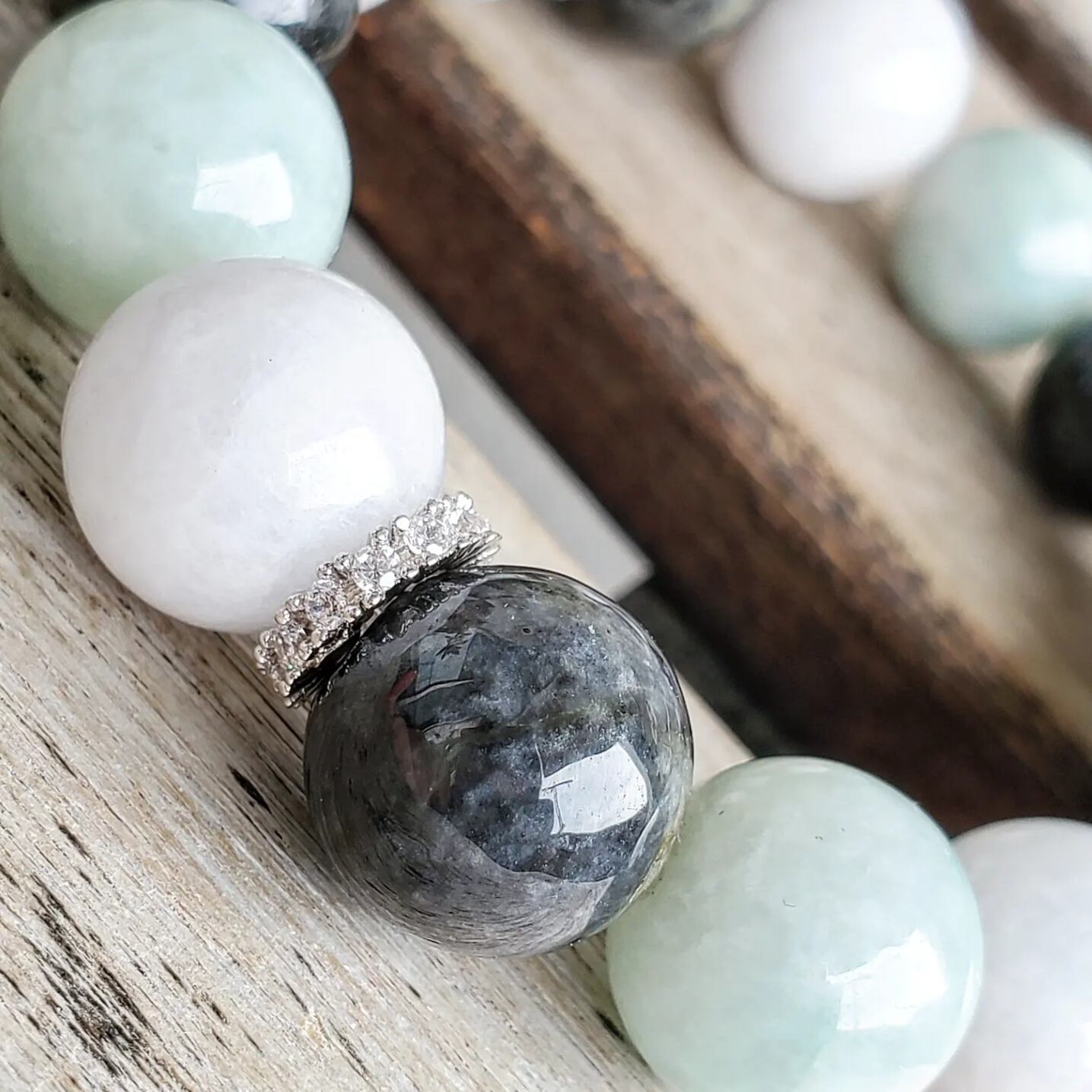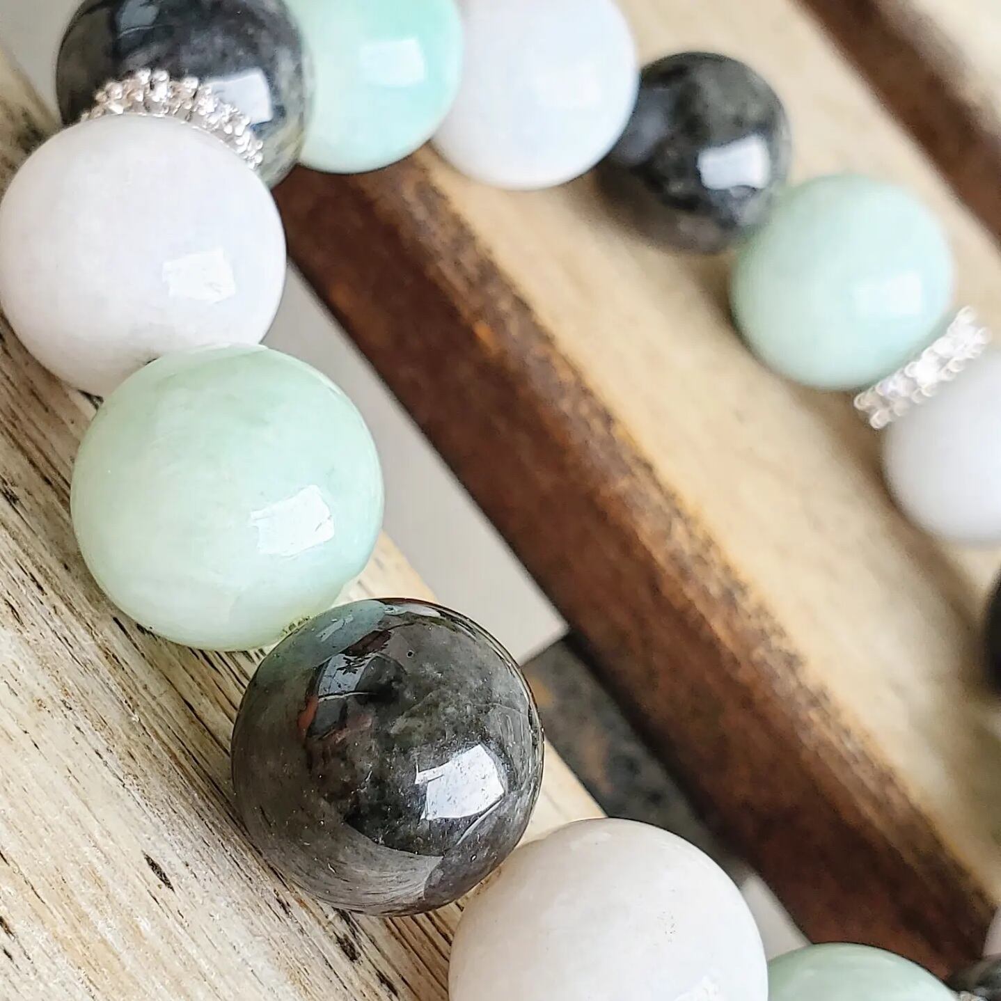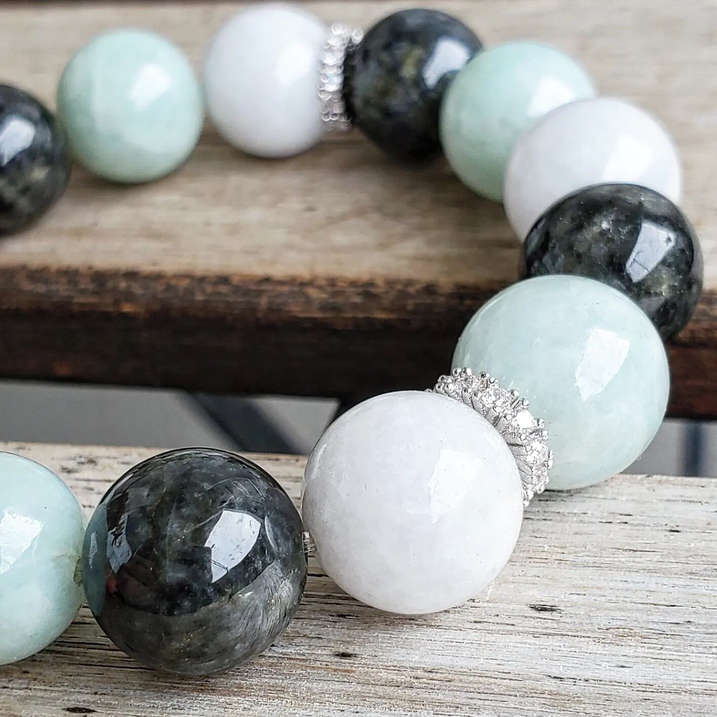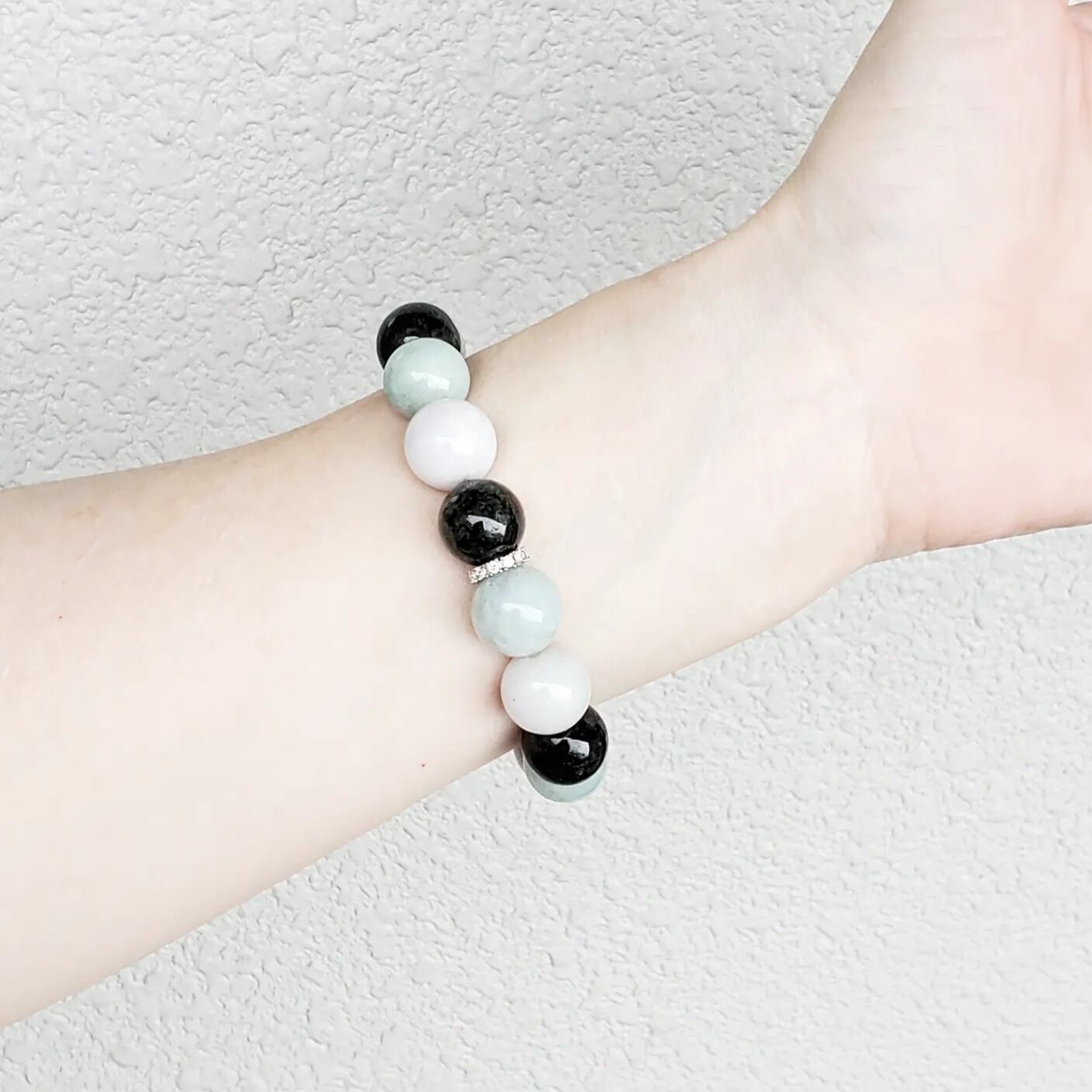 グリーンとホワイトとブラックの翡翠を合わせて組んだブレスレットです
