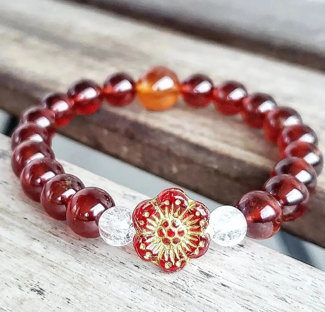 ⭐ヘソナイトガーネット&天然アイリスクォーツ&チェコガラスビーズ(レッドフラワー) のブレスレット(¥5,000)