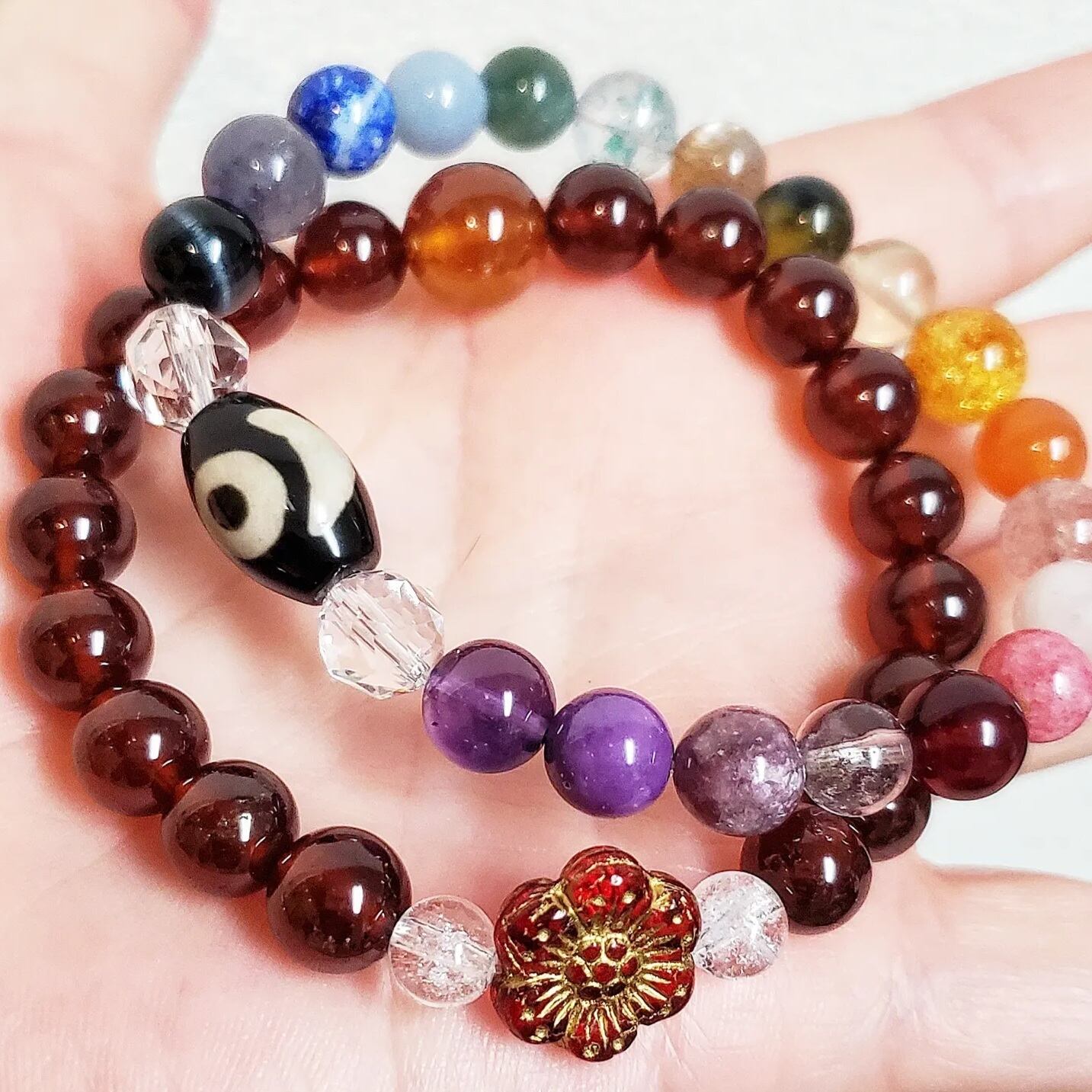 ⭐日月星(にちげつせい/ひつきぼし)天珠 & スターカット水晶 & 19種類の彩り のブレスレット(¥5,980)