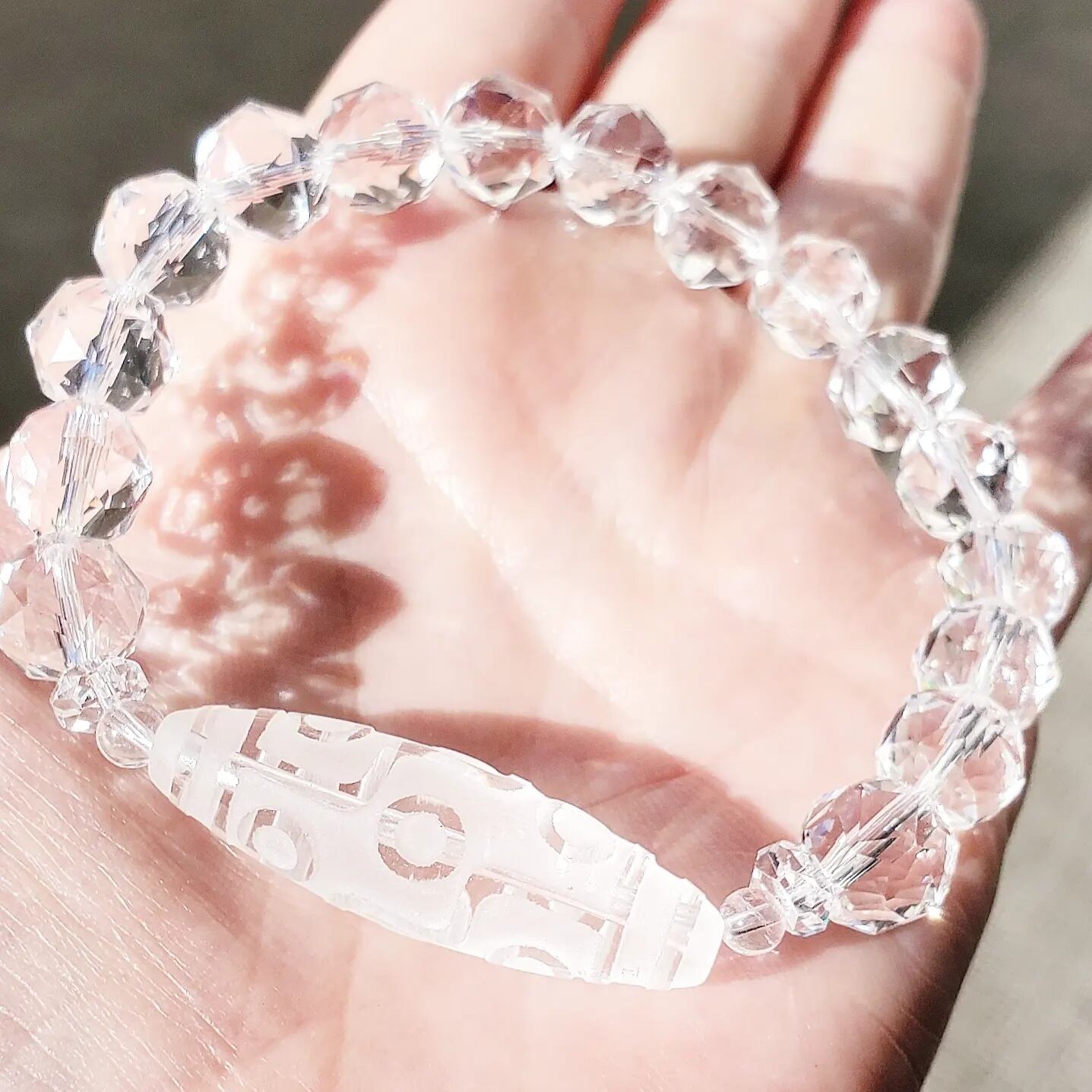 今回の天珠は、透明感の高い水晶に九眼の紋様が彫られた