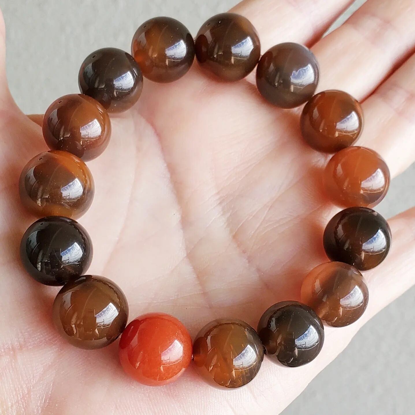 朱色の南紅瑪瑙一粒をポイントに、あとは落ち着いた渋い柿色~灰黒色の南紅瑪瑙を集めて組んだブレスレットです