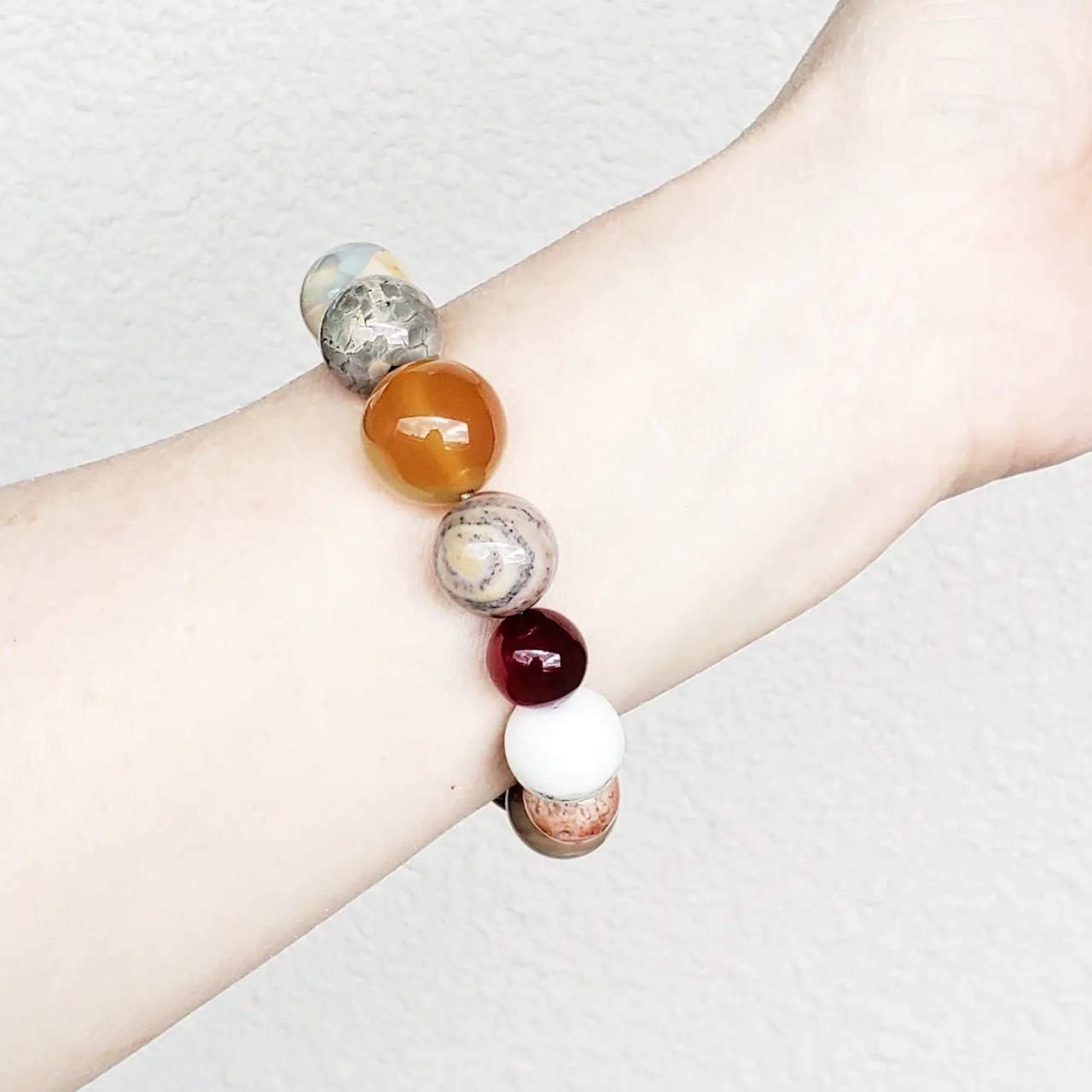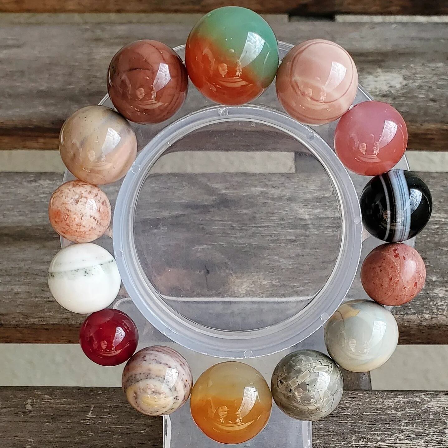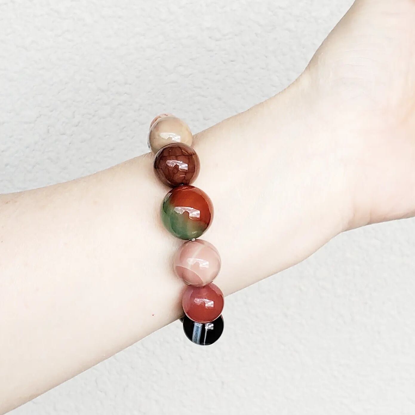 阿拉善瑪瑙(アラシャンアゲート)や塩源瑪瑙(エンゲンアゲート)や孔雀瑪瑙(ピーコックアゲート/染め)などの大玉の瑪瑙(アゲート)で組んだブレスレットです