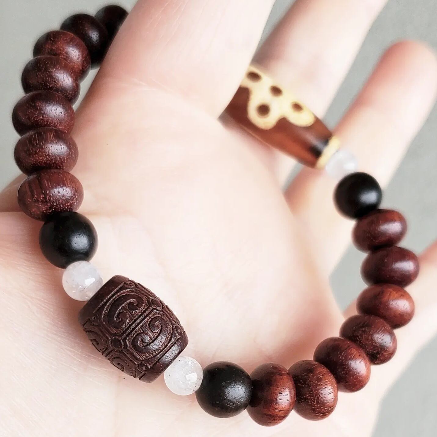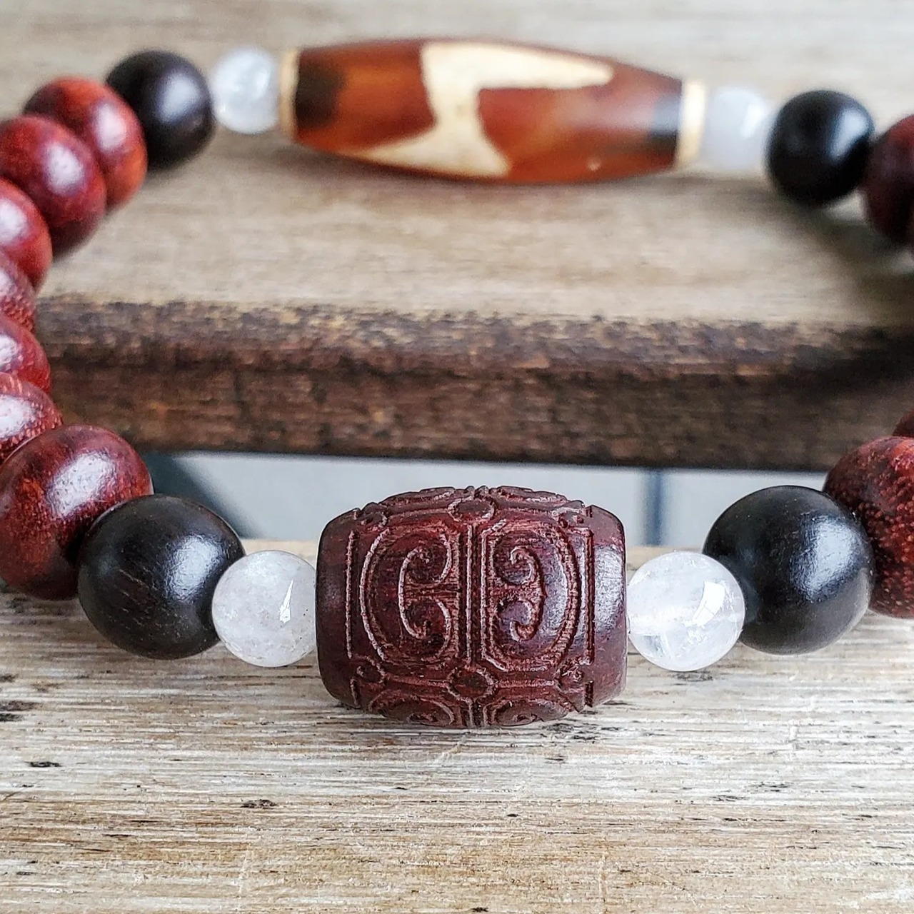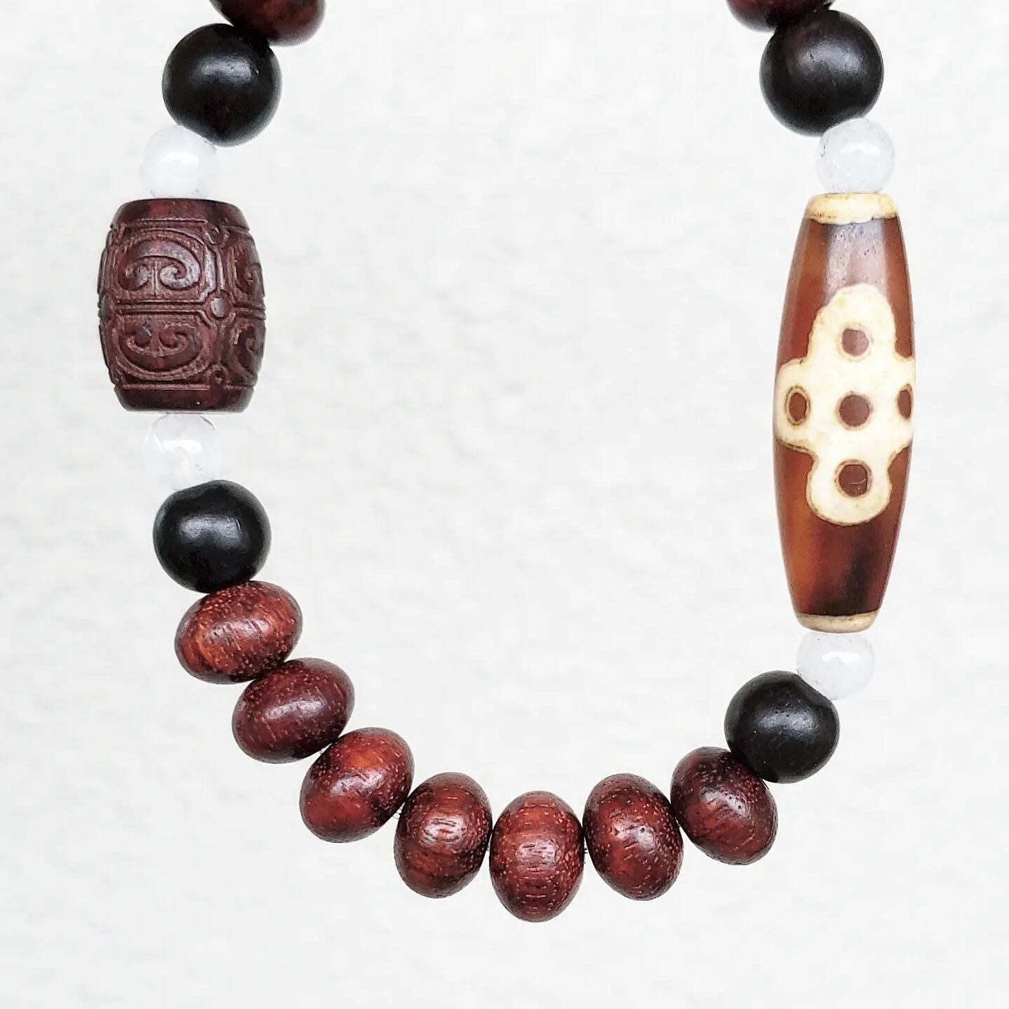 閃電五眼(せんでんごがん)天珠 & 赤檀(しゃくだん)タル型[如意彫り] & 赤檀(しゃくだん) & 黒檀(こくたん) & アイリスクォーツ