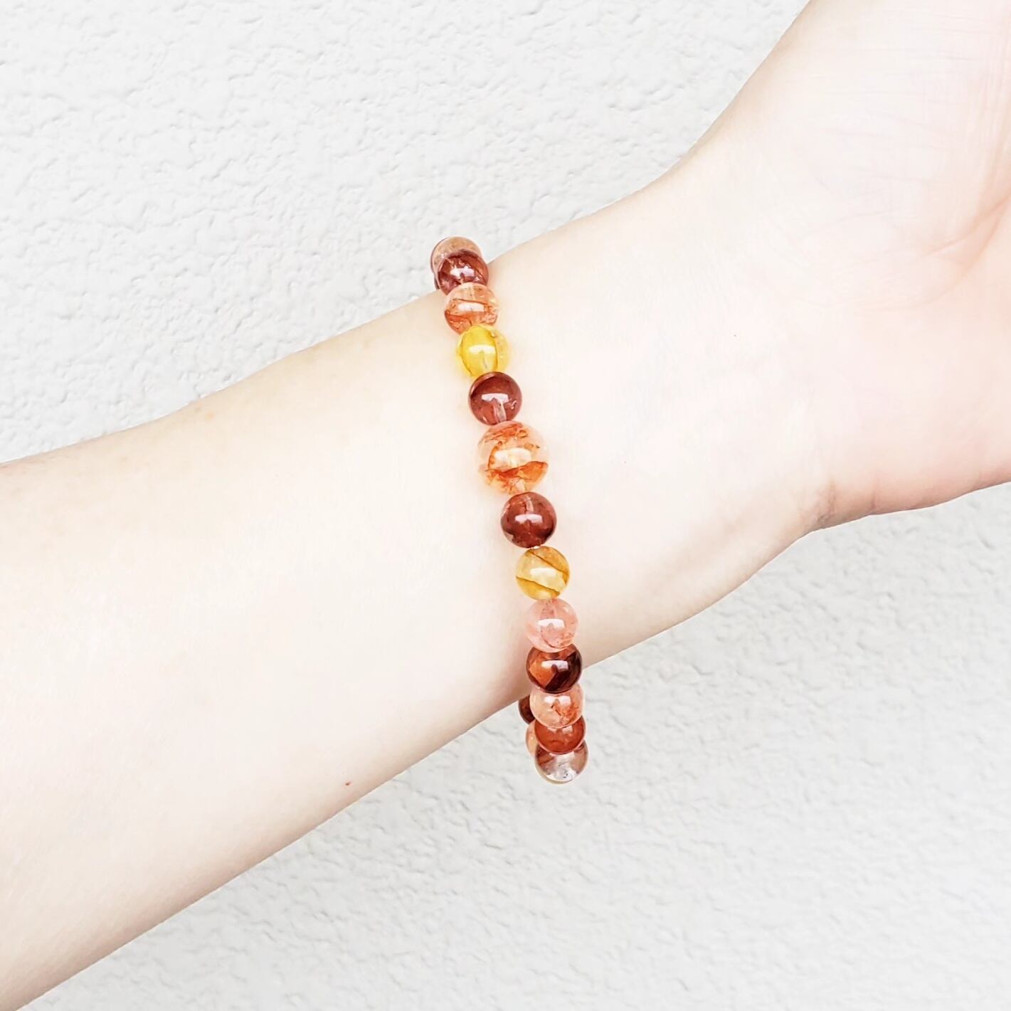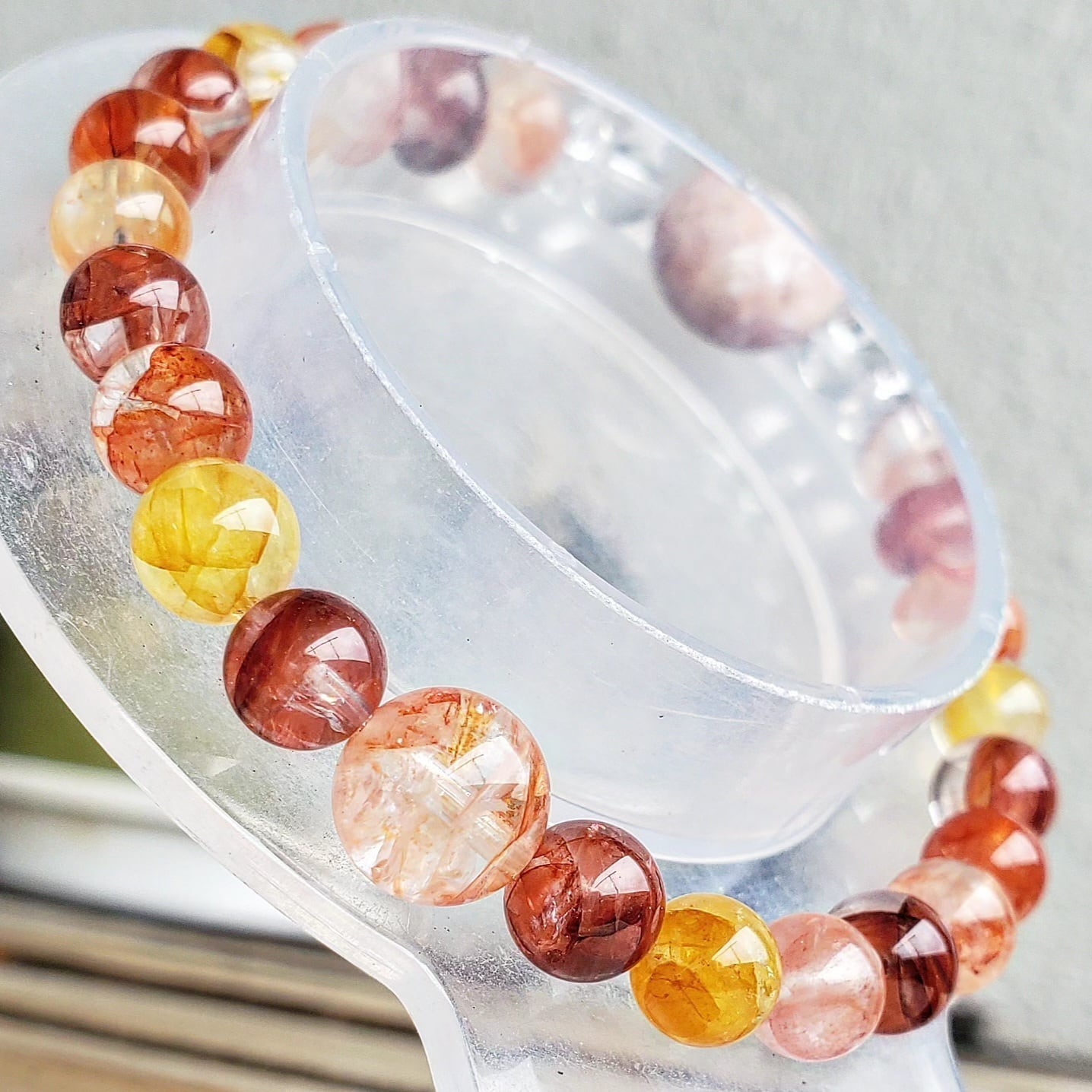 水晶の中にライモナイト(褐鉄鉱)やヘマタイト(赤鉄鉱)等が染み込み、赤色や黄色やオレンジ色の膜を作った「奇跡のクォーツ」と呼ばれる稀少な天然オーロラクォーツ(錦鯉水晶)